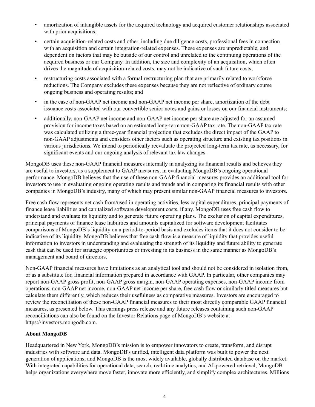 4 • amortization of intangible assets for the acquired technology and acquired customer relationships associated with prior acquisitions; • certain acquisition-related costs and other, including due diligence costs, professional fees in connection with an acquisition and certain integration-related expenses. These expenses are unpredictable, and dependent on factors that may be outside of our control and unrelated to the continuing operations of the acquired business or our Company. In addition, the size and complexity of an acquisition, which often drives the magnitude of acquisition-related costs, may not be indicative of such future costs; • restructuring costs associated with a formal restructuring plan that are primarily related to workforce reductions. The Company excludes these expenses because they are not reflective of ordinary course ongoing business and operating results; and • in the case of non-GAAP net income and non-GAAP net income per share, amortization of the debt issuance costs associated with our convertible senior notes and gains or losses on our financial instruments; • additionally, non-GAAP net income and non-GAAP net income per share are adjusted for an assumed provision for income taxes based on an estimated long-term non-GAAP tax rate. The non-GAAP tax rate was calculated utilizing a three-year financial projection that excludes the direct impact of the GAAP to non-GAAP adjustments and considers other factors such as operating structure and existing tax positions in various jurisdictions. We intend to periodically reevaluate the projected long-term tax rate, as necessary, for significant events and our ongoing analysis of relevant tax law changes. MongoDB uses these non-GAAP financial measures internally in analyzing its financial results and believes they are useful to investors, as a supplement to GAAP measures, in evaluating MongoDB’s ongoing operational performance. MongoDB believes that the use of these non-GAAP financial measures provides an additional tool for investors to use in evaluating ongoing operating results and trends and in comparing its financial results with other companies in MongoDB’s industry, many of which may present similar non-GAAP financial measures to investors. Free cash flow represents net cash from/used in operating activities, less capital expenditures, principal payments of finance lease liabilities and capitalized software development costs, if any. MongoDB uses free cash flow to understand and evaluate its liquidity and to generate future operating plans. The exclusion of capital expenditures, principal payments of finance lease liabilities and amounts capitalized for software development facilitates comparisons of MongoDB’s liquidity on a period-to-period basis and excludes items that it does not consider to be indicative of its liquidity. MongoDB believes that free cash flow is a measure of liquidity that provides useful information to investors in understanding and evaluating the strength of its liquidity and future ability to generate cash that can be used for strategic opportunities or investing in its business in the same manner as MongoDB’s management and board of directors. Non-GAAP financial measures have limitations as an analytical tool and should not be considered in isolation from, or as a substitute for, financial information prepared in accordance with GAAP. In particular, other companies may report non-GAAP gross profit, non-GAAP gross margin, non-GAAP operating expenses, non-GAAP income from operations, non-GAAP net income, non-GAAP net income per share, free cash flow or similarly titled measures but calculate them differently, which reduces their usefulness as comparative measures. Investors are encouraged to review the reconciliation of these non-GAAP financial measures to their most directly comparable GAAP financial measures, as presented below. This earnings press release and any future releases containing such non-GAAP reconciliations can also be found on the Investor Relations page of MongoDB’s website at https://investors.mongodb.com. About MongoDB Headquartered in New York, MongoDB’s mission is to empower innovators to create, transform, and disrupt industries with software and data. MongoDB's unified, intelligent data platform was built to power the next generation of applications, and MongoDB is the most widely available, globally distributed database on the market. With integrated capabilities for operational data, search, real-time analytics, and AI-powered retrieval, MongoDB helps organizations everywhere move faster, innovate more efficiently, and simplify complex architectures. Millions