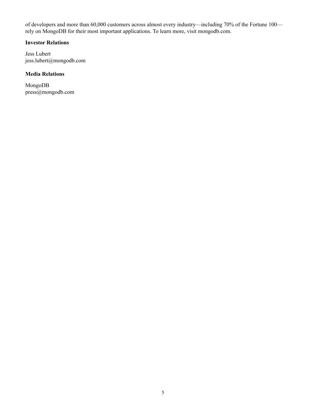 5 of developers and more than 60,000 customers across almost every industry—including 70% of the Fortune 100— rely on MongoDB for their most important applications. To learn more, visit mongodb.com. Investor Relations Jess Lubert jess.lubert@mongodb.com Media Relations MongoDB press@mongodb.com