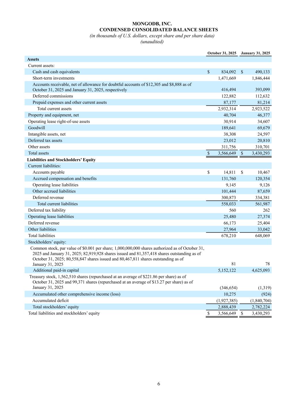 6 MONGODB, INC. CONDENSED CONSOLIDATED BALANCE SHEETS (in thousands of U.S. dollars, except share and per share data) (unaudited) October 31, 2025 January 31, 2025 Assets Current assets: Cash and cash equivalents $ 834,092 $ 490,133 Short-term investments 1,471,669 1,846,444 Accounts receivable, net of allowance for doubtful accounts of $12,305 and $8,888 as of October 31, 2025 and January 31, 2025, respectively 416,494 393,099 Deferred commissions 122,882 112,632 Prepaid expenses and other current assets 87,177 81,214 Total current assets 2,932,314 2,923,522 Property and equipment, net 40,704 46,377 Operating lease right-of-use assets 30,914 34,607 Goodwill 189,641 69,679 Intangible assets, net 38,308 24,597 Deferred tax assets 23,012 20,810 Other assets 311,756 310,701 Total assets $ 3,566,649 $ 3,430,293 Liabilities and Stockholders’ Equity Current liabilities: Accounts payable $ 14,811 $ 10,467 Accrued compensation and benefits 131,760 120,354 Operating lease liabilities 9,145 9,126 Other accrued liabilities 101,444 87,659 Deferred revenue 300,873 334,381 Total current liabilities 558,033 561,987 Deferred tax liability 560 262 Operating lease liabilities 25,480 27,374 Deferred revenue 66,173 25,404 Other liabilities 27,964 33,042 Total liabilities 678,210 648,069 Stockholders’ equity: Common stock, par value of $0.001 per share; 1,000,000,000 shares authorized as of October 31, 2025 and January 31, 2025; 82,919,928 shares issued and 81,357,418 shares outstanding as of October 31, 2025; 80,558,847 shares issued and 80,467,811 shares outstanding as of January 31, 2025 81 78 Additional paid-in capital 5,152,122 4,625,093 Treasury stock, 1,562,510 shares (repurchased at an average of $221.86 per share) as of October 31, 2025 and 99,371 shares (repurchased at an average of $13.27 per share) as of January 31, 2025 (346,654) (1,319) Accumulated other comprehensive income (loss) 10,275 (924) Accumulated deficit (1,927,385) (1,840,704) Total stockholders’ equity 2,888,439 2,782,224 Total liabilities and stockholders’ equity $ 3,566,649 $ 3,430,293