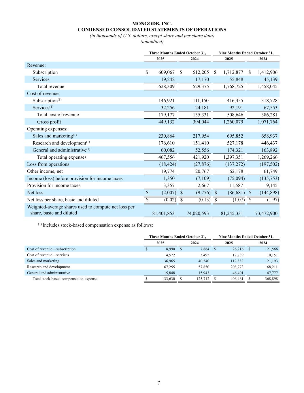 7 MONGODB, INC. CONDENSED CONSOLIDATED STATEMENTS OF OPERATIONS (in thousands of U.S. dollars, except share and per share data) (unaudited) Three Months Ended October 31, Nine Months Ended October 31, 2025 2024 2025 2024 Revenue: Subscription $ 609,067 $ 512,205 $ 1,712,877 $ 1,412,906 Services 19,242 17,170 55,848 45,139 Total revenue 628,309 529,375 1,768,725 1,458,045 Cost of revenue: Subscription(1) 146,921 111,150 416,455 318,728 Services(1) 32,256 24,181 92,191 67,553 Total cost of revenue 179,177 135,331 508,646 386,281 Gross profit 449,132 394,044 1,260,079 1,071,764 Operating expenses: Sales and marketing(1) 230,864 217,954 695,852 658,937 Research and development(1) 176,610 151,410 527,178 446,437 General and administrative(1) 60,082 52,556 174,321 163,892 Total operating expenses 467,556 421,920 1,397,351 1,269,266 Loss from operations (18,424) (27,876) (137,272) (197,502) Other income, net 19,774 20,767 62,178 61,749 Income (loss) before provision for income taxes 1,350 (7,109) (75,094) (135,753) Provision for income taxes 3,357 2,667 11,587 9,145 Net loss $ (2,007) $ (9,776) $ (86,681) $ (144,898) Net loss per share, basic and diluted $ (0.02) $ (0.13) $ (1.07) $ (1.97) Weighted-average shares used to compute net loss per share, basic and diluted 81,401,853 74,020,593 81,245,331 73,472,900 (1) Includes stock‑based compensation expense as follows: Three Months Ended October 31, Nine Months Ended October 31, 2025 2024 2025 2024 Cost of revenue—subscription $ 8,990 $ 7,884 $ 26,216 $ 21,566 Cost of revenue—services 4,572 3,495 12,739 10,151 Sales and marketing 36,965 40,540 112,332 121,193 Research and development 67,255 57,850 208,773 168,211 General and administrative 15,848 15,943 46,401 47,777 Total stock‑based compensation expense $ 133,630 $ 125,712 $ 406,461 $ 368,898