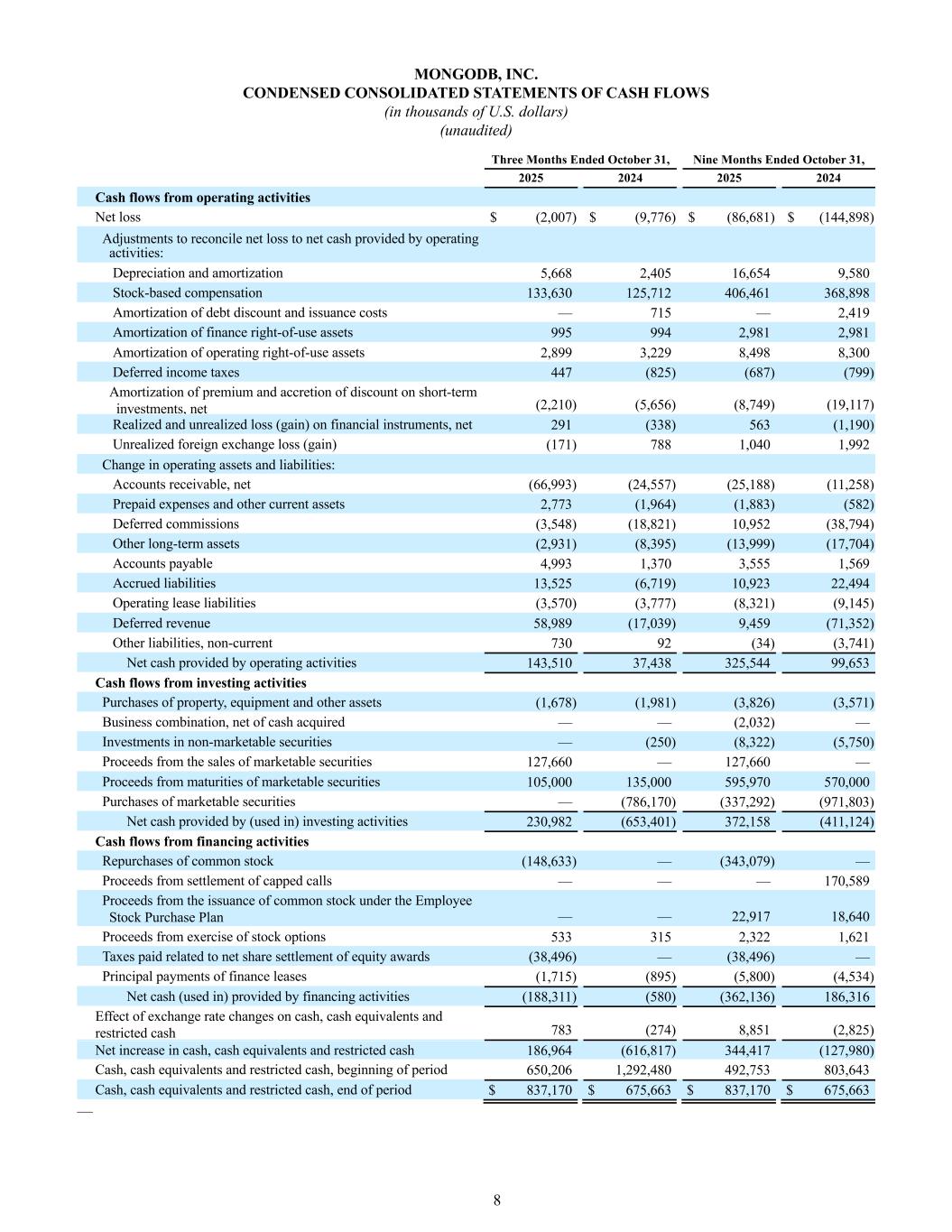 8 MONGODB, INC. CONDENSED CONSOLIDATED STATEMENTS OF CASH FLOWS (in thousands of U.S. dollars) (unaudited) Three Months Ended October 31, Nine Months Ended October 31, 2025 2024 2025 2024 Cash flows from operating activities Net loss $ (2,007) $ (9,776) $ (86,681) $ (144,898) Adjustments to reconcile net loss to net cash provided by operating activities: Depreciation and amortization 5,668 2,405 16,654 9,580 Stock-based compensation 133,630 125,712 406,461 368,898 Amortization of debt discount and issuance costs — 715 — 2,419 Amortization of finance right-of-use assets 995 994 2,981 2,981 Amortization of operating right-of-use assets 2,899 3,229 8,498 8,300 Deferred income taxes 447 (825) (687) (799) Amortization of premium and accretion of discount on short-term investments, net (2,210) (5,656) (8,749) (19,117) Realized and unrealized loss (gain) on financial instruments, net 291 (338) 563 (1,190) Unrealized foreign exchange loss (gain) (171) 788 1,040 1,992 Change in operating assets and liabilities: Accounts receivable, net (66,993) (24,557) (25,188) (11,258) Prepaid expenses and other current assets 2,773 (1,964) (1,883) (582) Deferred commissions (3,548) (18,821) 10,952 (38,794) Other long-term assets (2,931) (8,395) (13,999) (17,704) Accounts payable 4,993 1,370 3,555 1,569 Accrued liabilities 13,525 (6,719) 10,923 22,494 Operating lease liabilities (3,570) (3,777) (8,321) (9,145) Deferred revenue 58,989 (17,039) 9,459 (71,352) Other liabilities, non-current 730 92 (34) (3,741) Net cash provided by operating activities 143,510 37,438 325,544 99,653 Cash flows from investing activities Purchases of property, equipment and other assets (1,678) (1,981) (3,826) (3,571) Business combination, net of cash acquired — — (2,032) — Investments in non-marketable securities — (250) (8,322) (5,750) Proceeds from the sales of marketable securities 127,660 — 127,660 — Proceeds from maturities of marketable securities 105,000 135,000 595,970 570,000 Purchases of marketable securities — (786,170) (337,292) (971,803) Net cash provided by (used in) investing activities 230,982 (653,401) 372,158 (411,124) Cash flows from financing activities Repurchases of common stock (148,633) — (343,079) — Proceeds from settlement of capped calls — — — 170,589 Proceeds from the issuance of common stock under the Employee Stock Purchase Plan — — 22,917 18,640 Proceeds from exercise of stock options 533 315 2,322 1,621 Taxes paid related to net share settlement of equity awards (38,496) — (38,496) — Principal payments of finance leases (1,715) (895) (5,800) (4,534) Net cash (used in) provided by financing activities (188,311) (580) (362,136) 186,316 Effect of exchange rate changes on cash, cash equivalents and restricted cash 783 (274) 8,851 (2,825) Net increase in cash, cash equivalents and restricted cash 186,964 (616,817) 344,417 (127,980) Cash, cash equivalents and restricted cash, beginning of period 650,206 1,292,480 492,753 803,643 Cash, cash equivalents and restricted cash, end of period $ 837,170 $ 675,663 $ 837,170 $ 675,663 —