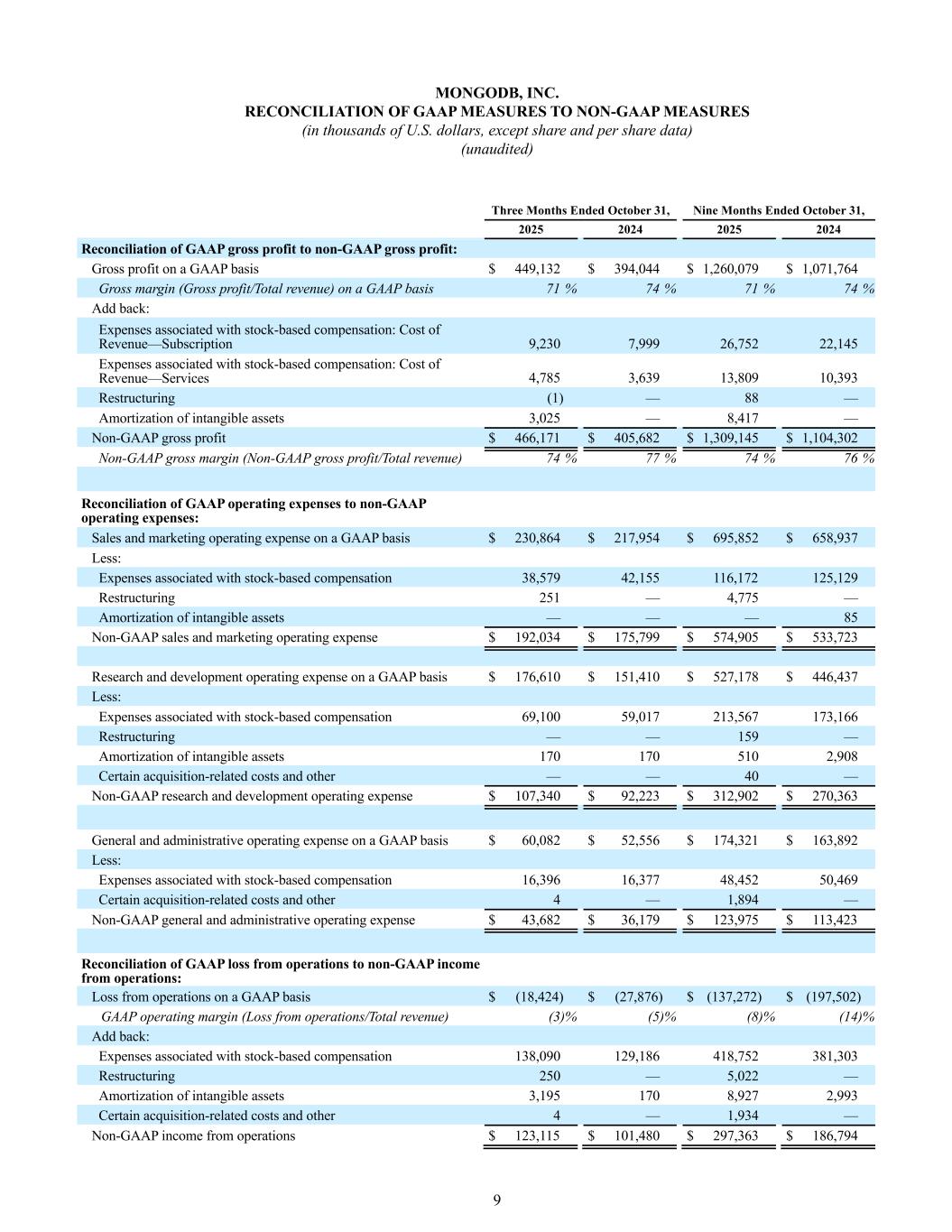 9 MONGODB, INC. RECONCILIATION OF GAAP MEASURES TO NON-GAAP MEASURES (in thousands of U.S. dollars, except share and per share data) (unaudited) Three Months Ended October 31, Nine Months Ended October 31, 2025 2024 2025 2024 Reconciliation of GAAP gross profit to non-GAAP gross profit: Gross profit on a GAAP basis $ 449,132 $ 394,044 $ 1,260,079 $ 1,071,764 Gross margin (Gross profit/Total revenue) on a GAAP basis 71 % 74 % 71 % 74 % Add back: Expenses associated with stock-based compensation: Cost of Revenue—Subscription 9,230 7,999 26,752 22,145 Expenses associated with stock-based compensation: Cost of Revenue—Services 4,785 3,639 13,809 10,393 Restructuring (1) — 88 — Amortization of intangible assets 3,025 — 8,417 — Non-GAAP gross profit $ 466,171 $ 405,682 $ 1,309,145 $ 1,104,302 Non-GAAP gross margin (Non-GAAP gross profit/Total revenue) 74 % 77 % 74 % 76 % Reconciliation of GAAP operating expenses to non-GAAP operating expenses: Sales and marketing operating expense on a GAAP basis $ 230,864 $ 217,954 $ 695,852 $ 658,937 Less: Expenses associated with stock-based compensation 38,579 42,155 116,172 125,129 Restructuring 251 — 4,775 — Amortization of intangible assets — — — 85 Non-GAAP sales and marketing operating expense $ 192,034 $ 175,799 $ 574,905 $ 533,723 Research and development operating expense on a GAAP basis $ 176,610 $ 151,410 $ 527,178 $ 446,437 Less: Expenses associated with stock-based compensation 69,100 59,017 213,567 173,166 Restructuring — — 159 — Amortization of intangible assets 170 170 510 2,908 Certain acquisition-related costs and other — — 40 — Non-GAAP research and development operating expense $ 107,340 $ 92,223 $ 312,902 $ 270,363 General and administrative operating expense on a GAAP basis $ 60,082 $ 52,556 $ 174,321 $ 163,892 Less: Expenses associated with stock-based compensation 16,396 16,377 48,452 50,469 Certain acquisition-related costs and other 4 — 1,894 — Non-GAAP general and administrative operating expense $ 43,682 $ 36,179 $ 123,975 $ 113,423 Reconciliation of GAAP loss from operations to non-GAAP income from operations: Loss from operations on a GAAP basis $ (18,424) $ (27,876) $ (137,272) $ (197,502) GAAP operating margin (Loss from operations/Total revenue) (3) % (5) % (8) % (14) % Add back: Expenses associated with stock-based compensation 138,090 129,186 418,752 381,303 Restructuring 250 — 5,022 — Amortization of intangible assets 3,195 170 8,927 2,993 Certain acquisition-related costs and other 4 — 1,934 — Non-GAAP income from operations $ 123,115 $ 101,480 $ 297,363 $ 186,794