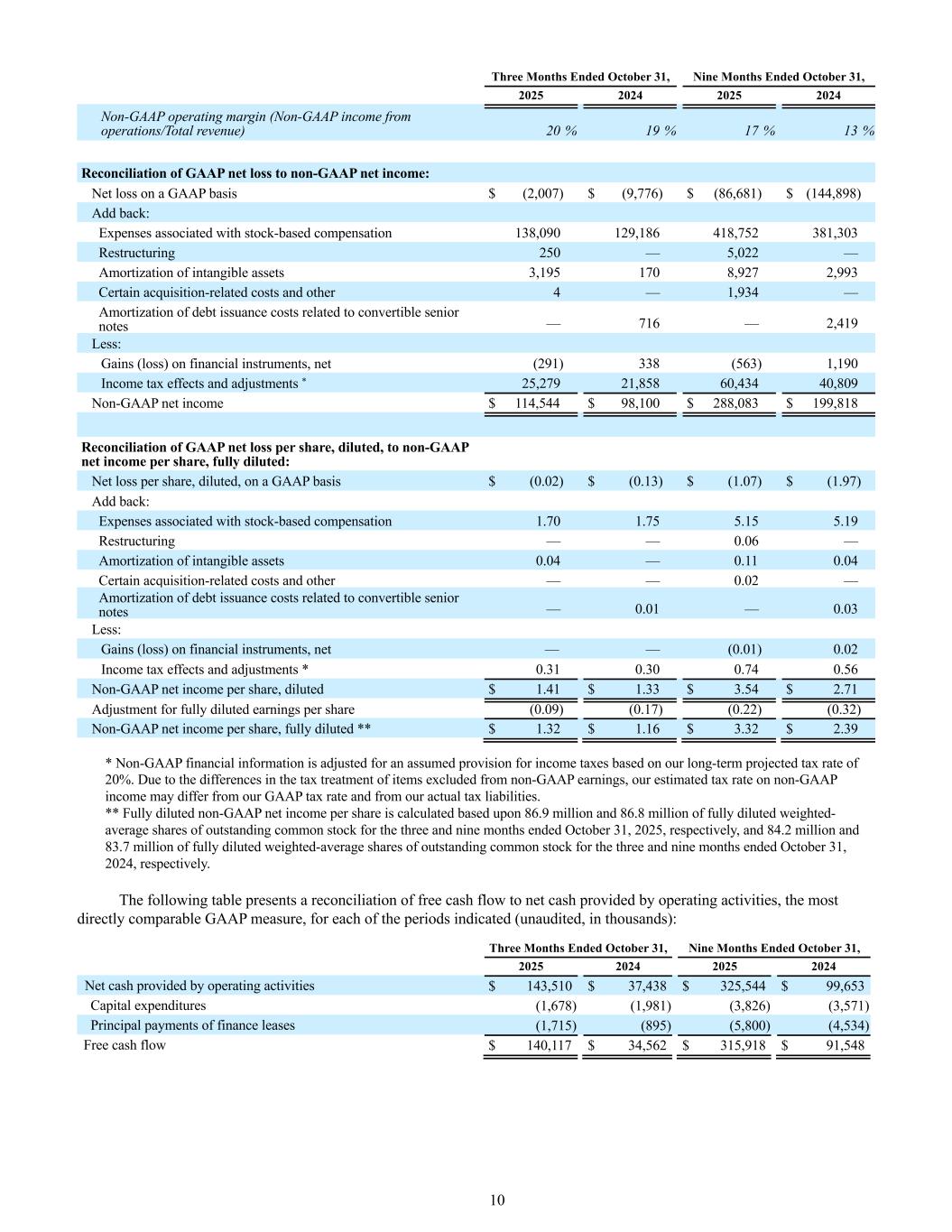 10 Three Months Ended October 31, Nine Months Ended October 31, 2025 2024 2025 2024 Non-GAAP operating margin (Non-GAAP income from operations/Total revenue) 20 % 19 % 17 % 13 % Reconciliation of GAAP net loss to non-GAAP net income: Net loss on a GAAP basis $ (2,007) $ (9,776) $ (86,681) $ (144,898) Add back: Expenses associated with stock-based compensation 138,090 129,186 418,752 381,303 Restructuring 250 — 5,022 — Amortization of intangible assets 3,195 170 8,927 2,993 Certain acquisition-related costs and other 4 — 1,934 — Amortization of debt issuance costs related to convertible senior notes — 716 — 2,419 Less: Gains (loss) on financial instruments, net (291) 338 (563) 1,190 Income tax effects and adjustments * 25,279 21,858 60,434 40,809 Non-GAAP net income $ 114,544 $ 98,100 $ 288,083 $ 199,818 Reconciliation of GAAP net loss per share, diluted, to non-GAAP net income per share, fully diluted: Net loss per share, diluted, on a GAAP basis $ (0.02) $ (0.13) $ (1.07) $ (1.97) Add back: Expenses associated with stock-based compensation 1.70 1.75 5.15 5.19 Restructuring — — 0.06 — Amortization of intangible assets 0.04 — 0.11 0.04 Certain acquisition-related costs and other — — 0.02 — Amortization of debt issuance costs related to convertible senior notes — 0.01 — 0.03 Less: Gains (loss) on financial instruments, net — — (0.01) 0.02 Income tax effects and adjustments * 0.31 0.30 0.74 0.56 Non-GAAP net income per share, diluted $ 1.41 $ 1.33 $ 3.54 $ 2.71 Adjustment for fully diluted earnings per share (0.09) (0.17) (0.22) (0.32) Non-GAAP net income per share, fully diluted ** $ 1.32 $ 1.16 $ 3.32 $ 2.39 * Non-GAAP financial information is adjusted for an assumed provision for income taxes based on our long-term projected tax rate of 20%. Due to the differences in the tax treatment of items excluded from non-GAAP earnings, our estimated tax rate on non-GAAP income may differ from our GAAP tax rate and from our actual tax liabilities. ** Fully diluted non-GAAP net income per share is calculated based upon 86.9 million and 86.8 million of fully diluted weighted- average shares of outstanding common stock for the three and nine months ended October 31, 2025, respectively, and 84.2 million and 83.7 million of fully diluted weighted-average shares of outstanding common stock for the three and nine months ended October 31, 2024, respectively. The following table presents a reconciliation of free cash flow to net cash provided by operating activities, the most directly comparable GAAP measure, for each of the periods indicated (unaudited, in thousands): Three Months Ended October 31, Nine Months Ended October 31, 2025 2024 2025 2024 Net cash provided by operating activities $ 143,510 $ 37,438 $ 325,544 $ 99,653 Capital expenditures (1,678) (1,981) (3,826) (3,571) Principal payments of finance leases (1,715) (895) (5,800) (4,534) Free cash flow $ 140,117 $ 34,562 $ 315,918 $ 91,548