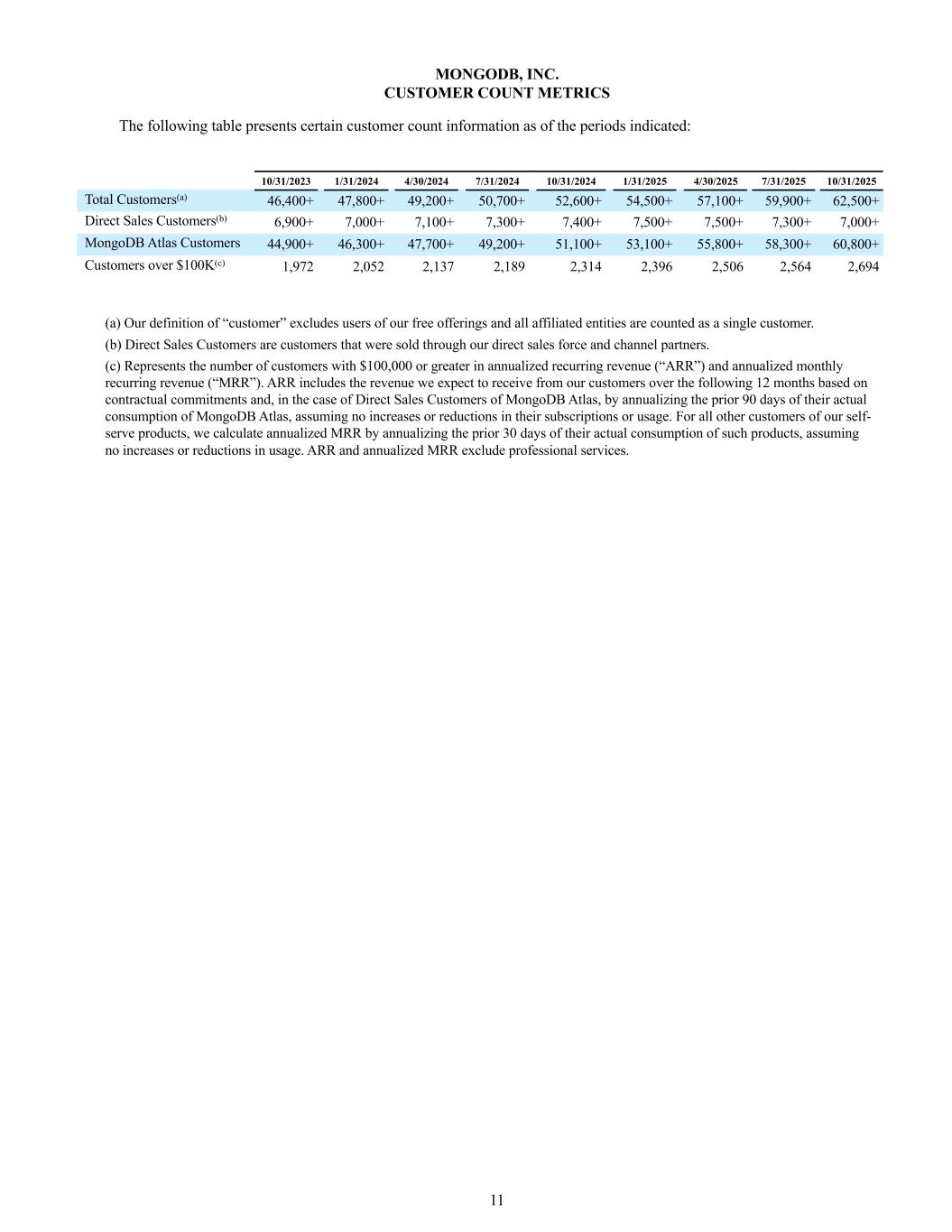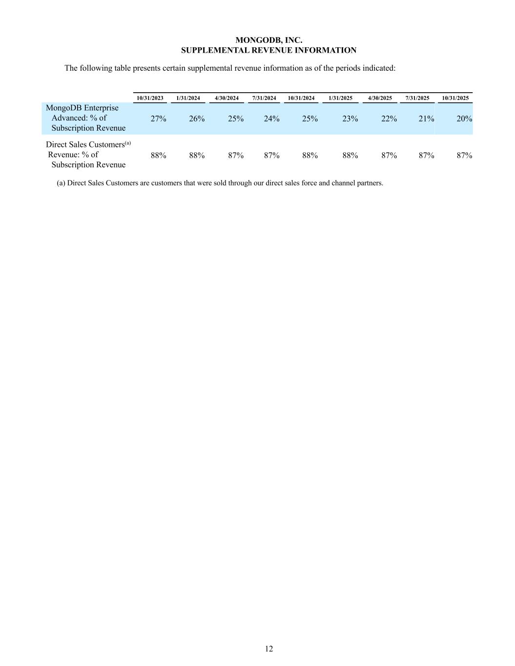 11 MONGODB, INC. CUSTOMER COUNT METRICS The following table presents certain customer count information as of the periods indicated: 10/31/2023 1/31/2024 4/30/2024 7/31/2024 10/31/2024 1/31/2025 4/30/2025 7/31/2025 10/31/2025 Total Customers(a) 46,400+ 47,800+ 49,200+ 50,700+ 52,600+ 54,500+ 57,100+ 59,900+ 62,500+ Direct Sales Customers(b) 6,900+ 7,000+ 7,100+ 7,300+ 7,400+ 7,500+ 7,500+ 7,300+ 7,000+ MongoDB Atlas Customers 44,900+ 46,300+ 47,700+ 49,200+ 51,100+ 53,100+ 55,800+ 58,300+ 60,800+ Customers over $100K(c) 1,972 2,052 2,137 2,189 2,314 2,396 2,506 2,564 2,694 (a) Our definition of “customer” excludes users of our free offerings and all affiliated entities are counted as a single customer. (b) Direct Sales Customers are customers that were sold through our direct sales force and channel partners. (c) Represents the number of customers with $100,000 or greater in annualized recurring revenue (“ARR”) and annualized monthly recurring revenue (“MRR”). ARR includes the revenue we expect to receive from our customers over the following 12 months based on contractual commitments and, in the case of Direct Sales Customers of MongoDB Atlas, by annualizing the prior 90 days of their actual consumption of MongoDB Atlas, assuming no increases or reductions in their subscriptions or usage. For all other customers of our self- serve products, we calculate annualized MRR by annualizing the prior 30 days of their actual consumption of such products, assuming no increases or reductions in usage. ARR and annualized MRR exclude professional services.