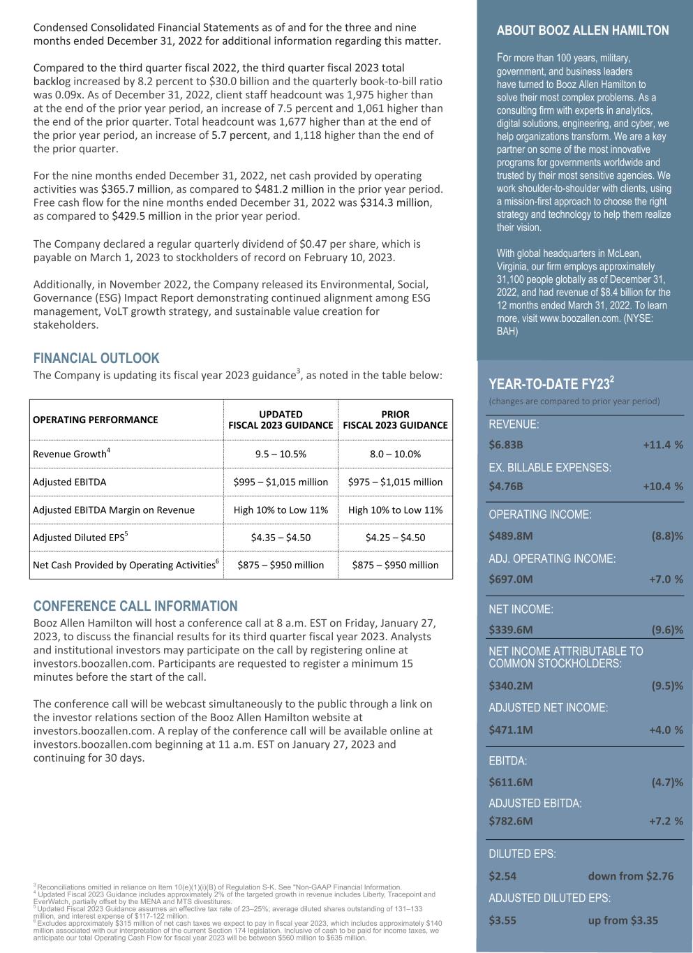 FINANCIAL OUTLOOK The Company is updating its fiscal year 2023 guidance3, as noted in the table below: CONFERENCE CALL INFORMATION Booz Allen Hamilton will host a conference call at 8 a.m. EST on Friday, January 27, 2023, to discuss the financial results for its third quarter fiscal year 2023. Analysts and institutional investors may participate on the call by registering online at investors.boozallen.com. Participants are requested to register a minimum 15 minutes before the start of the call. The conference call will be webcast simultaneously to the public through a link on the investor relations section of the Booz Allen Hamilton website at investors.boozallen.com. A replay of the conference call will be available online at investors.boozallen.com beginning at 11 a.m. EST on January 27, 2023 and continuing for 30 days. 3 Reconciliations omitted in reliance on Item 10(e)(1)(i)(B) of Regulation S-K. See "Non-GAAP Financial Information. 4 Updated Fiscal 2023 Guidance includes approximately 2% of the targeted growth in revenue includes Liberty, Tracepoint and EverWatch, partially offset by the MENA and MTS divestitures. 5 Updated Fiscal 2023 Guidance assumes an effective tax rate of 23–25%; average diluted shares outstanding of 131–133 million, and interest expense of $117-122 million. 6 Excludes approximately $315 million of net cash taxes we expect to pay in fiscal year 2023, which includes approximately $140 million associated with our interpretation of the current Section 174 legislation. Inclusive of cash to be paid for income taxes, we anticipate our total Operating Cash Flow for fiscal year 2023 will be between $560 million to $635 million. 2 Condensed Consolidated Financial Statements as of and for the three and nine months ended December 31, 2022 for additional information regarding this matter. Compared to the third quarter fiscal 2022, the third quarter fiscal 2023 total backlog increased by 8.2 percent to $30.0 billion and the quarterly book-to-bill ratio was 0.09x. As of December 31, 2022, client staff headcount was 1,975 higher than at the end of the prior year period, an increase of 7.5 percent and 1,061 higher than the end of the prior quarter. Total headcount was 1,677 higher than at the end of the prior year period, an increase of 5.7 percent, and 1,118 higher than the end of the prior quarter. For the nine months ended December 31, 2022, net cash provided by operating activities was $365.7 million, as compared to $481.2 million in the prior year period. Free cash flow for the nine months ended December 31, 2022 was $314.3 million, as compared to $429.5 million in the prior year period. The Company declared a regular quarterly dividend of $0.47 per share, which is payable on March 1, 2023 to stockholders of record on February 10, 2023. Additionally, in November 2022, the Company released its Environmental, Social, Governance (ESG) Impact Report demonstrating continued alignment among ESG management, VoLT growth strategy, and sustainable value creation for stakeholders. ABOUT BOOZ ALLEN HAMILTON For more than 100 years, military, government, and business leaders have turned to Booz Allen Hamilton to solve their most complex problems. As a consulting firm with experts in analytics, digital solutions, engineering, and cyber, we help organizations transform. We are a key partner on some of the most innovative programs for governments worldwide and trusted by their most sensitive agencies. We work shoulder-to-shoulder with clients, using a mission-first approach to choose the right strategy and technology to help them realize their vision. With global headquarters in McLean, Virginia, our firm employs approximately 31,100 people globally as of December 31, 2022, and had revenue of $8.4 billion for the 12 months ended March 31, 2022. To learn more, visit www.boozallen.com. (NYSE: BAH) OPERATING PERFORMANCE UPDATED FISCAL 2023 GUIDANCE PRIOR FISCAL 2023 GUIDANCE Revenue Growth4 9.5 – 10.5% 8.0 – 10.0% Adjusted EBITDA $995 – $1,015 million $975 – $1,015 million Adjusted EBITDA Margin on Revenue High 10% to Low 11% High 10% to Low 11% Adjusted Diluted EPS5 $4.35 – $4.50 $4.25 – $4.50 Net Cash Provided by Operating Activities6 $875 – $950 million $875 – $950 million YEAR-TO-DATE FY232 (changes are compared to prior year period) REVENUE: $6.83B +11.4 % EX. BILLABLE EXPENSES: $4.76B +10.4 % OPERATING INCOME: $489.8M (8.8) % ADJ. OPERATING INCOME: $697.0M +7.0 % NET INCOME: $339.6M (9.6) % NET INCOME ATTRIBUTABLE TO COMMON STOCKHOLDERS: $340.2M (9.5) % ADJUSTED NET INCOME: $471.1M +4.0 % EBITDA: $611.6M (4.7) % ADJUSTED EBITDA: $782.6M +7.2 % DILUTED EPS: $2.54 down from $2.76 ADJUSTED DILUTED EPS: $3.55 up from $3.35
