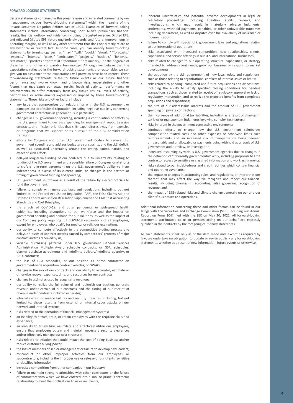 FORWARD LOOKING STATEMENTS Certain statements contained in this press release and in related comments by our management include “forward-looking statements” within the meaning of the Private Securities Litigation Reform Act of 1995. Examples of forward-looking statements include information concerning Booz Allen’s preliminary financial results, financial outlook and guidance, including forecasted revenue, Diluted EPS, and Adjusted Diluted EPS, future quarterly dividends, and future improvements in operating margins, as well as any other statement that does not directly relate to any historical or current fact. In some cases, you can identify forward-looking statements by terminology such as “may,” “will,” “could,” “should,” “forecasts,” “expects,” “intends,” “plans,” “anticipates,” “projects,” “outlook,” “believes,” “estimates,” “predicts,” “potential,” “continue,” “preliminary,” or the negative of these terms or other comparable terminology. Although we believe that the expectations reflected in the forward-looking statements are reasonable, we can give you no assurance these expectations will prove to have been correct. These forward-looking statements relate to future events or our future financial performance and involve known and unknown risks, uncertainties and other factors that may cause our actual results, levels of activity, performance or achievements to differ materially from any future results, levels of activity, performance or achievements expressed or implied by these forward-looking statements. These risks and other factors include: • any issue that compromises our relationships with the U.S. government or damages our professional reputation, including negative publicity concerning government contractors in general or us in particular; • changes in U.S. government spending, including a continuation of efforts by the U.S. government to decrease spending for management support service contracts, and mission priorities that shift expenditures away from agencies or programs that we support or as a result of the U.S. administration transition; • efforts by Congress and other U.S. government bodies to reduce U.S. government spending and address budgetary constraints, and the U.S. deficit, as well as associated uncertainty around the timing, extent, nature, and effect of such efforts; • delayed long-term funding of our contracts due to uncertainty relating to funding of the U.S. government and a possible failure of Congressional efforts to craft a long-term agreement on the U.S. government’s ability to incur indebtedness in excess of its current limits, or changes in the pattern or timing of government funding and spending; • U.S. government shutdowns as a result of the failure by elected officials to fund the government; • failure to comply with numerous laws and regulations, including, but not limited to, the Federal Acquisition Regulation (FAR), the False Claims Act, the Defense Federal Acquisition Regulation Supplement and FAR Cost Accounting Standards and Cost Principles; • the effects of COVID-19, and other pandemics or widespread health epidemics, including disruptions to our workforce and the impact on government spending and demand for our solutions, as well as the impact of our Company policy requiring full COVID-19 vaccinations of all employees, except for employees who qualify for medical or religious exemptions; • our ability to compete effectively in the competitive bidding process and delays or losses of contract awards caused by competitors’ protests of major contract awards received by us; • variable purchasing patterns under U.S. government General Services Administration Multiple Award schedule contracts, or GSA, schedules, blanket purchase agreements and indefinite delivery/indefinite quantity, or IDIQ, contracts; • the loss of GSA schedules, or our position as prime contractor on government-wide acquisition contract vehicles, or GWACs; • changes in the mix of our contracts and our ability to accurately estimate or otherwise recover expenses, time, and resources for our contracts; • changes in estimates used in recognizing revenue; • our ability to realize the full value of and replenish our backlog, generate revenue under certain of our contracts and the timing of our receipt of revenue under contracts included in backlog; • internal system or service failures and security breaches, including, but not limited to, those resulting from external or internal cyber attacks on our network and internal systems; • risks related to the operation of financial management systems; • an inability to attract, train, or retain employees with the requisite skills and experience; • an inability to timely hire, assimilate and effectively utilize our employees, ensure that employees obtain and maintain necessary security clearances and/or effectively manage our cost structure; • risks related to inflation that could impact the cost of doing business and/or reduce customer buying power; • the loss of members of senior management or failure to develop new leaders; • misconduct or other improper activities from our employees or subcontractors, including the improper use or release of our clients’ sensitive or classified information; • increased competition from other companies in our industry; • failure to maintain strong relationships with other contractors or the failure of contractors with which we have entered into a sub- or prime- contractor relationship to meet their obligations to us or our clients; • inherent uncertainties and potential adverse developments in legal or regulatory proceedings, including litigation, audits, reviews, and investigations, which may result in materially adverse judgments, settlements, withheld payments, penalties, or other unfavorable outcomes including debarment, as well as disputes over the availability of insurance o