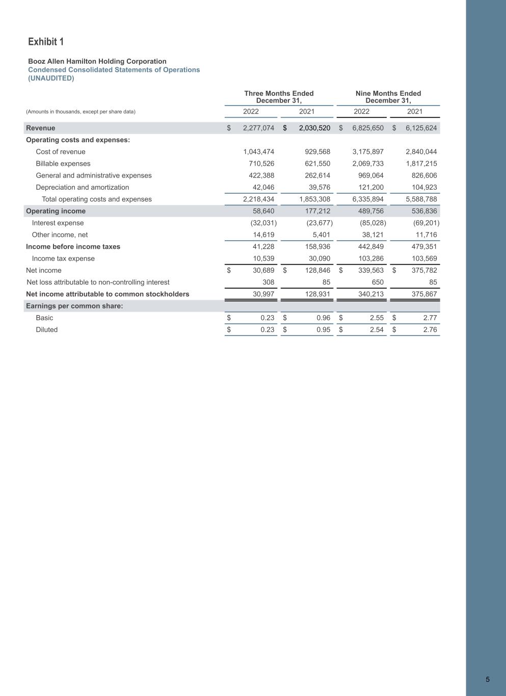 Exhibit 1 Booz Allen Hamilton Holding Corporation Condensed Consolidated Statements of Operations (UNAUDITED) 5 Three Months Ended December 31, Nine Months Ended December 31, (Amounts in thousands, except per share data) 2022 2021 2022 2021 Revenue $ 2,277,074 $ 2,030,520 $ 6,825,650 $ 6,125,624 Operating costs and expenses: Cost of revenue 1,043,474 929,568 3,175,897 2,840,044 Billable expenses 710,526 621,550 2,069,733 1,817,215 General and administrative expenses 422,388 262,614 969,064 826,606 Depreciation and amortization 42,046 39,576 121,200 104,923 Total operating costs and expenses 2,218,434 1,853,308 6,335,894 5,588,788 Operating income 58,640 177,212 489,756 536,836 Interest expense (32,031) (23,677) (85,028) (69,201) Other income, net 14,619 5,401 38,121 11,716 Income before income taxes 41,228 158,936 442,849 479,351 Income tax expense 10,539 30,090 103,286 103,569 Net income $ 30,689 $ 128,846 $ 339,563 $ 375,782 Net loss attributable to non-controlling interest 308 85 650 85 Net income attributable to common stockholders 30,997 128,931 340,213 375,867 Earnings per common share: Basic $ 0.23 $ 0.96 $ 2.55 $ 2.77 Diluted $ 0.23 $ 0.95 $ 2.54 $ 2.76 5
