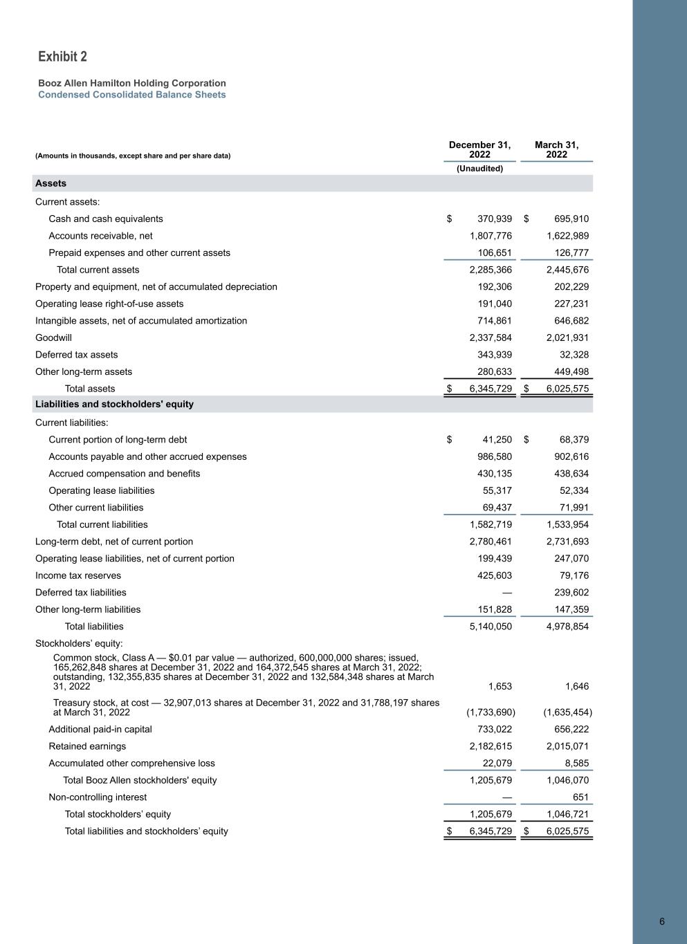 Exhibit 2 Booz Allen Hamilton Holding Corporation Condensed Consolidated Balance Sheets (Amounts in thousands, except share and per share data) December 31, 2022 March 31, 2022 (Unaudited) Assets Current assets: Cash and cash equivalents $ 370,939 $ 695,910 Accounts receivable, net 1,807,776 1,622,989 Prepaid expenses and other current assets 106,651 126,777 Total current assets 2,285,366 2,445,676 Property and equipment, net of accumulated depreciation 192,306 202,229 Operating lease right-of-use assets 191,040 227,231 Intangible assets, net of accumulated amortization 714,861 646,682 Goodwill 2,337,584 2,021,931 Deferred tax assets 343,939 32,328 Other long-term assets 280,633 449,498 Total assets $ 6,345,729 $ 6,025,575 Liabilities and stockholders' equity Current liabilities: Current portion of long-term debt $ 41,250 $ 68,379 Accounts payable and other accrued expenses 986,580 902,616 Accrued compensation and benefits 430,135 438,634 Operating lease liabilities 55,317 52,334 Other current liabilities 69,437 71,991 Total current liabilities 1,582,719 1,533,954 Long-term debt, net of current portion 2,780,461 2,731,693 Operating lease liabilities, net of current portion 199,439 247,070 Income tax reserves 425,603 79,176 Deferred tax liabilities — 239,602 Other long-term liabilities 151,828 147,359 Total liabilities 5,140,050 4,978,854 Stockholders’ equity: Common stock, Class A — $0.01 par value — authorized, 600,000,000 shares; issued, 165,262,848 shares at December 31, 2022 and 164,372,545 shares at March 31, 2022; outstanding, 132,355,835 shares at December 31, 2022 and 132,584,348 shares at March 31, 2022 1,653 1,646 Treasury stock, at cost — 32,907,013 shares at December 31, 2022 and 31,788,197 shares at March 31, 2022 (1,733,690) (1,635,454) Additional paid-in capital 733,022 656,222 Retained earnings 2,182,615 2,015,071 Accumulated other comprehensive loss 22,079 8,585 Total Booz Allen stockholders' equity 1,205,679 1,046,070 Non-controlling interest — 651 Total stockholders’ equity 1,205,679 1,046,721 Total liabilities and stockholders’ equity $ 6,345,729 $ 6,025,575 66