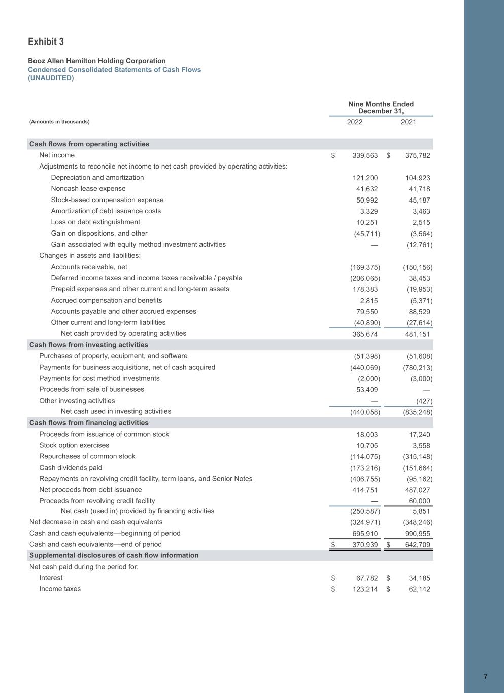 Exhibit 3 Booz Allen Hamilton Holding Corporation Condensed Consolidated Statements of Cash Flows (UNAUDITED) 7 Nine Months Ended December 31, (Amounts in thousands) 2022 2021 Cash flows from operating activities Net income $ 339,563 $ 375,782 Adjustments to reconcile net income to net cash provided by operating activities: Depreciation and amortization 121,200 104,923 Noncash lease expense 41,632 41,718 Stock-based compensation expense 50,992 45,187 Amortization of debt issuance costs 3,329 3,463 Loss on debt extinguishment 10,251 2,515 Gain on dispositions, and other (45,711) (3,564) Gain associated with equity method investment activities — (12,761) Changes in assets and liabilities: Accounts receivable, net (169,375) (150,156) Deferred income taxes and income taxes receivable / payable (206,065) 38,453 Prepaid expenses and other current and long-term assets 178,383 (19,953) Accrued compensation and benefits 2,815 (5,371) Accounts payable and other accrued expenses 79,550 88,529 Other current and long-term liabilities (40,890) (27,614) Net cash provided by operating activities 365,674 481,151 Cash flows from investing activities Purchases of property, equipment, and software (51,398) (51,608) Payments for business acquisitions, net of cash acquired (440,069) (780,213) Payments for cost method investments (2,000) (3,000) Proceeds from sale of businesses 53,409 — Other investing activities — (427) Net cash used in investing activities (440,058) (835,248) Cash flows from financing activities Proceeds from issuance of common stock 18,003 17,240 Stock option exercises 10,705 3,558 Repurchases of common stock (114,075) (315,148) Cash dividends paid (173,216) (151,664) Repayments on revolving credit facility, term loans, and Senior Notes (406,755) (95,162) Net proceeds from debt issuance 414,751 487,027 Proceeds from revolving credit facility — 60,000 Net cash (used in) provided by financing activities (250,587) 5,851 Net decrease in cash and cash equivalents (324,971) (348,246) Cash and cash equivalents––beginning of period 695,910 990,955 Cash and cash equivalents––end of period $ 370,939 $ 642,709 Supplemental disclosures of cash flow information Net cash paid during the period for: Interest $ 67,782 $ 34,185 Income taxes $ 123,214 $ 62,142 7