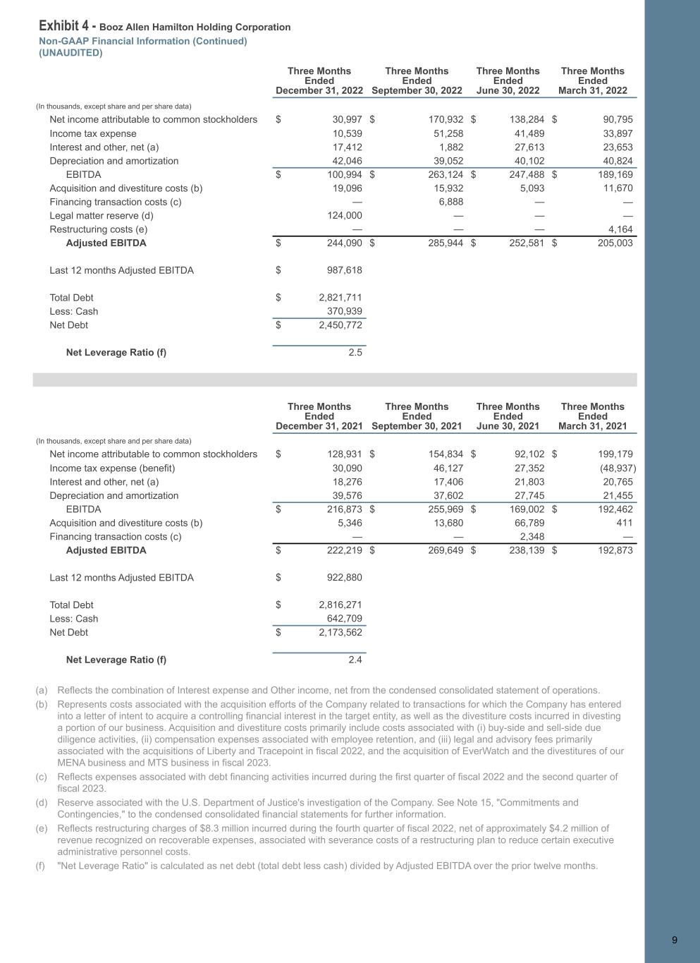 Exhibit 4 - Booz Allen Hamilton Holding Corporation Non-GAAP Financial Information (Continued) (UNAUDITED) 9 Three Months Ended December 31, 2022 Three Months Ended September 30, 2022 Three Months Ended June 30, 2022 Three Months Ended March 31, 2022 (In thousands, except share and per share data) Net income attributable to common stockholders $ 30,997 $ 170,932 $ 138,284 $ 90,795 Income tax expense 10,539 51,258 41,489 33,897 Interest and other, net (a) 17,412 1,882 27,613 23,653 Depreciation and amortization 42,046 39,052 40,102 40,824 EBITDA $ 100,994 $ 263,124 $ 247,488 $ 189,169 Acquisition and divestiture costs (b) 19,096 15,932 5,093 11,670 Financing transaction costs (c) — 6,888 — — Legal matter reserve (d) 124,000 — — — Restructuring costs (e) — — — 4,164 Adjusted EBITDA $ 244,090 $ 285,944 $ 252,581 $ 205,003 Last 12 months Adjusted EBITDA $ 987,618 Total Debt $ 2,821,711 Less: Cash 370,939 Net Debt $ 2,450,772 Net Leverage Ratio (f) 2.5 Three Months Ended December 31, 2021 Three Months Ended September 30, 2021 Three Months Ended June 30, 2021 Three Months Ended March 31, 2021 (In thousands, except share and per share data) Net income attributable to common stockholders $ 128,931 $ 154,834 $ 92,102 $ 199,179 Income tax expense (benefit) 30,090 46,127 27,352 (48,937) Interest and other, net (a) 18,276 17,406 21,803 20,765 Depreciation and amortization 39,576 37,602 27,745 21,455 EBITDA $ 216,873 $ 255,969 $ 169,002 $ 192,462 Acquisition and divestiture costs (b) 5,346 13,680 66,789 411 Financing transaction costs (c) — — 2,348 — Adjusted EBITDA $ 222,219 $ 269,649 $ 238,139 $ 192,873 Last 12 months Adjusted EBITDA $ 922,880 Total Debt $ 2,816,271 Less: Cash 642,709 Net Debt $ 2,173,562 Net Leverage Ratio (f) 2.4 9 (a) Reflects the combination of Interest expense and Other income, net from the condensed consolidated statement of operations. (b) Represents costs associated with the acquisition efforts of the Company related to transactions for which the Company has entered into a letter of intent to acquire a controlling financial interest in the target entity, as well as the divestiture costs incurred in divesting a portion of our business. Acquisition and divestiture costs primarily include costs associated with (i) buy-side and sell-side due diligence activities, (ii) compensation expenses associated with employee retention, and (iii) legal and advisory fees primarily associated with the acquisitions of Liberty and Tracepoint in fiscal 2022, and the acquisition of EverWatch and the divestitures of our MENA business and MTS business in fiscal 2023. (c) Reflects expenses associated with debt financing activities incurred during the first quarter of fiscal 2022 and the second quarter of fiscal 2023. (d) Reserve associated with the U.S. Department of Justice's investigation of the Company. See Note 15, "Commitments and Contingencies," to the condensed consolidated financial statements for further information. (e) Reflects restructuring charges of $8.3 million incurred during the fourth quarter of fiscal 2022, net of approximately $4.2 million of revenue recognized on recoverable expenses, associated with severance costs of a restructuring plan to reduce certain executive administrative personnel costs. (f) "Net Leverage Ratio" is calculated as net debt (total debt less cash) divided by Adjusted EBITDA over the prior twelve months.