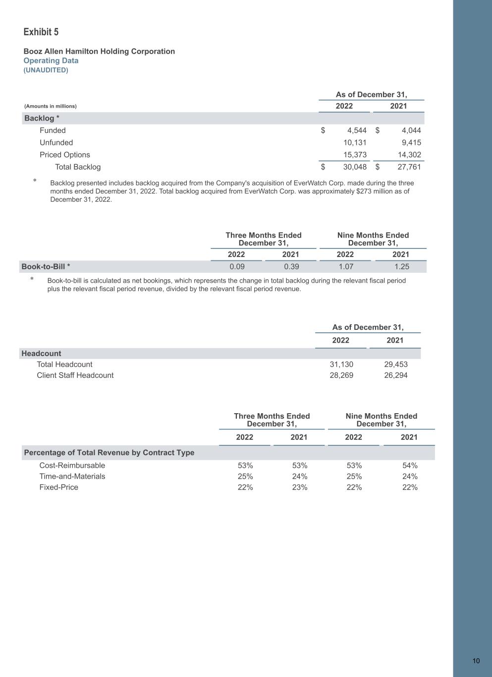 1 0 Exhibit 5 Booz Allen Hamilton Holding Corporation Operating Data (UNAUDITED) As of December 31, (Amounts in millions) 2022 2021 Backlog * Funded $ 4,544 $ 4,044 Unfunded 10,131 9,415 Priced Options 15,373 14,302 Total Backlog $ 30,048 $ 27,761 Three Months Ended December 31, Nine Months Ended December 31, 2022 2021 2022 2021 Book-to-Bill * 0.09 0.39 1.07 1.25 * Book-to-bill is calculated as net bookings, which represents the change in total backlog during the relevant fiscal period plus the relevant fiscal period revenue, divided by the relevant fiscal period revenue. As of December 31, 2022 2021 Headcount Total Headcount 31,130 29,453 Client Staff Headcount 28,269 26,294 Three Months Ended December 31, Nine Months Ended December 31, 2022 2021 2022 2021 Percentage of Total Revenue by Contract Type Cost-Reimbursable 53% 53% 53% 54% Time-and-Materials 25% 24% 25% 24% Fixed-Price 22% 23% 22% 22% 10 * Backlog presented includes backlog acquired from the Company's acquisition of EverWatch Corp. made during the three months ended December 31, 2022. Total backlog acquired from EverWatch Corp. was approximately $273 million as of December 31, 2022.