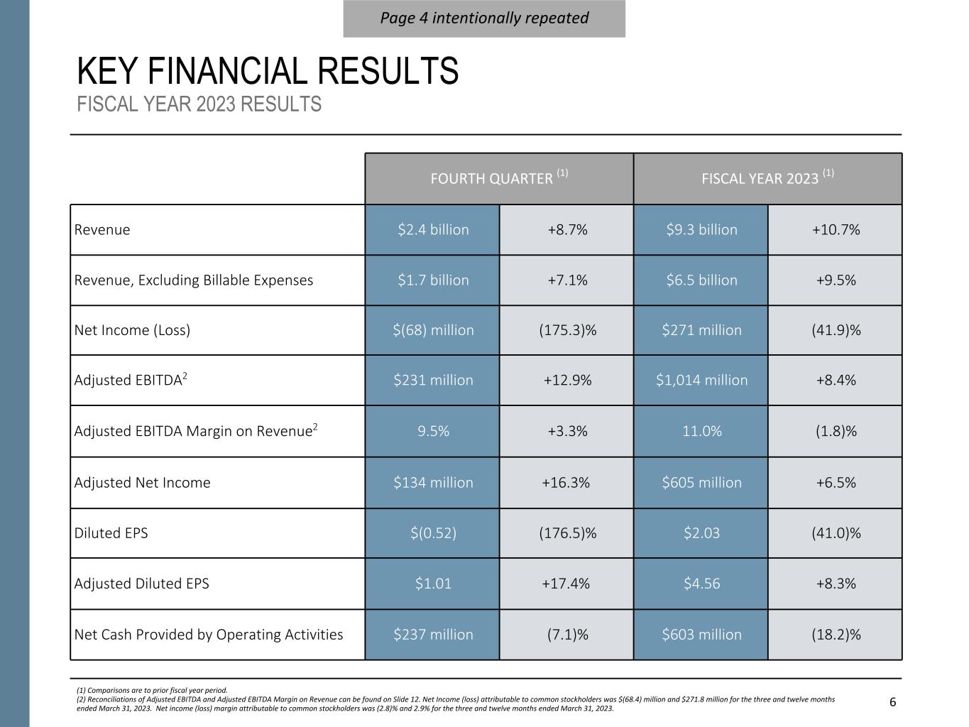 12 NON-GAAP FINANCIAL INFORMATION (Unaudited) Three Months Ended March 31, Fiscal Year Ended March 31, (In thousands, except share and per share data) 2023 2022 2023 2022 Revenue, Excluding Billable Expenses Revenue $ 2,433,261 $ 2,238,076 $ 9,258,911 $ 8,363,700 Less: Billable expenses 739,124 656,948 2,808,857 2,474,163 Revenue, Excluding Billable Expenses $ 1,694,137 $ 1,581,128 $ 6,450,054 $ 5,889,537 Adjusted Operating Income Operating Income (loss) $ (42,908) $ 148,345 $ 446,848 $ 685,181 Acquisition and divestiture costs (a) 4,148 11,670 44,269 97,485 Financing transaction costs (b) — — 6,888 2,348 Significant acquisition amortization (c) 15,278 11,885 51,553 38,295 Legal matter reserve (d) 226,000 — 350,000 — Restructuring costs (e) — 4,164 — 4,164 Adjusted Operating Income $ 202,518 $ 176,064 $ 899,558 $ 827,473 EBITDA, Adjusted EBITDA, Adjusted EBITDA Margin on Revenue & Adjusted EBITDA Margin on Revenue, Excluding Billable Expenses Net income (loss) attributable to common stockholders $ (68,422) $ 90,873 $ 271,791 $ 466,740 Income tax expense (6,552) 33,897 96,734 137,466 Interest and other, net (f) 31,992 23,653 78,899 81,138 Depreciation and amortization 44,284 40,824 165,484 145,747 EBITDA 1,302 189,247 612,908 831,091 Acquisition and divestiture costs (a) 4,148 11,670 44,269 97,485 Financing transaction costs (b) — — 6,888 2,348 Legal matter reserve (d) 226,000 — 350,000 — Restructuring costs (e) — 4,164 — 4,164 Adjusted EBITDA $ 231,450 $ 205,081 $ 1,014,065 $ 935,088 Net income (loss) margin attributable to common stockholders (2.8) % 4.1 % 2.9 % 5.6 % Adjusted EBITDA Margin on Revenue 9.5 % 9.2 % 11.0 % 11.2 % Adjusted EBITDA Margin on Revenue, Excluding Billable Expenses 13.7 % 13.0 % 15.7 % 15.9 % Adjusted Net Income Net income (loss) attributable to common stockholders $ (68,422) $ 90,873 $ 271,791 $ 466,740 Acquisition and divestiture costs (a) 4,148 11,670 44,269 97,485 Financing transaction costs (b) — — 6,888 2,348 Significant acquisition amortization (c) 15,278 11,885 51,553 38,295 Legal matter reserve (d) 226,000 — 350,000 — Restructuring costs (e) — 4,164 — 4,164 Gain associated with equity method investment activity (g) — — — (12,761) Gains associated with divestitures or deconsolidation (h) — — (44,632) — Amortization or write-off of debt issuance costs and debt discount 774 816 6,554 3,340 Adjustments for tax effect (i) (43,871) (4,272) (81,389) (31,399) Adjusted Net Income $ 133,907 $ 115,136 $ 605,034 $ 568,212 Adjusted Diluted Earnings Per Share Weighted-average number of diluted shares outstanding $ 131,781,922 $ 133,406,723 $ 132,716,436 $ 134,850,808 Diluted earnings per share $ (0.52) $ 0.68 $ 2.03 $ 3.44 Adjusted Net Income Per Diluted Share (j) $ 1.01 $ 0.86 $ 4.56 $ 4.21 Free Cash Flow Net cash provided by operating activities 237,148 255,375 602,822 736,526 Less: Purchases of property, equipment and software (24,732) (28,356) (76,130) (79,964) Free Cash Flow $ 212,416 $ 227,019 $ 526,692 $ 656,562 Operating cash flow conversion (347) % 281 % 222 % 158 % Free cash flow conversion 159 % 197 % 87 % 116 % 12
