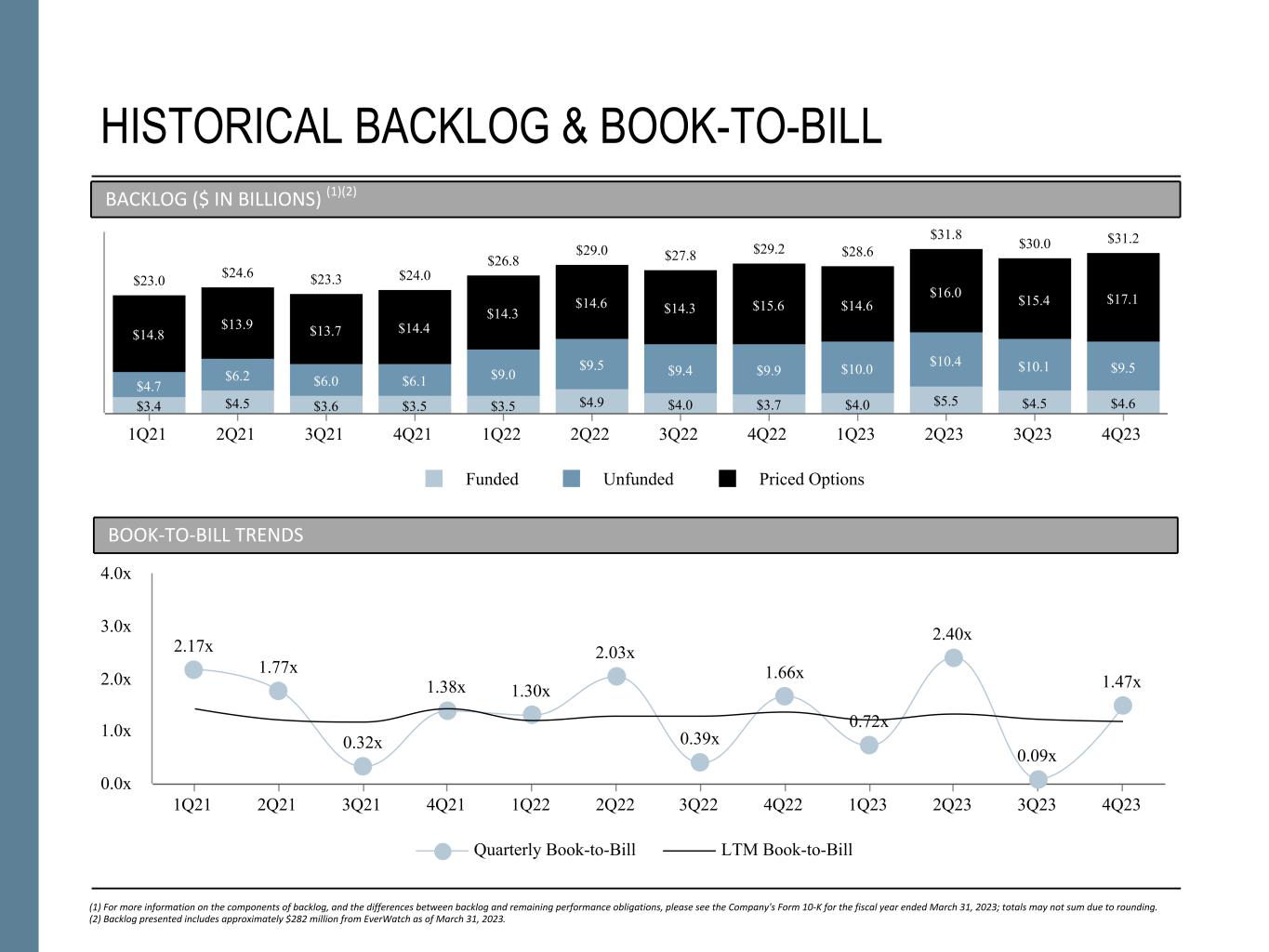 7 $22.0 HISTORICAL BACKLOG & BOOK-TO-BILL (1) For more information on the components of backlog, and the differences between backlog and remaining performance obligations, please see the Company's Form 10-K for the fiscal year ended March 31, 2023; totals may not sum due to rounding. (2) Backlog presented includes approximately $282 million from EverWatch as of March 31, 2023. BACKLOG ($ IN BILLIONS) (1)(2) BOOK-TO-BILL TRENDS $23.0 $24.6 $23.3 $24.0 $26.8 $29.0 $27.8 $29.2 $28.6 $31.8 $30.0 $31.2 $3.4 $4.5 $3.6 $3.5 $3.5 $4.9 $4.0 $3.7 $4.0 $5.5 $4.5 $4.6 $4.7 $6.2 $6.0 $6.1 $9.0 $9.5 $9.4 $9.9 $10.0 $10.4 $10.1 $9.5 $14.8 $13.9 $13.7 $14.4 $14.3 $14.6 $14.3 $15.6 $14.6 $16.0 $15.4 $17.1 Funded Unfunded Priced Options 1Q21 2Q21 3Q21 4Q21 1Q22 2Q22 3Q22 4Q22 1Q23 2Q23 3Q23 4Q23 2.17x 1.77x 0.32x 1.38x 1.30x 2.03x 0.39x 1.66x 0.72x 2.40x 0.09x 1.47x Quarterly Book-to-Bill LTM Book-to-Bill 1Q21 2Q21 3Q21 4Q21 1Q22 2Q22 3Q22 4Q22 1Q23 2Q23 3Q23 4Q23 0.0x 1.0x 2.0x 3.0x 4.0x