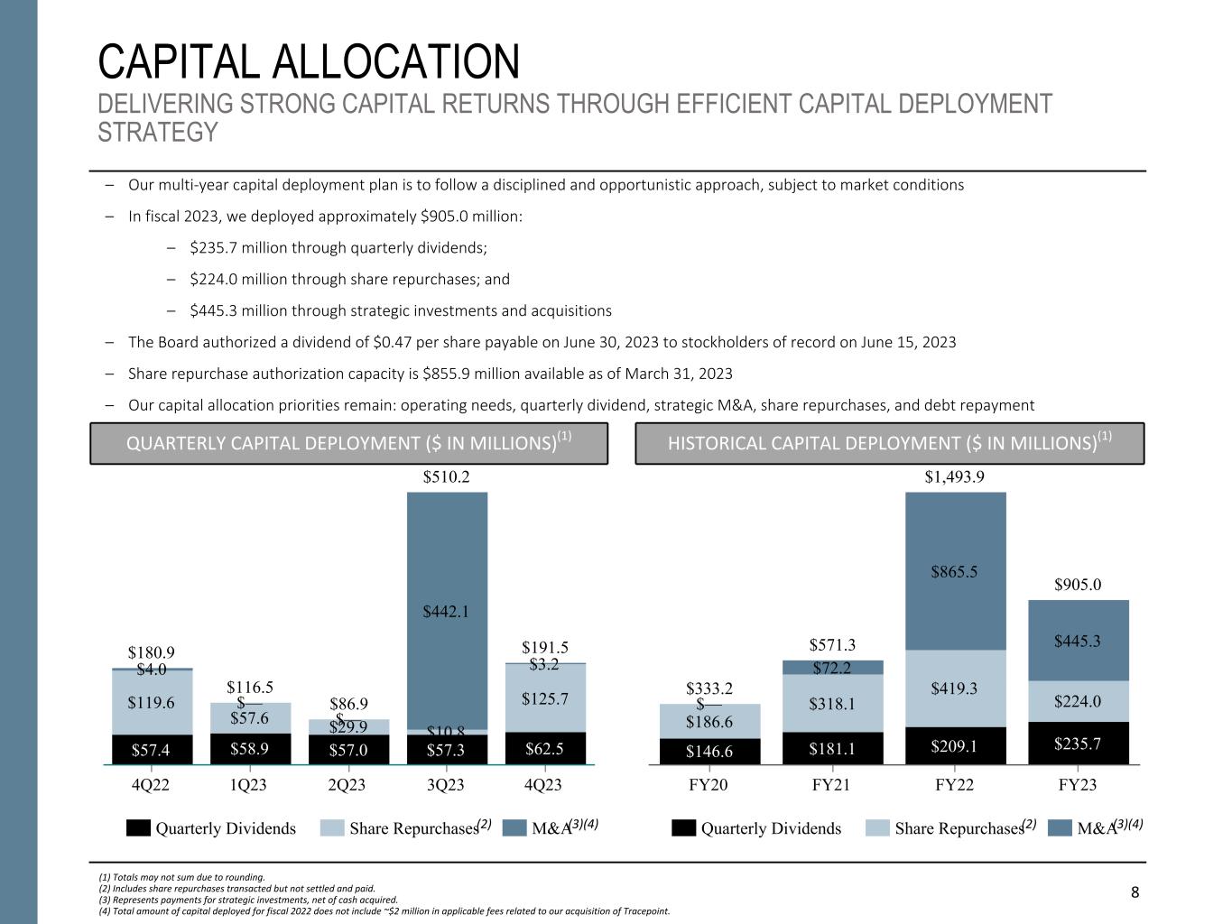 8 CAPITAL ALLOCATION DELIVERING STRONG CAPITAL RETURNS THROUGH EFFICIENT CAPITAL DEPLOYMENT STRATEGY – Our multi-year capital deployment plan is to follow a disciplined and opportunistic approach, subject to market conditions – In fiscal 2023, we deployed approximately $905.0 million: – $235.7 million through quarterly dividends; – $224.0 million through share repurchases; and – $445.3 million through strategic investments and acquisitions – The Board authorized a dividend of $0.47 per share payable on June 30, 2023 to stockholders of record on June 15, 2023 – Share repurchase authorization capacity is $855.9 million available as of March 31, 2023 – Our capital allocation priorities remain: operating needs, quarterly dividend, strategic M&A, share repurchases, and debt repayment HISTORICAL CAPITAL DEPLOYMENT ($ IN MILLIONS)(1)QUARTERLY CAPITAL DEPLOYMENT ($ IN MILLIONS)(1) $180.9 $116.5 $86.9 $510.2 $191.5 $57.4 $58.9 $57.0 $57.3 $62.5 $119.6 $57.6 $29.9 $10.8 $125.7 $4.0 $— $— $442.1 $3.2 Quarterly Dividends Share Repurchases M&A 4Q22 1Q23 2Q23 3Q23 4Q23 $333.2 $571.3 $1,493.9 $905.0 $146.6 $181.1 $209.1 $235.7 $186.6 $318.1 $419.3 $224.0$— $72.2 $865.5 $445.3 Quarterly Dividends Share Repurchases M&A FY20 FY21 FY22 FY23 (3)(4) (1) Totals may not sum due to rounding. (2) Includes share repurchases transacted but not settled and paid. (3) Represents payments for strategic investments, net of cash acquired. (4) Total amount of capital deployed for fiscal 2022 does not include ~$2 million in applicable fees related to our acquisition of Tracepoint. (2) (3)(4) (2)