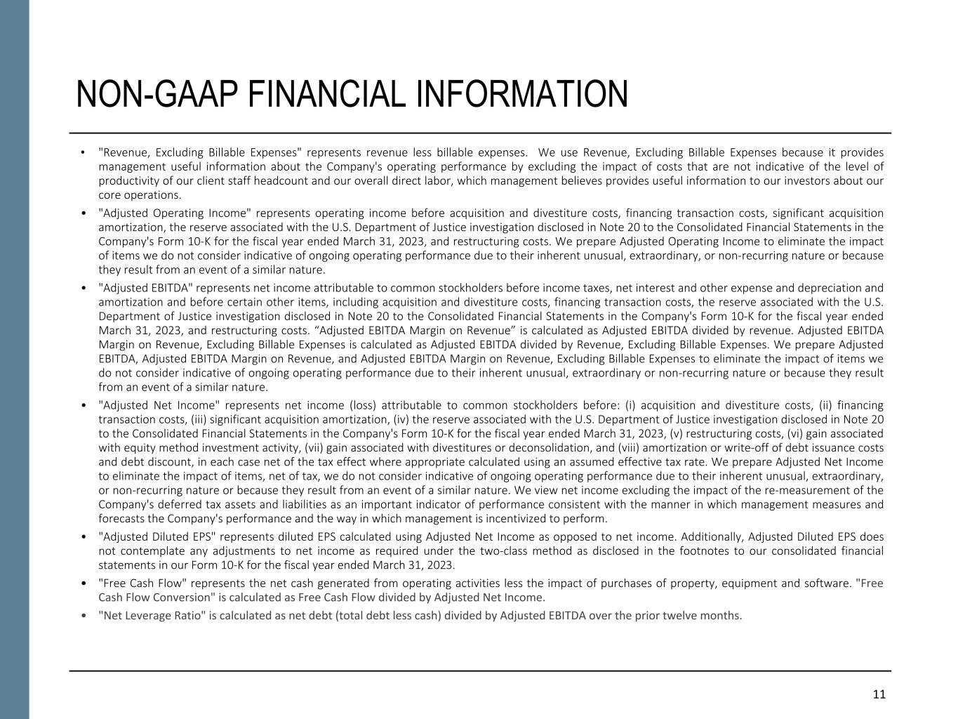 11 NON-GAAP FINANCIAL INFORMATION • "Revenue, Excluding Billable Expenses" represents revenue less billable expenses. We use Revenue, Excluding Billable Expenses because it provides management useful information about the Company's operating performance by excluding the impact of costs that are not indicative of the level of productivity of our client staff headcount and our overall direct labor, which management believes provides useful information to our investors about our core operations. • "Adjusted Operating Income" represents operating income before acquisition and divestiture costs, financing transaction costs, significant acquisition amortization, the reserve associated with the U.S. Department of Justice investigation disclosed in Note 20 to the Consolidated Financial Statements in the Company's Form 10-K for the fiscal year ended March 31, 2023, and restructuring costs. We prepare Adjusted Operating Income to eliminate the impact of items we do not consider indicative of ongoing operating performance due to their inherent unusual, extraordinary, or non-recurring nature or because they result from an event of a similar nature. • "Adjusted EBITDA" represents net income attributable to common stockholders before income taxes, net interest and other expense and depreciation and amortization and before certain other items, including acquisition and divestiture costs, financing transaction costs, the reserve associated with the U.S. Department of Justice investigation disclosed in Note 20 to the Consolidated Financial Statements in the Company's Form 10-K for the fiscal year ended March 31, 2023, and restructuring costs. “Adjusted EBITDA Margin on Revenue” is calculated as Adjusted EBITDA divided by revenue. Adjusted EBITDA Margin on Revenue, Excluding Billable Expenses is calculated as Adjusted EBITDA divided by Revenue, Excluding Billable Expenses. We prepare Adjusted EBITDA, Adjusted EBITDA Margin on Revenue, and Adjusted EBITDA Margin on Revenue, Excluding Billable Expenses to eliminate the impact of items we do not consider indicative of ongoing operating performance due to their inherent unusual, extraordinary or non-recurring nature or because they result from an event of a similar nature. • "Adjusted Net Income" represents net income (loss) attributable to common stockholders before: (i) acquisition and divestiture costs, (ii) financing transaction costs, (iii) significant acquisition amortization, (iv) the reserve associated with the U.S. Department of Justice investigation disclosed in Note 20 to the Consolidated Financial Statements in the Company's Form 10-K for the fiscal year ended March 31, 2023, (v) restructuring costs, (vi) gain associated with equity method investment activity, (vii) gain associated with divestitures or deconsolidation, and (viii) amortization or write-off of debt issuance costs and debt discount, in each case net of the tax effect where appropriate calculated using an assumed effective tax rate. We prepare Adjusted Net Income to eliminate the impact of items, net of tax, we do not consider indicative of ongoing operating performance due to their inherent unusual, extraordinary, or non-recurring nature or because they result from an event of a similar nature. We view net income excluding the impact of the re-measurement of the Company's deferred tax assets and liabilities as an important indicator of performance consistent with the manner in which management measures and forecasts the Company's performance and the way in which management is incentivized to perform. • "Adjusted Diluted EPS" represents diluted EPS calculated using Adjusted Net Income as opposed to net income. Additionally, Adjusted Diluted EPS does not contemplate any adjustments to net income as required under the two-class method as disclosed in the footnotes to our consolidated financial statements in our Form 10-K for the fiscal year ended March 31, 2023. • "Free Cash Flow" represents the net cash generated from operating activities less the impact of purchases of property, equipment and software. "Free Cash Flow Conversion" is calculated as Free Cash Flow divided by Adjusted Net Income. • "Net Leverage Ratio" is calculated as net debt (total debt less cash) divided by Adjusted EBITDA over the prior twelve months.