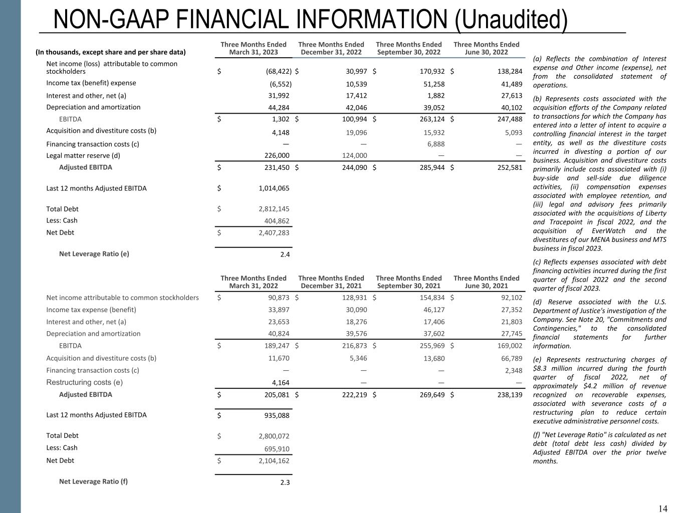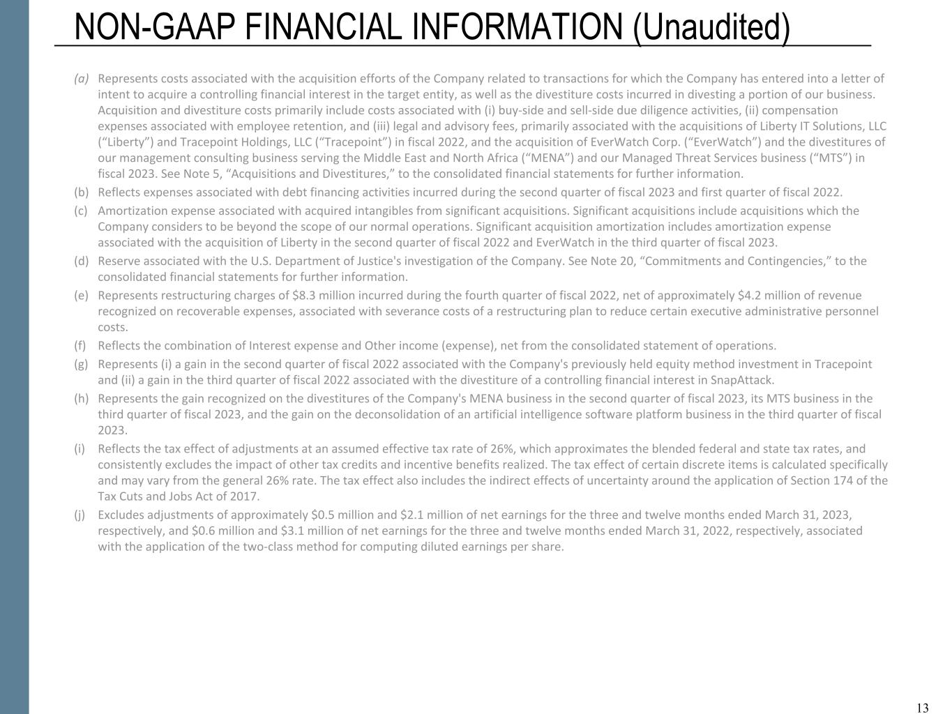 13 NON-GAAP FINANCIAL INFORMATION (Unaudited) 13 (a) Represents costs associated with the acquisition efforts of the Company related to transactions for which the Company has entered into a letter of intent to acquire a controlling financial interest in the target entity, as well as the divestiture costs incurred in divesting a portion of our business. Acquisition and divestiture costs primarily include costs associated with (i) buy-side and sell-side due diligence activities, (ii) compensation expenses associated with employee retention, and (iii) legal and advisory fees, primarily associated with the acquisitions of Liberty IT Solutions, LLC (“Liberty”) and Tracepoint Holdings, LLC (“Tracepoint”) in fiscal 2022, and the acquisition of EverWatch Corp. (“EverWatch”) and the divestitures of our management consulting business serving the Middle East and North Africa (“MENA”) and our Managed Threat Services business (“MTS”) in fiscal 2023. See Note 5, “Acquisitions and Divestitures,” to the consolidated financial statements for further information. (b) Reflects expenses associated with debt financing activities incurred during the second quarter of fiscal 2023 and first quarter of fiscal 2022. (c) Amortization expense associated with acquired intangibles from significant acquisitions. Significant acquisitions include acquisitions which the Company considers to be beyond the scope of our normal operations. Significant acquisition amortization includes amortization expense associated with the acquisition of Liberty in the second quarter of fiscal 2022 and EverWatch in the third quarter of fiscal 2023. (d) Reserve associated with the U.S. Department of Justice's investigation of the Company. See Note 20, “Commitments and Contingencies,” to the consolidated financial statements for further information. (e) Represents restructuring charges of $8.3 million incurred during the fourth quarter of fiscal 2022, net of approximately $4.2 million of revenue recognized on recoverable expenses, associated with severance costs of a restructuring plan to reduce certain executive administrative personnel costs. (f) Reflects the combination of Interest expense and Other income (expense), net from the consolidated statement of operations. (g) Represents (i) a gain in the second quarter of fiscal 2022 associated with the Company's previously held equity method investment in Tracepoint and (ii) a gain in the third quarter of fiscal 2022 associated with the divestiture of a controlling financial interest in SnapAttack. (h) Represents the gain recognized on the divestitures of the Company's MENA business in the second quarter of fiscal 2023, its MTS business in the third quarter of fiscal 2023, and the gain on the deconsolidation of an artificial intelligence software platform business in the third quarter of fiscal 2023. (i) Reflects the tax effect of adjustments at an assumed effective tax rate of 26%, which approximates the blended federal and state tax rates, and consistently excludes the impact of other tax credits and incentive benefits realized. The tax effect of certain discrete items is calculated specifically and may vary from the general 26% rate. The tax effect also includes the indirect effects of uncertainty around the application of Section 174 of the Tax Cuts and Jobs Act of 2017. (j) Excludes adjustments of approximately $0.5 million and $2.1 million of net earnings for the three and twelve months ended March 31, 2023, respectively, and $0.6 million and $3.1 million of net earnings for the three and twelve months ended March 31, 2022, respectively, associated with the application of the two-class method for computing diluted earnings per share.