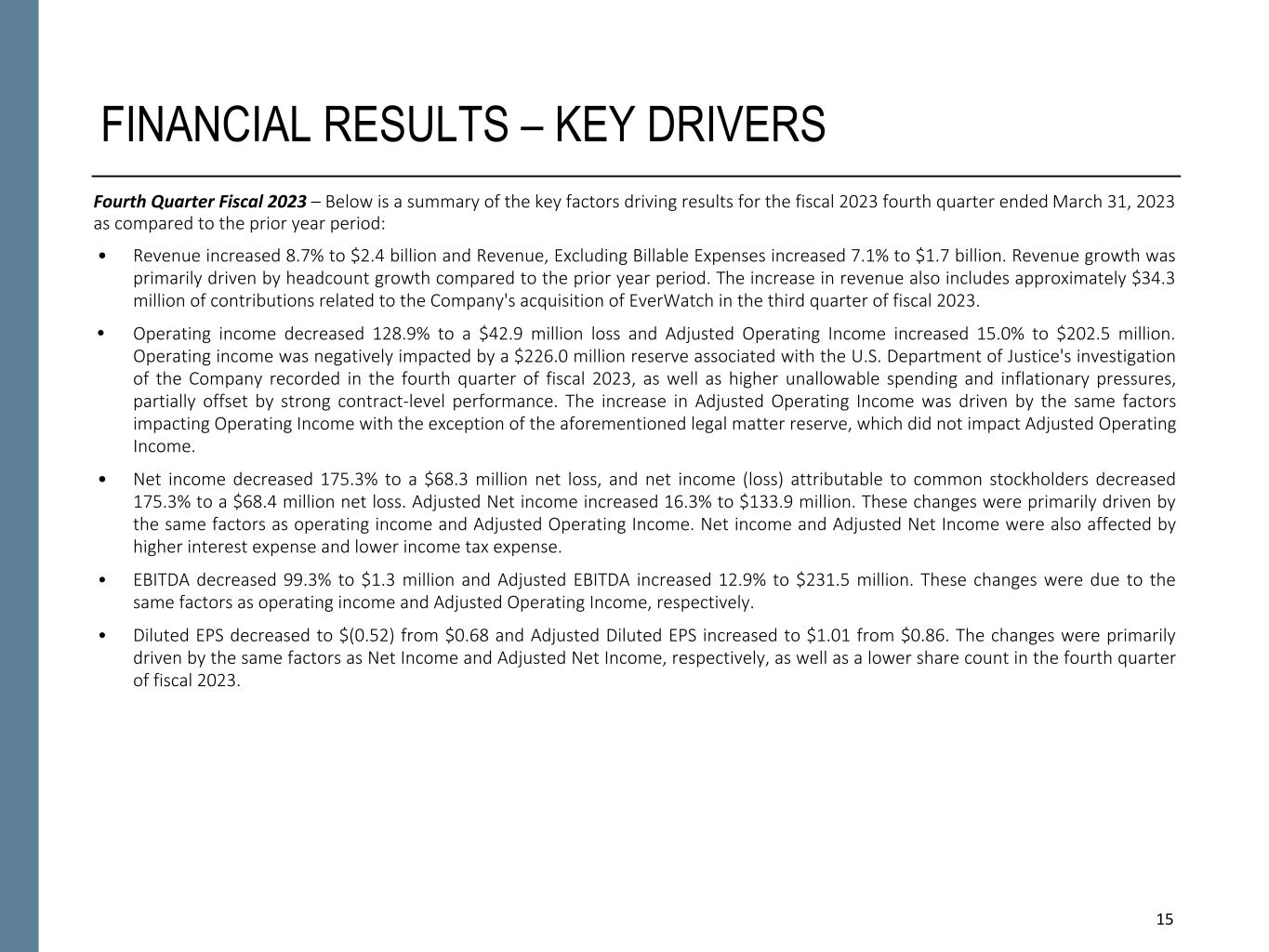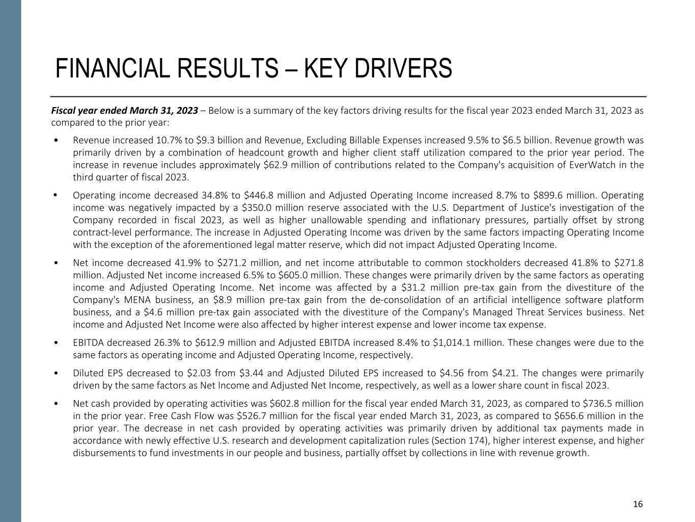 15 FINANCIAL RESULTS – KEY DRIVERS Fourth Quarter Fiscal 2023 – Below is a summary of the key factors driving results for the fiscal 2023 fourth quarter ended March 31, 2023 as compared to the prior year period: • Revenue increased 8.7% to $2.4 billion and Revenue, Excluding Billable Expenses increased 7.1% to $1.7 billion. Revenue growth was primarily driven by headcount growth compared to the prior year period. The increase in revenue also includes approximately $34.3 million of contributions related to the Company's acquisition of EverWatch in the third quarter of fiscal 2023. • Operating income decreased 128.9% to a $42.9 million loss and Adjusted Operating Income increased 15.0% to $202.5 million. Operating income was negatively impacted by a $226.0 million reserve associated with the U.S. Department of Justice's investigation of the Company recorded in the fourth quarter of fiscal 2023, as well as higher unallowable spending and inflationary pressures, partially offset by strong contract-level performance. The increase in Adjusted Operating Income was driven by the same factors impacting Operating Income with the exception of the aforementioned legal matter reserve, which did not impact Adjusted Operating Income. • Net income decreased 175.3% to a $68.3 million net loss, and net income (loss) attributable to common stockholders decreased 175.3% to a $68.4 million net loss. Adjusted Net income increased 16.3% to $133.9 million. These changes were primarily driven by the same factors as operating income and Adjusted Operating Income. Net income and Adjusted Net Income were also affected by higher interest expense and lower income tax expense. • EBITDA decreased 99.3% to $1.3 million and Adjusted EBITDA increased 12.9% to $231.5 million. These changes were due to the same factors as operating income and Adjusted Operating Income, respectively. • Diluted EPS decreased to $(0.52) from $0.68 and Adjusted Diluted EPS increased to $1.01 from $0.86. The changes were primarily driven by the same factors as Net Income and Adjusted Net Income, respectively, as well as a lower share count in the fourth quarter of fiscal 2023.