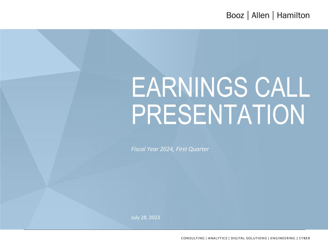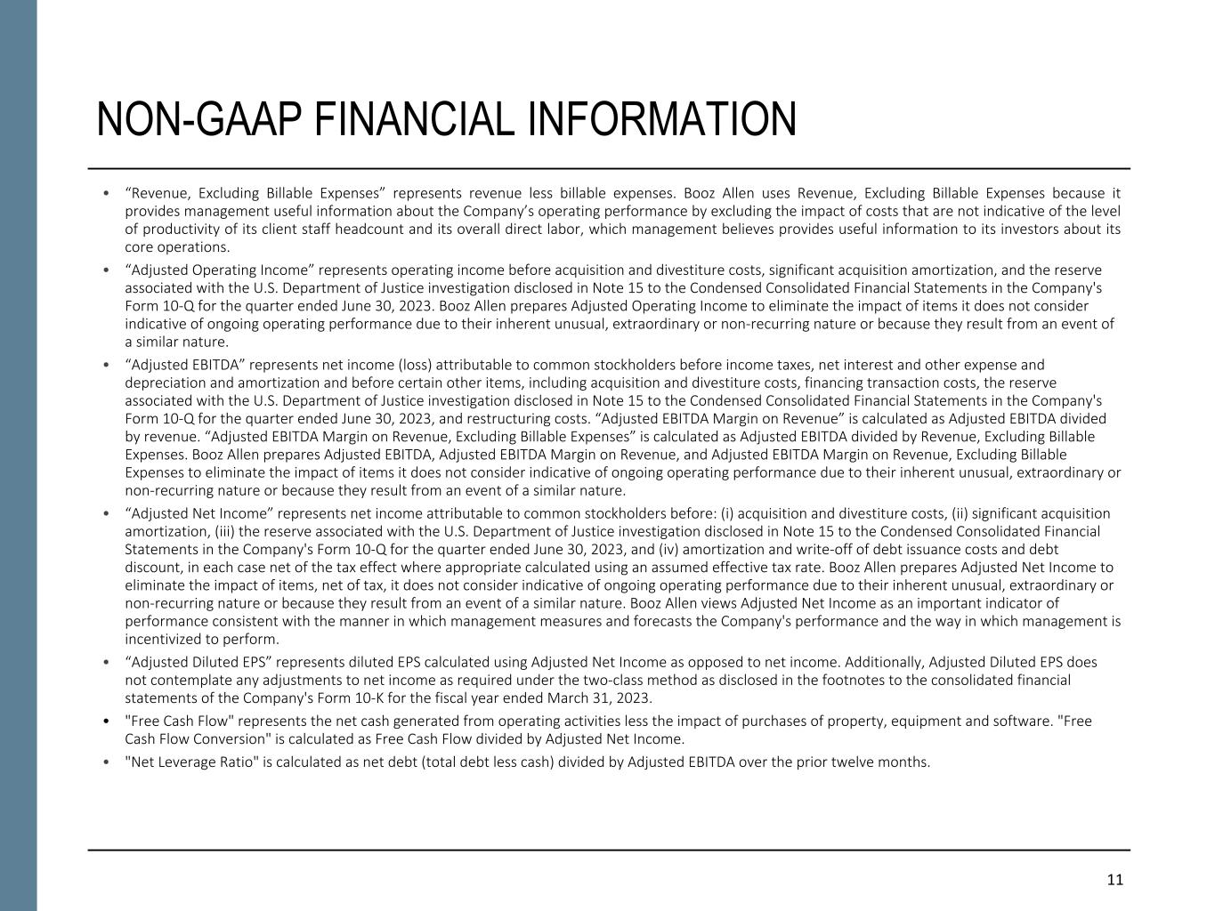 11 NON-GAAP FINANCIAL INFORMATION • “Revenue, Excluding Billable Expenses” represents revenue less billable expenses. Booz Allen uses Revenue, Excluding Billable Expenses because it provides management useful information about the Company’s operating performance by excluding the impact of costs that are not indicative of the level of productivity of its client staff headcount and its overall direct labor, which management believes provides useful information to its investors about its core operations. • “Adjusted Operating Income” represents operating income before acquisition and divestiture costs, significant acquisition amortization, and the reserve associated with the U.S. Department of Justice investigation disclosed in Note 15 to the Condensed Consolidated Financial Statements in the Company's Form 10-Q for the quarter ended June 30, 2023. Booz Allen prepares Adjusted Operating Income to eliminate the impact of items it does not consider indicative of ongoing operating performance due to their inherent unusual, extraordinary or non-recurring nature or because they result from an event of a similar nature. • “Adjusted EBITDA” represents net income (loss) attributable to common stockholders before income taxes, net interest and other expense and depreciation and amortization and before certain other items, including acquisition and divestiture costs, financing transaction costs, the reserve associated with the U.S. Department of Justice investigation disclosed in Note 15 to the Condensed Consolidated Financial Statements in the Company's Form 10-Q for the quarter ended June 30, 2023, and restructuring costs. “Adjusted EBITDA Margin on Revenue” is calculated as Adjusted EBITDA divided by revenue. “Adjusted EBITDA Margin on Revenue, Excluding Billable Expenses” is calculated as Adjusted EBITDA divided by Revenue, Excluding Billable Expenses. Booz Allen prepares Adjusted EBITDA, Adjusted EBITDA Margin on Revenue, and Adjusted EBITDA Margin on Revenue, Excluding Billable Expenses to eliminate the impact of items it does not consider indicative of ongoing operating performance due to their inherent unusual, extraordinary or non-recurring nature or because they result from an event of a similar nature. • “Adjusted Net Income” represents net income attributable to common stockholders before: (i) acquisition and divestiture costs, (ii) significant acquisition amortization, (iii) the reserve associated with the U.S. Department of Justice investigation disclosed in Note 15 to the Condensed Consolidated Financial Statements in the Company's Form 10-Q for the quarter ended June 30, 2023, and (iv) amortization and write-off of debt issuance costs and debt discount, in each case net of the tax effect where appropriate calculated using an assumed effective tax rate. Booz Allen prepares Adjusted Net Income to eliminate the impact of items, net of tax, it does not consider indicative of ongoing operating performance due to their inherent unusual, extraordinary or non-recurring nature or because they result from an event of a similar nature. Booz Allen views Adjusted Net Income as an important indicator of performance consistent with the manner in which management measures and forecasts the Company's performance and the way in which management is incentivized to perform. • “Adjusted Diluted EPS” represents diluted EPS calculated using Adjusted Net Income as opposed to net income. Additionally, Adjusted Diluted EPS does not contemplate any adjustments to net income as required under the two-class method as disclosed in the footnotes to the consolidated financial statements of the Company's Form 10-K for the fiscal year ended March 31, 2023. • "Free Cash Flow" represents the net cash generated from operating activities less the impact of purchases of property, equipment and software. "Free Cash Flow Conversion" is calculated as Free Cash Flow divided by Adjusted Net Income. • "Net Leverage Ratio" is calculated as net debt (total debt less cash) divided by Adjusted EBITDA over the prior twelve months.