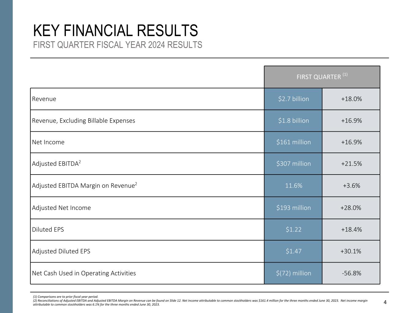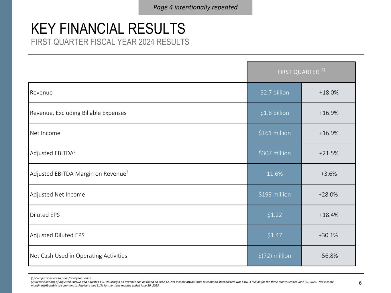 6 KEY FINANCIAL RESULTS FIRST QUARTER FISCAL YEAR 2024 RESULTS (1) Comparisons are to prior fiscal year period. (2) Reconciliations of Adjusted EBITDA and Adjusted EBITDA Margin on Revenue can be found on Slide 12. Net Income attributable to common stockholders was $161.4 million for the three months ended June 30, 2023. Net income margin attributable to common stockholders was 6.1% for the three months ended June 30, 2023. FIRST QUARTER (1) Revenue $2.7 billion +18.0% Revenue, Excluding Billable Expenses $1.8 billion +16.9% Net Income $161 million +16.9% Adjusted EBITDA2 $307 million +21.5% Adjusted EBITDA Margin on Revenue2 11.6% +3.6% Adjusted Net Income $193 million +28.0% Diluted EPS $1.22 +18.4% Adjusted Diluted EPS $1.47 +30.1% Net Cash Used in Operating Activities $(72) million -56.8% Page 4 intentionally repeated