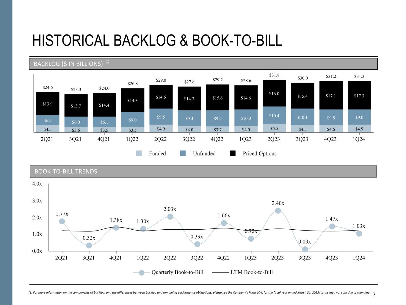 7 $22.0 HISTORICAL BACKLOG & BOOK-TO-BILL (1) For more information on the components of backlog, and the differences between backlog and remaining performance obligations, please see the Company's Form 10-K for the fiscal year ended March 31, 2023; totals may not sum due to rounding. BACKLOG ($ IN BILLIONS) (1) BOOK-TO-BILL TRENDS $24.6 $23.3 $24.0 $26.8 $29.0 $27.8 $29.2 $28.6 $31.8 $30.0 $31.2 $31.3 $4.5 $3.6 $3.5 $3.5 $4.9 $4.0 $3.7 $4.0 $5.5 $4.5 $4.6 $4.9 $6.2 $6.0 $6.1 $9.0 $9.5 $9.4 $9.9 $10.0 $10.4 $10.1 $9.5 $9.0 $13.9 $13.7 $14.4 $14.3 $14.6 $14.3 $15.6 $14.6 $16.0 $15.4 $17.1 $17.3 Funded Unfunded Priced Options 2Q21 3Q21 4Q21 1Q22 2Q22 3Q22 4Q22 1Q23 2Q23 3Q23 4Q23 1Q24 1.77x 0.32x 1.38x 1.30x 2.03x 0.39x 1.66x 0.72x 2.40x 0.09x 1.47x 1.03x Quarterly Book-to-Bill LTM Book-to-Bill 2Q21 3Q21 4Q21 1Q22 2Q22 3Q22 4Q22 1Q23 2Q23 3Q23 4Q23 1Q24 0.0x 1.0x 2.0x 3.0x 4.0x