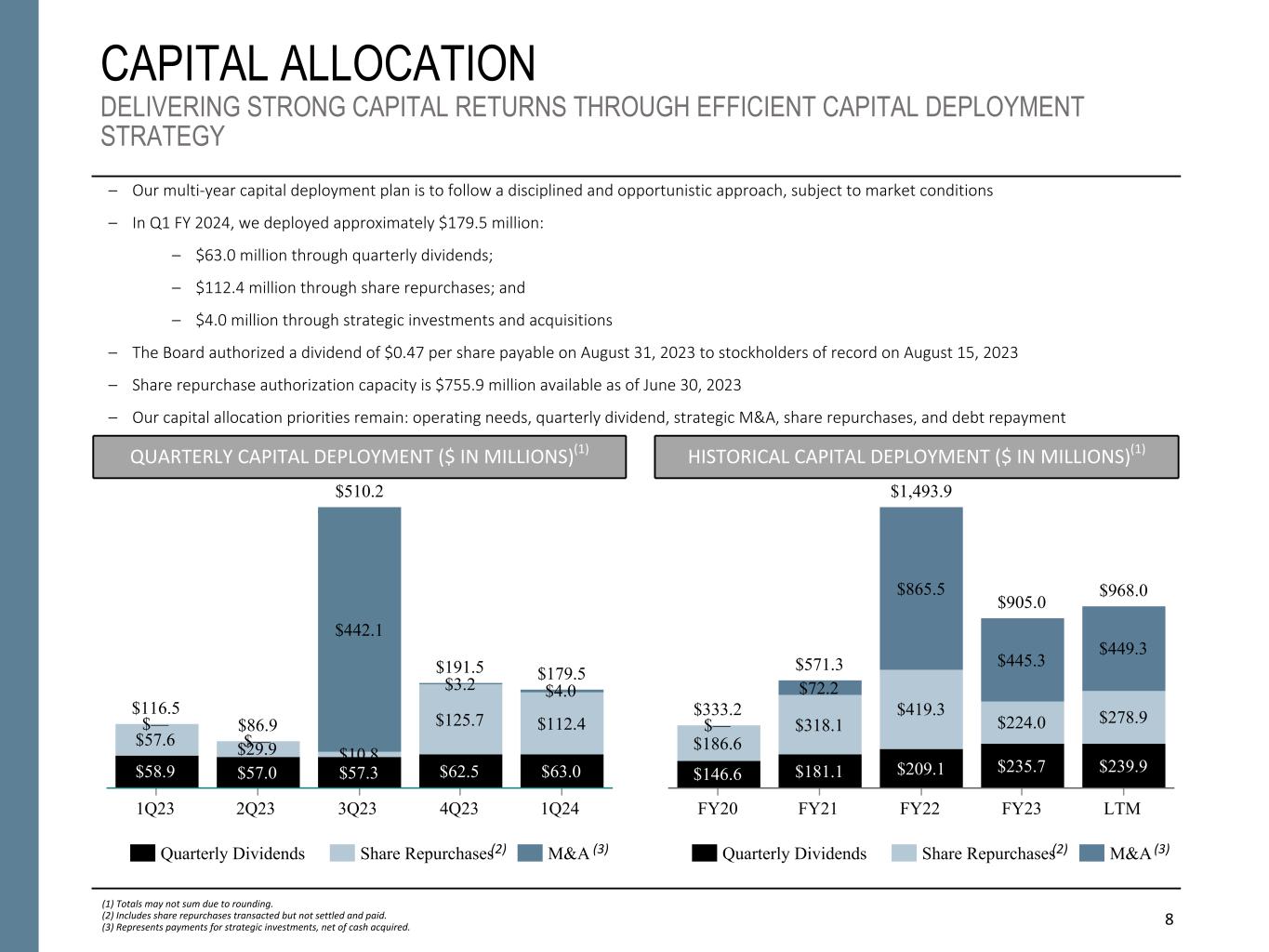 8 CAPITAL ALLOCATION DELIVERING STRONG CAPITAL RETURNS THROUGH EFFICIENT CAPITAL DEPLOYMENT STRATEGY – Our multi-year capital deployment plan is to follow a disciplined and opportunistic approach, subject to market conditions – In Q1 FY 2024, we deployed approximately $179.5 million: – $63.0 million through quarterly dividends; – $112.4 million through share repurchases; and – $4.0 million through strategic investments and acquisitions – The Board authorized a dividend of $0.47 per share payable on August 31, 2023 to stockholders of record on August 15, 2023 – Share repurchase authorization capacity is $755.9 million available as of June 30, 2023 – Our capital allocation priorities remain: operating needs, quarterly dividend, strategic M&A, share repurchases, and debt repayment HISTORICAL CAPITAL DEPLOYMENT ($ IN MILLIONS)(1)QUARTERLY CAPITAL DEPLOYMENT ($ IN MILLIONS)(1) $116.5 $86.9 $510.2 $191.5 $179.5 $58.9 $57.0 $57.3 $62.5 $63.0 $57.6 $29.9 $10.8 $125.7 $112.4$— $— $442.1 $3.2 $4.0 Quarterly Dividends Share Repurchases M&A 1Q23 2Q23 3Q23 4Q23 1Q24 $333.2 $571.3 $1,493.9 $905.0 $968.0 $146.6 $181.1 $209.1 $235.7 $239.9 $186.6 $318.1 $419.3 $224.0 $278.9$— $72.2 $865.5 $445.3 $449.3 Quarterly Dividends Share Repurchases M&A FY20 FY21 FY22 FY23 LTM (3) (1) Totals may not sum due to rounding. (2) Includes share repurchases transacted but not settled and paid. (3) Represents payments for strategic investments, net of cash acquired. (2) (3) (2)