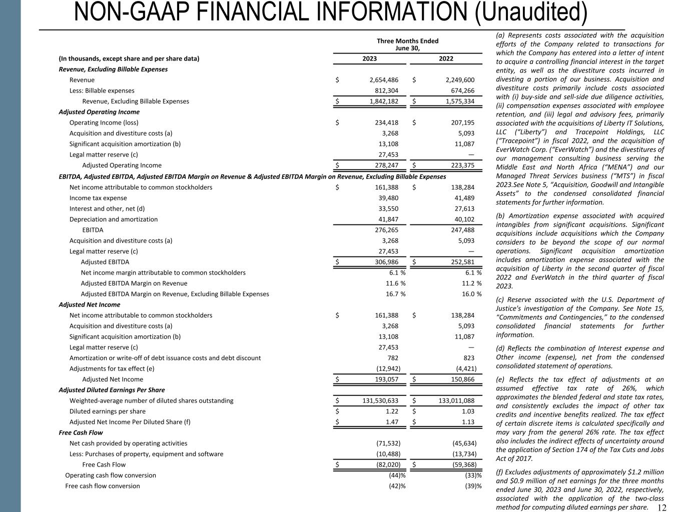 12 NON-GAAP FINANCIAL INFORMATION (Unaudited) Three Months Ended June 30, (In thousands, except share and per share data) 2023 2022 Revenue, Excluding Billable Expenses Revenue $ 2,654,486 $ 2,249,600 Less: Billable expenses 812,304 674,266 Revenue, Excluding Billable Expenses $ 1,842,182 $ 1,575,334 Adjusted Operating Income Operating Income (loss) $ 234,418 $ 207,195 Acquisition and divestiture costs (a) 3,268 5,093 Significant acquisition amortization (b) 13,108 11,087 Legal matter reserve (c) 27,453 — Adjusted Operating Income $ 278,247 $ 223,375 EBITDA, Adjusted EBITDA, Adjusted EBITDA Margin on Revenue & Adjusted EBITDA Margin on Revenue, Excluding Billable Expenses Net income attributable to common stockholders $ 161,388 $ 138,284 Income tax expense 39,480 41,489 Interest and other, net (d) 33,550 27,613 Depreciation and amortization 41,847 40,102 EBITDA 276,265 247,488 Acquisition and divestiture costs (a) 3,268 5,093 Legal matter reserve (c) 27,453 — Adjusted EBITDA $ 306,986 $ 252,581 Net income margin attributable to common stockholders 6.1 % 6.1 % Adjusted EBITDA Margin on Revenue 11.6 % 11.2 % Adjusted EBITDA Margin on Revenue, Excluding Billable Expenses 16.7 % 16.0 % Adjusted Net Income Net income attributable to common stockholders $ 161,388 $ 138,284 Acquisition and divestiture costs (a) 3,268 5,093 Significant acquisition amortization (b) 13,108 11,087 Legal matter reserve (c) 27,453 — Amortization or write-off of debt issuance costs and debt discount 782 823 Adjustments for tax effect (e) (12,942) (4,421) Adjusted Net Income $ 193,057 $ 150,866 Adjusted Diluted Earnings Per Share Weighted-average number of diluted shares outstanding $ 131,530,633 $ 133,011,088 Diluted earnings per share $ 1.22 $ 1.03 Adjusted Net Income Per Diluted Share (f) $ 1.47 $ 1.13 Free Cash Flow Net cash provided by operating activities (71,532) (45,634) Less: Purchases of property, equipment and software (10,488) (13,734) Free Cash Flow $ (82,020) $ (59,368) Operating cash flow conversion (44) % (33) % Free cash flow conversion (42) % (39) % 12 (a) Represents costs associated with the acquisition efforts of the Company related to transactions for which the Company has entered into a letter of intent to acquire a controlling financial interest in the target entity, as well as the divestiture costs incurred in divesting a portion of our business. Acquisition and divestiture costs primarily include costs associated with (i) buy-side and sell-side due diligence activities, (ii) compensation expenses associated with employee retention, and (iii) legal and advisory fees, primarily associated with the acquisitions of Liberty IT Solutions, LLC (“Liberty”) and Tracepoint Holdings, LLC (“Tracepoint”) in fiscal 2022, and the acquisition of EverWatch Corp. (“EverWatch”) and the divestitures of our management consulting business serving the Middle East and North Africa (“MENA”) and our Managed Threat Services business (“MTS”) in fiscal 2023.See Note 5, “Acquisition, Goodwill and Intangible Assets” to the condensed consolidated financial statements for further information. (b) Amortization expense associated with acquired intangibles from significant acquisitions. Significant acquisitions include acquisitions which the Company considers to be beyond the scope of our normal operations. Significant acquisition amortization includes amortization expense associated with the acquisition of Liberty in the second quarter of fiscal 2022 and EverWatch in the third quarter of fiscal 2023. (c) Reserve associated with the U.S. Department of Justice's investigation of the Company. See Note 15, “Commitments and Contingencies,” to the condensed consolidated financial statements for further information. (d) Reflects the combination of Interest expense and Other income (expense), net from the condensed consolidated statement of operations. (e) Reflects the tax effect of adjustments at an assumed effective tax rate of 26%, which approximates the blended federal and state tax rates, and consistently excludes the impact of other tax credits and incentive benefits realized. The tax effect of certain discrete items is calculated specifically and may vary from the general 26% rate. The tax effect also includes the indirect effects of uncertainty around the application of Section 174 of the Tax Cuts and Jobs Act of 2017. (f) Excludes adjustments of approximately $1.2 million and $0.9 million of net earnings for the three months ended June 30, 2023 and June 30, 2022, respectively, associated with the application of the two-class method for computing diluted earnings per share.