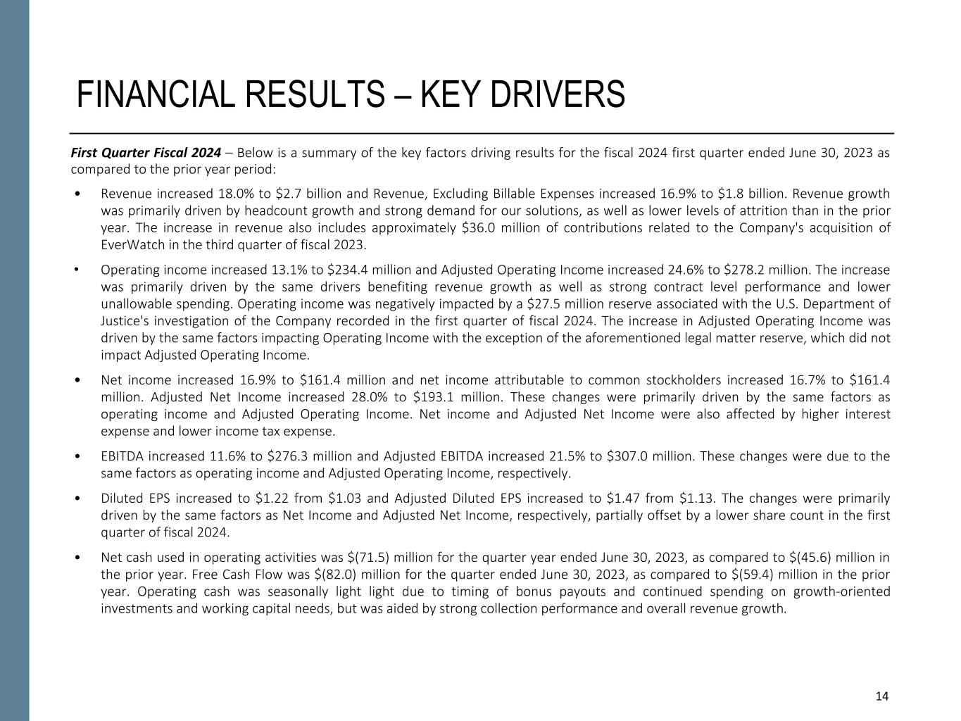 14 FINANCIAL RESULTS – KEY DRIVERS First Quarter Fiscal 2024 – Below is a summary of the key factors driving results for the fiscal 2024 first quarter ended June 30, 2023 as compared to the prior year period: • Revenue increased 18.0% to $2.7 billion and Revenue, Excluding Billable Expenses increased 16.9% to $1.8 billion. Revenue growth was primarily driven by headcount growth and strong demand for our solutions, as well as lower levels of attrition than in the prior year. The increase in revenue also includes approximately $36.0 million of contributions related to the Company's acquisition of EverWatch in the third quarter of fiscal 2023. • Operating income increased 13.1% to $234.4 million and Adjusted Operating Income increased 24.6% to $278.2 million. The increase was primarily driven by the same drivers benefiting revenue growth as well as strong contract level performance and lower unallowable spending. Operating income was negatively impacted by a $27.5 million reserve associated with the U.S. Department of Justice's investigation of the Company recorded in the first quarter of fiscal 2024. The increase in Adjusted Operating Income was driven by the same factors impacting Operating Income with the exception of the aforementioned legal matter reserve, which did not impact Adjusted Operating Income. • Net income increased 16.9% to $161.4 million and net income attributable to common stockholders increased 16.7% to $161.4 million. Adjusted Net Income increased 28.0% to $193.1 million. These changes were primarily driven by the same factors as operating income and Adjusted Operating Income. Net income and Adjusted Net Income were also affected by higher interest expense and lower income tax expense. • EBITDA increased 11.6% to $276.3 million and Adjusted EBITDA increased 21.5% to $307.0 million. These changes were due to the same factors as operating income and Adjusted Operating Income, respectively. • Diluted EPS increased to $1.22 from $1.03 and Adjusted Diluted EPS increased to $1.47 from $1.13. The changes were primarily driven by the same factors as Net Income and Adjusted Net Income, respectively, partially offset by a lower share count in the first quarter of fiscal 2024. • Net cash used in operating activities was $(71.5) million for the quarter year ended June 30, 2023, as compared to $(45.6) million in the prior year. Free Cash Flow was $(82.0) million for the quarter ended June 30, 2023, as compared to $(59.4) million in the prior year. Operating cash was seasonally light light due to timing of bonus payouts and continued spending on growth-oriented investments and working capital needs, but was aided by strong collection performance and overall revenue growth.