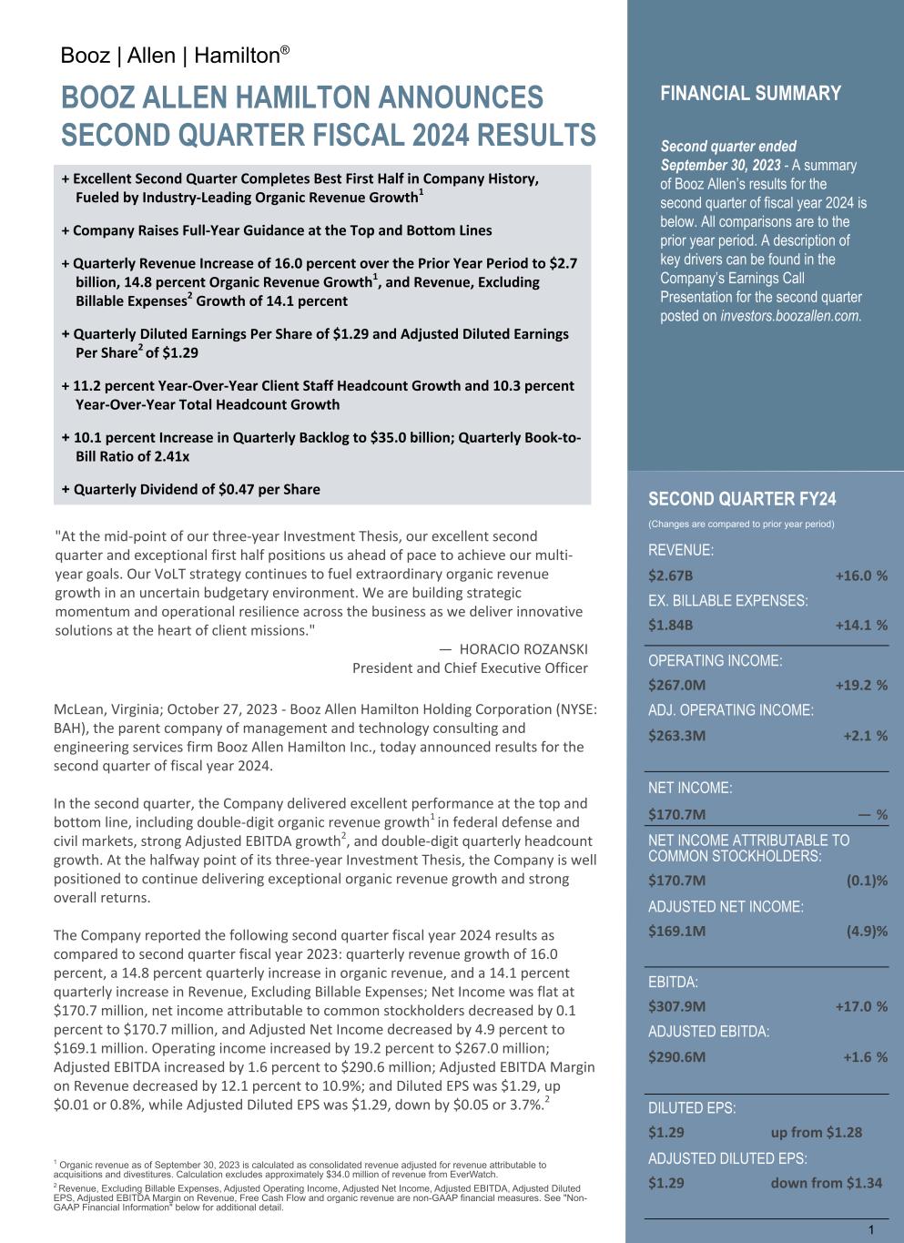 Booz | Allen | Hamilton® BOOZ ALLEN HAMILTON ANNOUNCES SECOND QUARTER FISCAL 2024 RESULTS + Excellent Second Quarter Completes Best First Half in Company History, Fueled by Industry-Leading Organic Revenue Growth1 + Company Raises Full-Year Guidance at the Top and Bottom Lines + Quarterly Revenue Increase of 16.0 percent over the Prior Year Period to $2.7 billion, 14.8 percent Organic Revenue Growth1, and Revenue, Excluding Billable Expenses2 Growth of 14.1 percent + Quarterly Diluted Earnings Per Share of $1.29 and Adjusted Diluted Earnings Per Share2 of $1.29 + 11.2 percent Year-Over-Year Client Staff Headcount Growth and 10.3 percent Year-Over-Year Total Headcount Growth + 10.1 percent Increase in Quarterly Backlog to $35.0 billion; Quarterly Book-to- Bill Ratio of 2.41x + Quarterly Dividend of $0.47 per Share "At the mid-point of our three-year Investment Thesis, our excellent second quarter and exceptional first half positions us ahead of pace to achieve our multi- year goals. Our VoLT strategy continues to fuel extraordinary organic revenue growth in an uncertain budgetary environment. We are building strategic momentum and operational resilience across the business as we deliver innovative solutions at the heart of client missions." — HORACIO ROZANSKI President and Chief Executive Officer McLean, Virginia; October 27, 2023 - Booz Allen Hamilton Holding Corporation (NYSE: BAH), the parent company of management and technology consulting and engineering services firm Booz Allen Hamilton Inc., today announced results for the second quarter of fiscal year 2024. In the second quarter, the Company delivered excellent performance at the top and bottom line, including double-digit organic revenue growth1 in federal defense and civil markets, strong Adjusted EBITDA growth2, and double-digit quarterly headcount growth. At the halfway point of its three-year Investment Thesis, the Company is well positioned to continue delivering exceptional organic revenue growth and strong overall returns. The Company reported the following second quarter fiscal year 2024 results as compared to second quarter fiscal year 2023: quarterly revenue growth of 16.0 percent, a 14.8 percent quarterly increase in organic revenue, and a 14.1 percent quarterly increase in Revenue, Excluding Billable Expenses; Net Income was flat at $170.7 million, net income attributable to common stockholders decreased by 0.1 percent to $170.7 million, and Adjusted Net Income decreased by 4.9 percent to $169.1 million. Operating income increased by 19.2 percent to $267.0 million; Adjusted EBITDA increased by 1.6 percent to $290.6 million; Adjusted EBITDA Margin on Revenue decreased by 12.1 percent to 10.9%; and Diluted EPS was $1.29, up $0.01 or 0.8%, while Adjusted Diluted EPS was $1.29, down by $0.05 or 3.7%.2 1 Organic revenue as of September 30, 2023 is calculated as consolidated revenue adjusted for revenue attributable to acquisitions and divestitures. Calculation excludes approximately $34.0 million of revenue from EverWatch. 2 Revenue, Excluding Billable Expenses, Adjusted Operating Income, Adjusted Net Income, Adjusted EBITDA, Adjusted Diluted EPS, Adjusted EBITDA Margin on Revenue, Free Cash Flow and organic revenue are non-GAAP financial measures. See "Non- GAAP Financial Information" below for additional detail. 1 SECOND QUARTER FY24 (Changes are compared to prior year period) REVENUE: $2.67B +16.0 % EX. BILLABLE EXPENSES: $1.84B +14.1 % OPERATING INCOME: $267.0M +19.2 % ADJ. OPERATING INCOME: $263.3M +2.1 % NET INCOME: $170.7M — % NET INCOME ATTRIBUTABLE TO COMMON STOCKHOLDERS: $170.7M (0.1) % ADJUSTED NET INCOME: $169.1M (4.9) % EBITDA: $307.9M +17.0 % ADJUSTED EBITDA: $290.6M +1.6 % DILUTED EPS: $1.29 up from $1.28 ADJUSTED DILUTED EPS: $1.29 down from $1.34 FINANCIAL SUMMARY Second quarter ended September 30, 2023 - A summary of Booz Allen’s results for the second quarter of fiscal year 2024 is below. All comparisons are to the prior year period. A description of key drivers can be found in the Company’s Earnings Call Presentation for the second quarter posted on investors.boozallen.com.