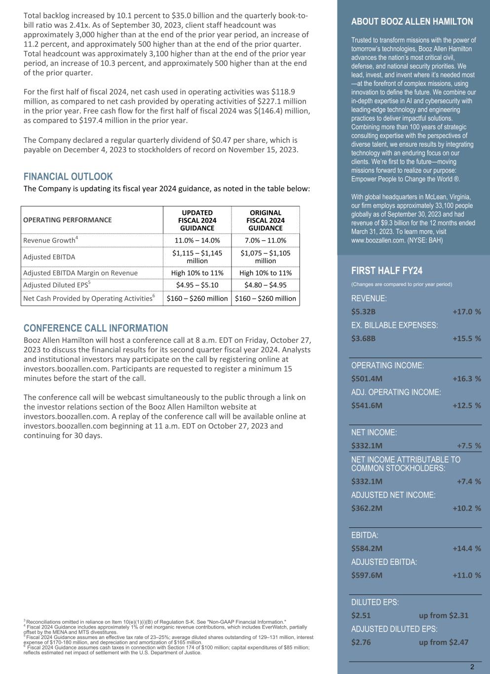 FINANCIAL OUTLOOK The Company is updating its fiscal year 2024 guidance, as noted in the table below: CONFERENCE CALL INFORMATION Booz Allen Hamilton will host a conference call at 8 a.m. EDT on Friday, October 27, 2023 to discuss the financial results for its second quarter fiscal year 2024. Analysts and institutional investors may participate on the call by registering online at investors.boozallen.com. Participants are requested to register a minimum 15 minutes before the start of the call. The conference call will be webcast simultaneously to the public through a link on the investor relations section of the Booz Allen Hamilton website at investors.boozallen.com. A replay of the conference call will be available online at investors.boozallen.com beginning at 11 a.m. EDT on October 27, 2023 and continuing for 30 days. 3 Reconciliations omitted in reliance on Item 10(e)(1)(i)(B) of Regulation S-K. See "Non-GAAP Financial Information." 4 Fiscal 2024 Guidance includes approximately 1% of net inorganic revenue contributions, which includes EverWatch, partially offset by the MENA and MTS divestitures. 5 Fiscal 2024 Guidance assumes an effective tax rate of 23–25%; average diluted shares outstanding of 129–131 million, interest expense of $170-180 million, and depreciation and amortization of $165 million. 6 Fiscal 2024 Guidance assumes cash taxes in connection with Section 174 of $100 million; capital expenditures of $85 million; reflects estimated net impact of settlement with the U.S. Department of Justice. 2 Total backlog increased by 10.1 percent to $35.0 billion and the quarterly book-to- bill ratio was 2.41x. As of September 30, 2023, client staff headcount was approximately 3,000 higher than at the end of the prior year period, an increase of 11.2 percent, and approximately 500 higher than at the end of the prior quarter. Total headcount was approximately 3,100 higher than at the end of the prior year period, an increase of 10.3 percent, and approximately 500 higher than at the end of the prior quarter. For the first half of fiscal 2024, net cash used in operating activities was $118.9 million, as compared to net cash provided by operating activities of $227.1 million in the prior year. Free cash flow for the first half of fiscal 2024 was $(146.4) million, as compared to $197.4 million in the prior year. The Company declared a regular quarterly dividend of $0.47 per share, which is payable on December 4, 2023 to stockholders of record on November 15, 2023. ABOUT BOOZ ALLEN HAMILTON Trusted to transform missions with the power of tomorrow’s technologies, Booz Allen Hamilton advances the nation’s most critical civil, defense, and national security priorities. We lead, invest, and invent where it’s needed most —at the forefront of complex missions, using innovation to define the future. We combine our in-depth expertise in AI and cybersecurity with leading-edge technology and engineering practices to deliver impactful solutions. Combining more than 100 years of strategic consulting expertise with the perspectives of diverse talent, we ensure results by integrating technology with an enduring focus on our clients. We’re first to the future—moving missions forward to realize our purpose: Empower People to Change the World ®. With global headquarters in McLean, Virginia, our firm employs approximately 33,100 people globally as of September 30, 2023 and had revenue of $9.3 billion for the 12 months ended March 31, 2023. To learn more, visit www.boozallen.com. (NYSE: BAH) OPERATING PERFORMANCE UPDATED FISCAL 2024 GUIDANCE ORIGINAL FISCAL 2024 GUIDANCE Revenue Growth4 11.0% – 14.0% 7.0% – 11.0% Adjusted EBITDA $1,115 – $1,145 million $1,075 – $1,105 million Adjusted EBITDA Margin on Revenue High 10% to 11% High 10% to 11% Adjusted Diluted EPS5 $4.95 – $5.10 $4.80 – $4.95 Net Cash Provided by Operating Activities6 $160 – $260 million $160 – $260 million FIRST HALF FY24 (Changes are compared to prior year period) REVENUE: $5.32B +17.0 % EX. BILLABLE EXPENSES: $3.68B +15.5 % OPERATING INCOME: $501.4M +16.3 % ADJ. OPERATING INCOME: $541.6M +12.5 % NET INCOME: $332.1M +7.5 % NET INCOME ATTRIBUTABLE TO COMMON STOCKHOLDERS: $332.1M +7.4 % ADJUSTED NET INCOME: $362.2M +10.2 % EBITDA: $584.2M +14.4 % ADJUSTED EBITDA: $597.6M +11.0 % DILUTED EPS: $2.51 up from $2.31 ADJUSTED DILUTED EPS: $2.76 up from $2.47 2