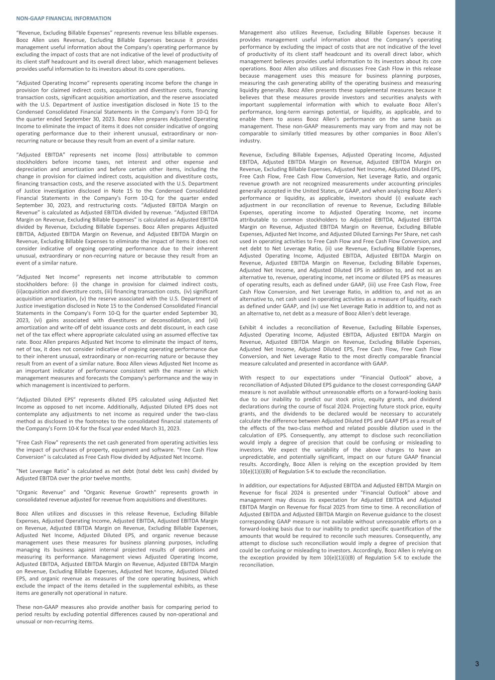 NON-GAAP FINANCIAL INFORMATION “Revenue, Excluding Billable Expenses” represents revenue less billable expenses. Booz Allen uses Revenue, Excluding Billable Expenses because it provides management useful information about the Company’s operating performance by excluding the impact of costs that are not indicative of the level of productivity of its client staff headcount and its overall direct labor, which management believes provides useful information to its investors about its core operations. “Adjusted Operating Income” represents operating income before the change in provision for claimed indirect costs, acquisition and divestiture costs, financing transaction costs, significant acquisition amortization, and the reserve associated with the U.S. Department of Justice investigation disclosed in Note 15 to the Condensed Consolidated Financial Statements in the Company's Form 10-Q for the quarter ended September 30, 2023. Booz Allen prepares Adjusted Operating Income to eliminate the impact of items it does not consider indicative of ongoing operating performance due to their inherent unusual, extraordinary or non- recurring nature or because they result from an event of a similar nature. “Adjusted EBITDA” represents net income (loss) attributable to common stockholders before income taxes, net interest and other expense and depreciation and amortization and before certain other items, including the change in provision for claimed indirect costs, acquisition and divestiture costs, financing transaction costs, and the reserve associated with the U.S. Department of Justice investigation disclosed in Note 15 to the Condensed Consolidated Financial Statements in the Company's Form 10-Q for the quarter ended September 30, 2023, and restructuring costs. “Adjusted EBITDA Margin on Revenue” is calculated as Adjusted EBITDA divided by revenue. “Adjusted EBITDA Margin on Revenue, Excluding Billable Expenses” is calculated as Adjusted EBITDA divided by Revenue, Excluding Billable Expenses. Booz Allen prepares Adjusted EBITDA, Adjusted EBITDA Margin on Revenue, and Adjusted EBITDA Margin on Revenue, Excluding Billable Expenses to eliminate the impact of items it does not consider indicative of ongoing operating performance due to their inherent unusual, extraordinary or non-recurring nature or because they result from an event of a similar nature. “Adjusted Net Income” represents net income attributable to common stockholders before: (i) the change in provision for claimed indirect costs, (ii)acquisition and divestiture costs, (iii) financing transaction costs, (iv) significant acquisition amortization, (v) the reserve associated with the U.S. Department of Justice investigation disclosed in Note 15 to the Condensed Consolidated Financial Statements in the Company's Form 10-Q for the quarter ended September 30, 2023, (vi) gains associated with divestitures or deconsolidation, and (vii) amortization and write-off of debt issuance costs and debt discount, in each case net of the tax effect where appropriate calculated using an assumed effective tax rate. Booz Allen prepares Adjusted Net Income to eliminate the impact of items, net of tax, it does not consider indicative of ongoing operating performance due to their inherent unusual, extraordinary or non-recurring nature or because they result from an event of a similar nature. Booz Allen views Adjusted Net Income as an important indicator of performance consistent with the manner in which management measures and forecasts the Company's performance and the way in which management is incentivized to perform. “Adjusted Diluted EPS” represents diluted EPS calculated using Adjusted Net Income as opposed to net income. Additionally, Adjusted Diluted EPS does not contemplate any adjustments to net income as required under the two-class method as disclosed in the footnotes to the consolidated financial statements of the Company's Form 10-K for the fiscal year ended March 31, 2023. "Free Cash Flow" represents the net cash generated from operating activities less the impact of purchases of property, equipment and software. "Free Cash Flow Conversion" is calculated as Free Cash Flow divided by Adjusted Net Income. "Net Leverage Ratio" is calculated as net debt (total debt less cash) divided by Adjusted EBITDA over the prior twelve months. "Organic Revenue" and "Organic Revenue Growth" represents growth in consolidated revenue adjusted for revenue from acquisitions and divestitures. Booz Allen utilizes and discusses in this release Revenue, Excluding Billable Expenses, Adjusted Operating Income, Adjusted EBITDA, Adjusted EBITDA Margin on Revenue, Adjusted EBITDA Margin on Revenue, Excluding Billable Expenses, Adjusted Net Income, Adjusted Diluted EPS, and organic revenue because management uses these measures for business planning purposes, including managing its business against internal projected results of operations and measuring its performance. Management views Adjusted Operating Income, Adjusted EBITDA, Adjusted EBITDA Margin on Revenue, Adjusted EBITDA Margin on Revenue, Excluding Billable Expenses, Adjusted Net Income, Adjusted Diluted EPS, and organic revenue as measures of the core operating business, which exclude the impact of the items detailed in the supplemental exhibits, as these items are generally not operational in nature. These non-GAAP measures also provide another basis for comparing period to period results by excluding potential differences caused by non-operational and unusual or non-recurring items. Management also utilizes Revenue, Excluding Billable Expenses because it provides management useful information about the Company’s operating performance by excluding the impact of costs that are not indicative of the level of productivity of its client staff headcount and its overall direct labor, which management believes provides useful information to its investors about its core operations. Booz Allen als