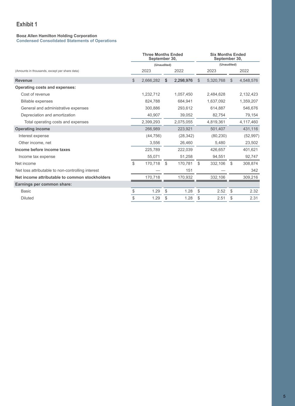 Exhibit 1 Booz Allen Hamilton Holding Corporation Condensed Consolidated Statements of Operations 5 Three Months Ended September 30, Six Months Ended September 30, (Unaudited) (Unaudited) (Amounts in thousands, except per share data) 2023 2022 2023 2022 Revenue $ 2,666,282 $ 2,298,976 $ 5,320,768 $ 4,548,576 Operating costs and expenses: Cost of revenue 1,232,712 1,057,450 2,484,628 2,132,423 Billable expenses 824,788 684,941 1,637,092 1,359,207 General and administrative expenses 300,886 293,612 614,887 546,676 Depreciation and amortization 40,907 39,052 82,754 79,154 Total operating costs and expenses 2,399,293 2,075,055 4,819,361 4,117,460 Operating income 266,989 223,921 501,407 431,116 Interest expense (44,756) (28,342) (80,230) (52,997) Other income, net 3,556 26,460 5,480 23,502 Income before income taxes 225,789 222,039 426,657 401,621 Income tax expense 55,071 51,258 94,551 92,747 Net income $ 170,718 $ 170,781 $ 332,106 $ 308,874 Net loss attributable to non-controlling interest — 151 — 342 Net income attributable to common stockholders 170,718 170,932 332,106 309,216 Earnings per common share: Basic $ 1.29 $ 1.28 $ 2.52 $ 2.32 Diluted $ 1.29 $ 1.28 $ 2.51 $ 2.31 5