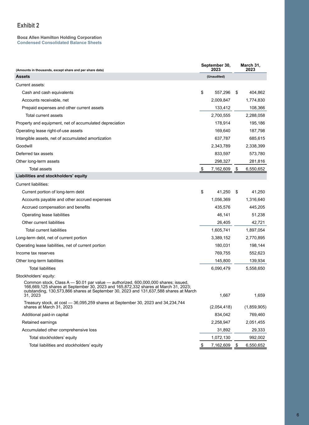 Exhibit 2 Booz Allen Hamilton Holding Corporation Condensed Consolidated Balance Sheets (Amounts in thousands, except share and per share data) September 30, 2023 March 31, 2023 Assets (Unaudited) Current assets: Cash and cash equivalents $ 557,296 $ 404,862 Accounts receivable, net 2,009,847 1,774,830 Prepaid expenses and other current assets 133,412 108,366 Total current assets 2,700,555 2,288,058 Property and equipment, net of accumulated depreciation 178,914 195,186 Operating lease right-of-use assets 169,640 187,798 Intangible assets, net of accumulated amortization 637,787 685,615 Goodwill 2,343,789 2,338,399 Deferred tax assets 833,597 573,780 Other long-term assets 298,327 281,816 Total assets $ 7,162,609 $ 6,550,652 Liabilities and stockholders' equity Current liabilities: Current portion of long-term debt $ 41,250 $ 41,250 Accounts payable and other accrued expenses 1,056,369 1,316,640 Accrued compensation and benefits 435,576 445,205 Operating lease liabilities 46,141 51,238 Other current liabilities 26,405 42,721 Total current liabilities 1,605,741 1,897,054 Long-term debt, net of current portion 3,389,152 2,770,895 Operating lease liabilities, net of current portion 180,031 198,144 Income tax reserves 769,755 552,623 Other long-term liabilities 145,800 139,934 Total liabilities 6,090,479 5,558,650 Stockholders’ equity: Common stock, Class A — $0.01 par value — authorized, 600,000,000 shares; issued, 166,669,125 shares at September 30, 2023 and 165,872,332 shares at March 31, 2023; outstanding, 130,573,866 shares at September 30, 2023 and 131,637,588 shares at March 31, 2023 1,667 1,659 Treasury stock, at cost — 36,095,259 shares at September 30, 2023 and 34,234,744 shares at March 31, 2023 (2,054,418) (1,859,905) Additional paid-in capital 834,042 769,460 Retained earnings 2,258,947 2,051,455 Accumulated other comprehensive loss 31,892 29,333 Total stockholders’ equity 1,072,130 992,002 Total liabilities and stockholders’ equity $ 7,162,609 $ 6,550,652 66