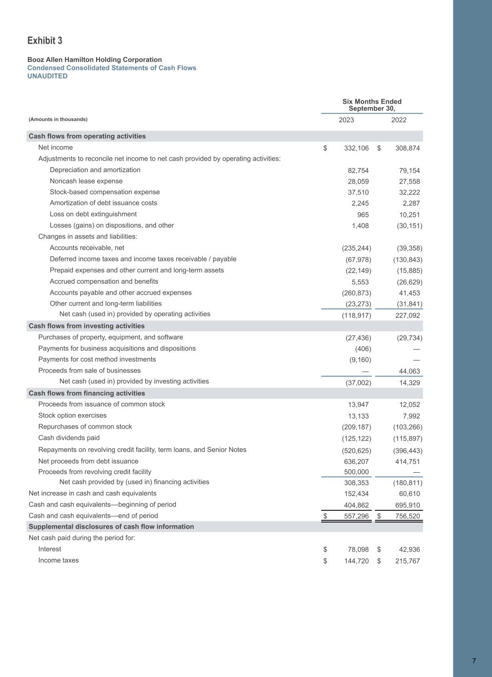 Exhibit 3 Booz Allen Hamilton Holding Corporation Condensed Consolidated Statements of Cash Flows UNAUDITED 7 Six Months Ended September 30, (Amounts in thousands) 2023 2022 Cash flows from operating activities Net income $ 332,106 $ 308,874 Adjustments to reconcile net income to net cash provided by operating activities: Depreciation and amortization 82,754 79,154 Noncash lease expense 28,059 27,558 Stock-based compensation expense 37,510 32,222 Amortization of debt issuance costs 2,245 2,287 Loss on debt extinguishment 965 10,251 Losses (gains) on dispositions, and other 1,408 (30,151) Changes in assets and liabilities: Accounts receivable, net (235,244) (39,358) Deferred income taxes and income taxes receivable / payable (67,978) (130,843) Prepaid expenses and other current and long-term assets (22,149) (15,885) Accrued compensation and benefits 5,553 (26,629) Accounts payable and other accrued expenses (260,873) 41,453 Other current and long-term liabilities (23,273) (31,841) Net cash (used in) provided by operating activities (118,917) 227,092 Cash flows from investing activities Purchases of property, equipment, and software (27,436) (29,734) Payments for business acquisitions and dispositions (406) — Payments for cost method investments (9,160) — Proceeds from sale of businesses — 44,063 Net cash (used in) provided by investing activities (37,002) 14,329 Cash flows from financing activities Proceeds from issuance of common stock 13,947 12,052 Stock option exercises 13,133 7,992 Repurchases of common stock (209,187) (103,266) Cash dividends paid (125,122) (115,897) Repayments on revolving credit facility, term loans, and Senior Notes (520,625) (396,443) Net proceeds from debt issuance 636,207 414,751 Proceeds from revolving credit facility 500,000 — Net cash provided by (used in) financing activities 308,353 (180,811) Net increase in cash and cash equivalents 152,434 60,610 Cash and cash equivalents––beginning of period 404,862 695,910 Cash and cash equivalents––end of period $ 557,296 $ 756,520 Supplemental disclosures of cash flow information Net cash paid during the period for: Interest $ 78,098 $ 42,936 Income taxes $ 144,720 $ 215,767 7