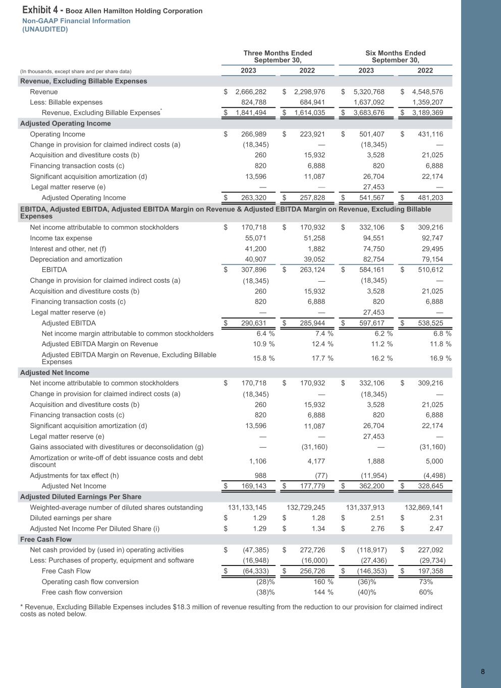 Exhibit 4 - Booz Allen Hamilton Holding Corporation Non-GAAP Financial Information (UNAUDITED) 8 Three Months Ended September 30, Six Months Ended September 30, (In thousands, except share and per share data) 2023 2022 2023 2022 Revenue, Excluding Billable Expenses Revenue $ 2,666,282 $ 2,298,976 $ 5,320,768 $ 4,548,576 Less: Billable expenses 824,788 684,941 1,637,092 1,359,207 Revenue, Excluding Billable Expenses* $ 1,841,494 $ 1,614,035 $ 3,683,676 $ 3,189,369 Adjusted Operating Income Operating Income $ 266,989 $ 223,921 $ 501,407 $ 431,116 Change in provision for claimed indirect costs (a) (18,345) — (18,345) — Acquisition and divestiture costs (b) 260 15,932 3,528 21,025 Financing transaction costs (c) 820 6,888 820 6,888 Significant acquisition amortization (d) 13,596 11,087 26,704 22,174 Legal matter reserve (e) — — 27,453 — Adjusted Operating Income $ 263,320 $ 257,828 $ 541,567 $ 481,203 EBITDA, Adjusted EBITDA, Adjusted EBITDA Margin on Revenue & Adjusted EBITDA Margin on Revenue, Excluding Billable Expenses Net income attributable to common stockholders $ 170,718 $ 170,932 $ 332,106 $ 309,216 Income tax expense 55,071 51,258 94,551 92,747 Interest and other, net (f) 41,200 1,882 74,750 29,495 Depreciation and amortization 40,907 39,052 82,754 79,154 EBITDA $ 307,896 $ 263,124 $ 584,161 $ 510,612 Change in provision for claimed indirect costs (a) (18,345) — (18,345) — Acquisition and divestiture costs (b) 260 15,932 3,528 21,025 Financing transaction costs (c) 820 6,888 820 6,888 Legal matter reserve (e) — — 27,453 — Adjusted EBITDA $ 290,631 $ 285,944 $ 597,617 $ 538,525 Net income margin attributable to common stockholders 6.4 % 7.4 % 6.2 % 6.8 % Adjusted EBITDA Margin on Revenue 10.9 % 12.4 % 11.2 % 11.8 % Adjusted EBITDA Margin on Revenue, Excluding Billable Expenses 15.8 % 17.7 % 16.2 % 16.9 % Adjusted Net Income Net income attributable to common stockholders $ 170,718 $ 170,932 $ 332,106 $ 309,216 Change in provision for claimed indirect costs (a) (18,345) — (18,345) — Acquisition and divestiture costs (b) 260 15,932 3,528 21,025 Financing transaction costs (c) 820 6,888 820 6,888 Significant acquisition amortization (d) 13,596 11,087 26,704 22,174 Legal matter reserve (e) — — 27,453 — Gains associated with divestitures or deconsolidation (g) — (31,160) — (31,160) Amortization or write-off of debt issuance costs and debt discount 1,106 4,177 1,888 5,000 Adjustments for tax effect (h) 988 (77) (11,954) (4,498) Adjusted Net Income $ 169,143 $ 177,779 $ 362,200 $ 328,645 Adjusted Diluted Earnings Per Share Weighted-average number of diluted shares outstanding 131,133,145 132,729,245 131,337,913 132,869,141 Diluted earnings per share $ 1.29 $ 1.28 $ 2.51 $ 2.31 Adjusted Net Income Per Diluted Share (i) $ 1.29 $ 1.34 $ 2.76 $ 2.47 Free Cash Flow Net cash provided by (used in) operating activities $ (47,385) $ 272,726 $ (118,917) $ 227,092 Less: Purchases of property, equipment and software (16,948) (16,000) (27,436) (29,734) Free Cash Flow $ (64,333) $ 256,726 $ (146,353) $ 197,358 Operating cash flow conversion (28) % 160 % (36)% 73% Free cash flow conversion (38) % 144 % (40)% 60% * Revenue, Excluding Billable Expenses includes $18.3 million of revenue resulting from the reduction to our provision for claimed indirect costs as noted below. 8