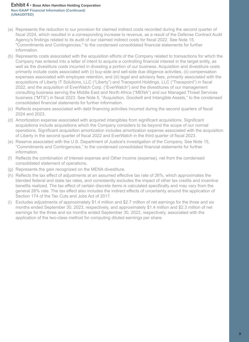 Exhibit 4 - Booz Allen Hamilton Holding Corporation Non-GAAP Financial Information (Continued) (UNAUDITED) 99 (a) Represents the reduction to our provision for claimed indirect costs recorded during the second quarter of fiscal 2024, which resulted in a corresponding increase to revenue, as a result of the Defense Contract Audit Agency's findings related to its audit of our claimed indirect costs for fiscal 2022. See Note 15, "Commitments and Contingencies," to the condensed consolidated financial statements for further information. (b) Represents costs associated with the acquisition efforts of the Company related to transactions for which the Company has entered into a letter of intent to acquire a controlling financial interest in the target entity, as well as the divestiture costs incurred in divesting a portion of our business. Acquisition and divestiture costs primarily include costs associated with (i) buy-side and sell-side due diligence activities, (ii) compensation expenses associated with employee retention, and (iii) legal and advisory fees, primarily associated with the acquisitions of Liberty IT Solutions, LLC (“Liberty”) and Tracepoint Holdings, LLC (“Tracepoint”) in fiscal 2022, and the acquisition of EverWatch Corp. (“EverWatch”) and the divestitures of our management consulting business serving the Middle East and North Africa (“MENA”) and our Managed Threat Services business (“MTS”) in fiscal 2023. See Note 5, “Acquisition, Goodwill and Intangible Assets,” to the condensed consolidated financial statements for further information. (c) Reflects expenses associated with debt financing activities incurred during the second quarters of fiscal 2024 and 2023. (d) Amortization expense associated with acquired intangibles from significant acquisitions. Significant acquisitions include acquisitions which the Company considers to be beyond the scope of our normal operations. Significant acquisition amortization includes amortization expense associated with the acquisition of Liberty in the second quarter of fiscal 2022 and EverWatch in the third quarter of fiscal 2023. (e) Reserve associated with the U.S. Department of Justice's investigation of the Company. See Note 15, “Commitments and Contingencies,” to the condensed consolidated financial statements for further information. (f) Reflects the combination of Interest expense and Other income (expense), net from the condensed consolidated statement of operations. (g) Represents the gain recognized on the MENA divestiture. (h) Reflects the tax effect of adjustments at an assumed effective tax rate of 26%, which approximates the blended federal and state tax rates, and consistently excludes the impact of other tax credits and incentive benefits realized. The tax effect of certain discrete items is calculated specifically and may vary from the general 26% rate. The tax effect also includes the indirect effects of uncertainty around the application of Section 174 of the Tax Cuts and Jobs Act of 2017. (i) Excludes adjustments of approximately $1.4 million and $2.7 million of net earnings for the three and six months ended September 30, 2023, respectively, and approximately $1.4 million and $2.3 million of net earnings for the three and six months ended September 30, 2022, respectively, associated with the application of the two-class method for computing diluted earnings per share.