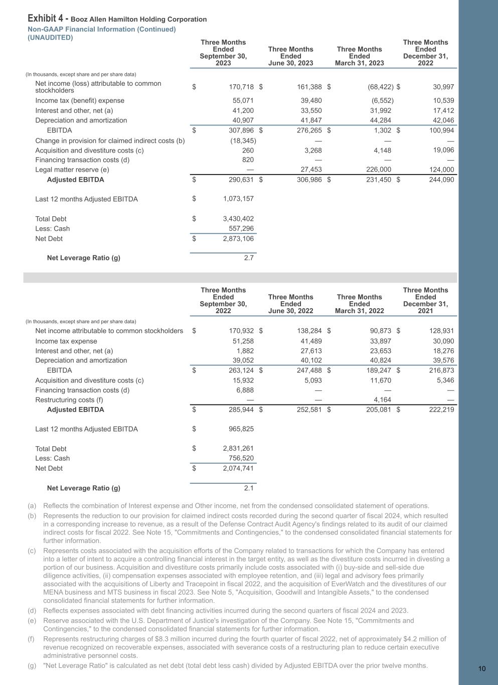 Exhibit 4 - Booz Allen Hamilton Holding Corporation Non-GAAP Financial Information (Continued) (UNAUDITED) 1 0 Three Months Ended September 30, 2023 Three Months Ended June 30, 2023 Three Months Ended March 31, 2023 Three Months Ended December 31, 2022 (In thousands, except share and per share data) Net income (loss) attributable to common stockholders $ 170,718 $ 161,388 $ (68,422) $ 30,997 Income tax (benefit) expense 55,071 39,480 (6,552) 10,539 Interest and other, net (a) 41,200 33,550 31,992 17,412 Depreciation and amortization 40,907 41,847 44,284 42,046 EBITDA $ 307,896 $ 276,265 $ 1,302 $ 100,994 Change in provision for claimed indirect costs (b) (18,345) — — — Acquisition and divestiture costs (c) 260 3,268 4,148 19,096 Financing transaction costs (d) 820 — — — Legal matter reserve (e) — 27,453 226,000 124,000 Adjusted EBITDA $ 290,631 $ 306,986 $ 231,450 $ 244,090 Last 12 months Adjusted EBITDA $ 1,073,157 Total Debt $ 3,430,402 Less: Cash 557,296 Net Debt $ 2,873,106 Net Leverage Ratio (g) 2.7 Three Months Ended September 30, 2022 Three Months Ended June 30, 2022 Three Months Ended March 31, 2022 Three Months Ended December 31, 2021 (In thousands, except share and per share data) Net income attributable to common stockholders $ 170,932 $ 138,284 $ 90,873 $ 128,931 Income tax expense 51,258 41,489 33,897 30,090 Interest and other, net (a) 1,882 27,613 23,653 18,276 Depreciation and amortization 39,052 40,102 40,824 39,576 EBITDA $ 263,124 $ 247,488 $ 189,247 $ 216,873 Acquisition and divestiture costs (c) 15,932 5,093 11,670 5,346 Financing transaction costs (d) 6,888 — — — Restructuring costs (f) — — 4,164 — Adjusted EBITDA $ 285,944 $ 252,581 $ 205,081 $ 222,219 Last 12 months Adjusted EBITDA $ 965,825 Total Debt $ 2,831,261 Less: Cash 756,520 Net Debt $ 2,074,741 Net Leverage Ratio (g) 2.1 10 (a) Reflects the combination of Interest expense and Other income, net from the condensed consolidated statement of operations. (b) Represents the reduction to our provision for claimed indirect costs recorded during the second quarter of fiscal 2024, which resulted in a corresponding increase to revenue, as a result of the Defense Contract Audit Agency's findings related to its audit of our claimed indirect costs for fiscal 2022. See Note 15, "Commitments and Contingencies," to the condensed consolidated financial statements for further information. (c) Represents costs associated with the acquisition efforts of the Company related to transactions for which the Company has entered into a letter of intent to acquire a controlling financial interest in the target entity, as well as the divestiture costs incurred in divesting a portion of our business. Acquisition and divestiture costs primarily include costs associated with (i) buy-side and sell-side due diligence activities, (ii) compensation expenses associated with employee retention, and (iii) legal and advisory fees primarily associated with the acquisitions of Liberty and Tracepoint in fiscal 2022, and the acquisition of EverWatch and the divestitures of our MENA business and MTS business in fiscal 2023. See Note 5, "Acquisition, Goodwill and Intangible Assets," to the condensed consolidated financial statements for further information. (d) Reflects expenses associated with debt financing activities incurred during the second quarters of fiscal 2024 and 2023. (e) Reserve associated with the U.S. Department of Justice's investigation of the Company. See Note 15, "Commitments and Contingencies," to the condensed consolidated financial statements for further information. (f) Represents restructuring charges of $8.3 million incurred during the fourth quarter of fiscal 2022, net of approximately $4.2 million of revenue recognized on recoverable expenses, associated with severance costs of a restructuring plan to reduce certain executive administrative personnel costs. (g) "Net Leverage Ratio" is calculated as net debt (total debt less cash) divided by Adjusted EBITDA over the prior twelve months.