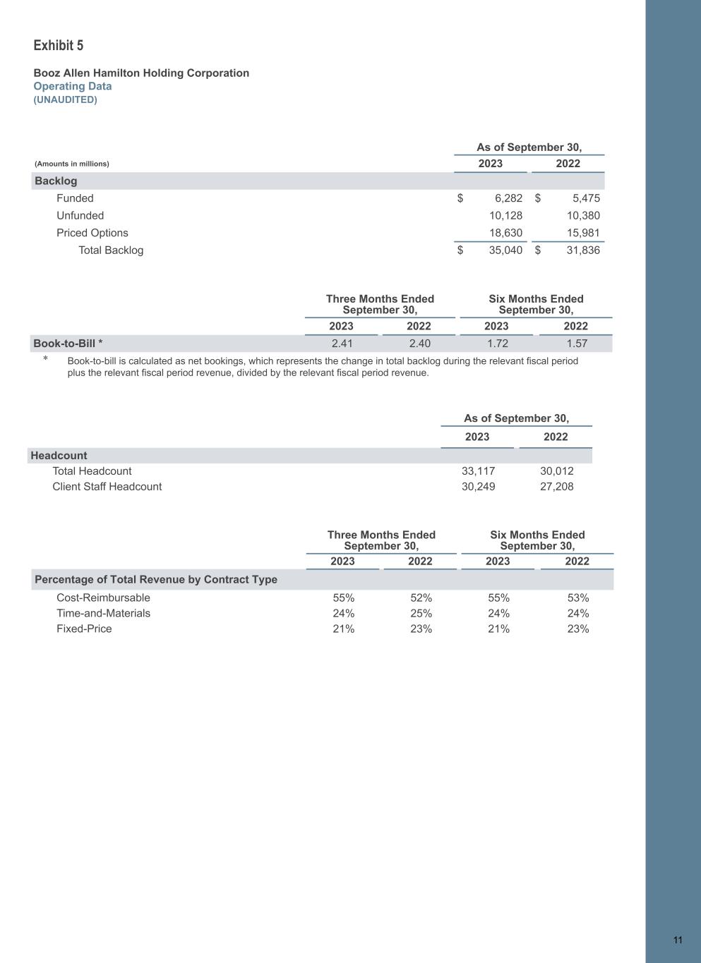 1 1 Exhibit 5 Booz Allen Hamilton Holding Corporation Operating Data (UNAUDITED) As of September 30, (Amounts in millions) 2023 2022 Backlog Funded $ 6,282 $ 5,475 Unfunded 10,128 10,380 Priced Options 18,630 15,981 Total Backlog $ 35,040 $ 31,836 Three Months Ended September 30, Six Months Ended September 30, 2023 2022 2023 2022 Book-to-Bill * 2.41 2.40 1.72 1.57 * Book-to-bill is calculated as net bookings, which represents the change in total backlog during the relevant fiscal period plus the relevant fiscal period revenue, divided by the relevant fiscal period revenue. As of September 30, 2023 2022 Headcount Total Headcount 33,117 30,012 Client Staff Headcount 30,249 27,208 Three Months Ended September 30, Six Months Ended September 30, 2023 2022 2023 2022 Percentage of Total Revenue by Contract Type Cost-Reimbursable 55% 52% 55% 53% Time-and-Materials 24% 25% 24% 24% Fixed-Price 21% 23% 21% 23% 11