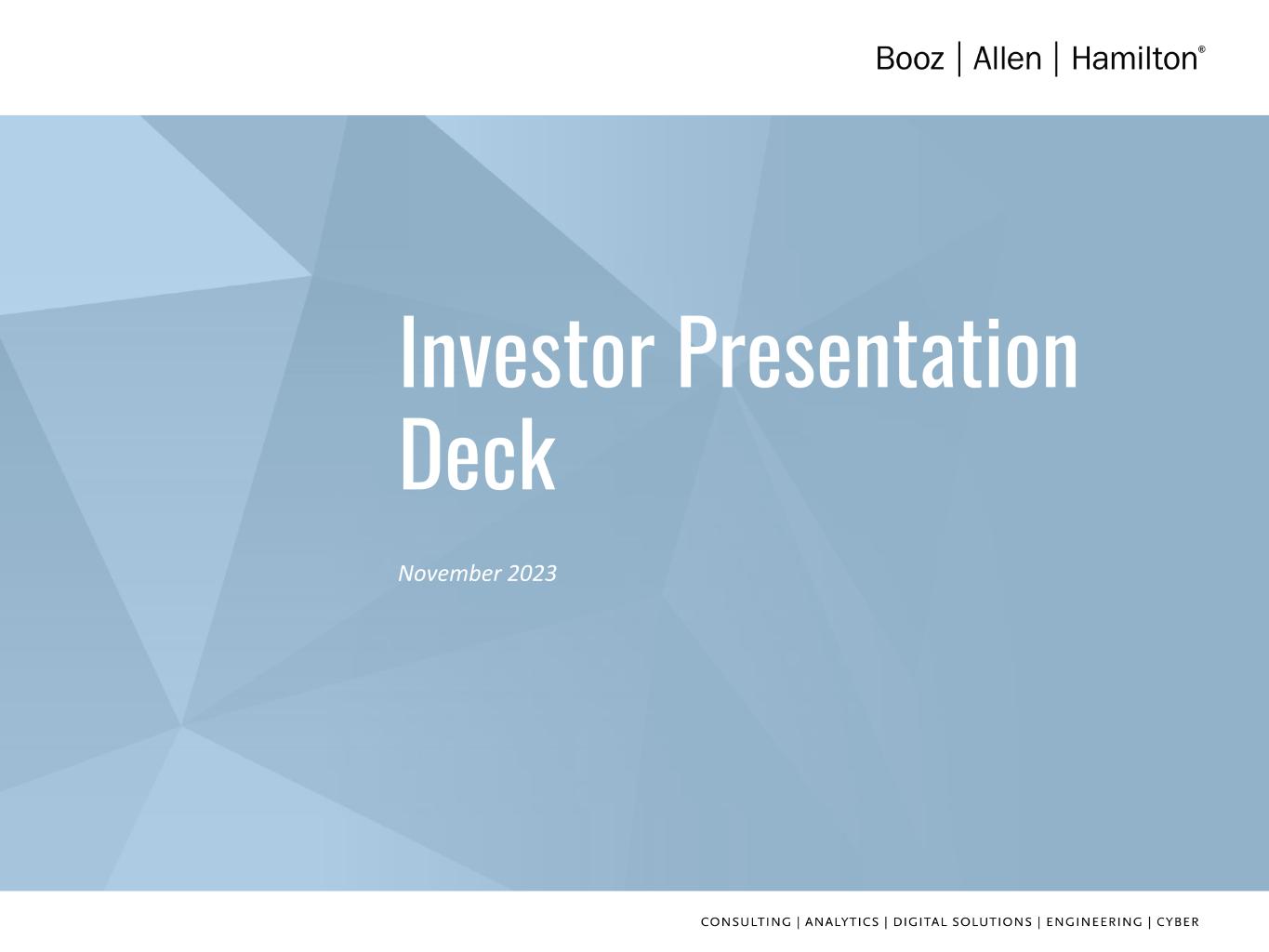 2 DISCLAIMER Forward Looking Safe Harbor Statement Certain statements contained in this presentation and in related comments by our management include “forward-looking statements” within the meaning of the Private Securities Litigation Reform Act of 1995. Examples of forward-looking statements include information concerning Booz Allen’s preliminary financial results, financial outlook and guidance, including forecasted revenue, Adjusted EBITDA, Diluted EPS, Adjusted Diluted EPS, future quarterly dividends, and future improvements in operating margins, as well as any other statement that does not directly relate to any historical or current fact. In some cases, you can identify forward-looking statements by terminology such as “may,” “will,” “could,” “should,” “forecasts,” “expects,” “intends,” “plans,” “anticipates,” “projects,” “outlook,” “believes,” “estimates,” “predicts,” “potential,” “continue,” “preliminary,” or the negative of these terms or other comparable terminology. Although we believe that the expectations reflected in the forward-looking statements are reasonable, we can give you no assurance these expectations will prove to have been correct. These forward-looking statements relate to future events or our future financial performance and involve known and unknown risks, uncertainties and other factors that may cause our actual results, levels of activity, performance or achievements to differ materially from any future results, levels of activity, performance or achievements expressed or implied by these forward-looking statements. A number of important factors could cause actual results to differ materially from those contained in or implied by these forward- looking statements, including those factors discussed in our filings with the Securities and Exchange Commission (SEC), including our Annual Report on Form 10-K for the fiscal year ended March 31, 2023, which can be found at the SEC’s website at www.sec.gov. All forward-looking statements attributable to us or persons acting on our behalf are expressly qualified in their entirety by the foregoing cautionary statements. All such statements speak only as of the date made and, except as required by law, we undertake no obligation to update or revise publicly any forward-looking statements, whether as a result of new information, future events or otherwise. Note Regarding Non-GAAP Financial Data Information Booz Allen discloses Revenue, Excluding Billable Expenses, Organic Revenue, Adjusted Operating Income, Adjusted EBITDA, Adjusted EBITDA Margin on Revenue, Adjusted EBITDA Margin on Revenue, Excluding Billable Expenses, Adjusted Net Income, Adjusted Diluted EPS, Free Cash Flow, and Free Cash Flow Conversion, which are not recognized measurements under accounting principles generally accepted in the United States, or GAAP, and when analyzing Booz Allen’s performance or liquidity, as applicable, investors should (i) evaluate each adjustment in our reconciliation of revenue to Revenue, Excluding Billable Expenses, and Organic Revenue, operating income to Adjusted Operating Income, net income attributable to common stockholders to Adjusted EBITDA, Adjusted EBITDA Margin on Revenue, Adjusted EBITDA Margin on Revenue, Excluding Billable Expenses, Adjusted Net Income and Adjusted Diluted EPS, and net cash used in operating activities to Free Cash Flow and Free Cash Flow Conversion, and the explanatory footnotes regarding those adjustments, each as defined under GAAP, (ii) use Revenue, Excluding Billable Expenses, Organic Revenue, Adjusted Operating Income, Adjusted EBITDA, Adjusted EBITDA Margin on Revenue, Adjusted EBITDA Margin on Revenue Excluding Billable Expenses, Adjusted Net Income, and Adjusted Diluted EPS in addition to, and not as an alternative to, revenue, operating income, net income attributable to common stockholders or diluted EPS as measures of operating results, each as defined under GAAP, and (iii) use Free Cash Flow, and Free Cash Flow Conversion, in addition to, and not as an alternative to, net cash used in operating activities as a measure of liquidity, each as defined under GAAP. The Appendix includes a reconciliation of Revenue, Excluding Billable Expenses, Organic Revenue, Adjusted Operating Income, Adjusted EBITDA, Adjusted EBITDA Margin on Revenue, Adjusted EBITDA Margin on Revenue, Excluding Billable Expenses, Adjusted Net Income, Adjusted Diluted EPS, Free Cash Flow, and Free Cash Flow Conversion, to the most directly comparable financial measure calculated and presented in accordance with GAAP. Booz Allen presents these supplemental performance measures because it believes that these measures provide investors and securities analysts with important supplemental information with which to evaluate Booz Allen’s performance, long term earnings potential, or liquidity, as applicable, and to enable them to assess Booz Allen’s performance on the same basis as management. These supplemental performance and liquidity measurements may vary from and may not be comparable to similarly titled measures by other companies in Booz Allen’s industry. With respect to our expectations under “Financial Outlook,” reconciliation of Adjusted Diluted EPS guidance, Adjusted EBITDA, and Adjusted EBITDA Margin on Revenue to the closest corresponding GAAP measure is not available without unreasonable efforts on a forward-looking basis due to our inability to predict our stock price, equity grants and dividend declarations with respect to Adjusted Diluted EPS, and our net income, net interest and other expenses with respect to Adjusted EBITDA and Adjusted EBITDA Margin on Revenue, during the course of fiscal 2024. With respect to Adjusted Diluted EPS guidance, projecting future stock price, equity grants and dividends to be declared would be necessary to accurately calculate the difference between Adjusted Diluted EPS and GAAP EPS as a re