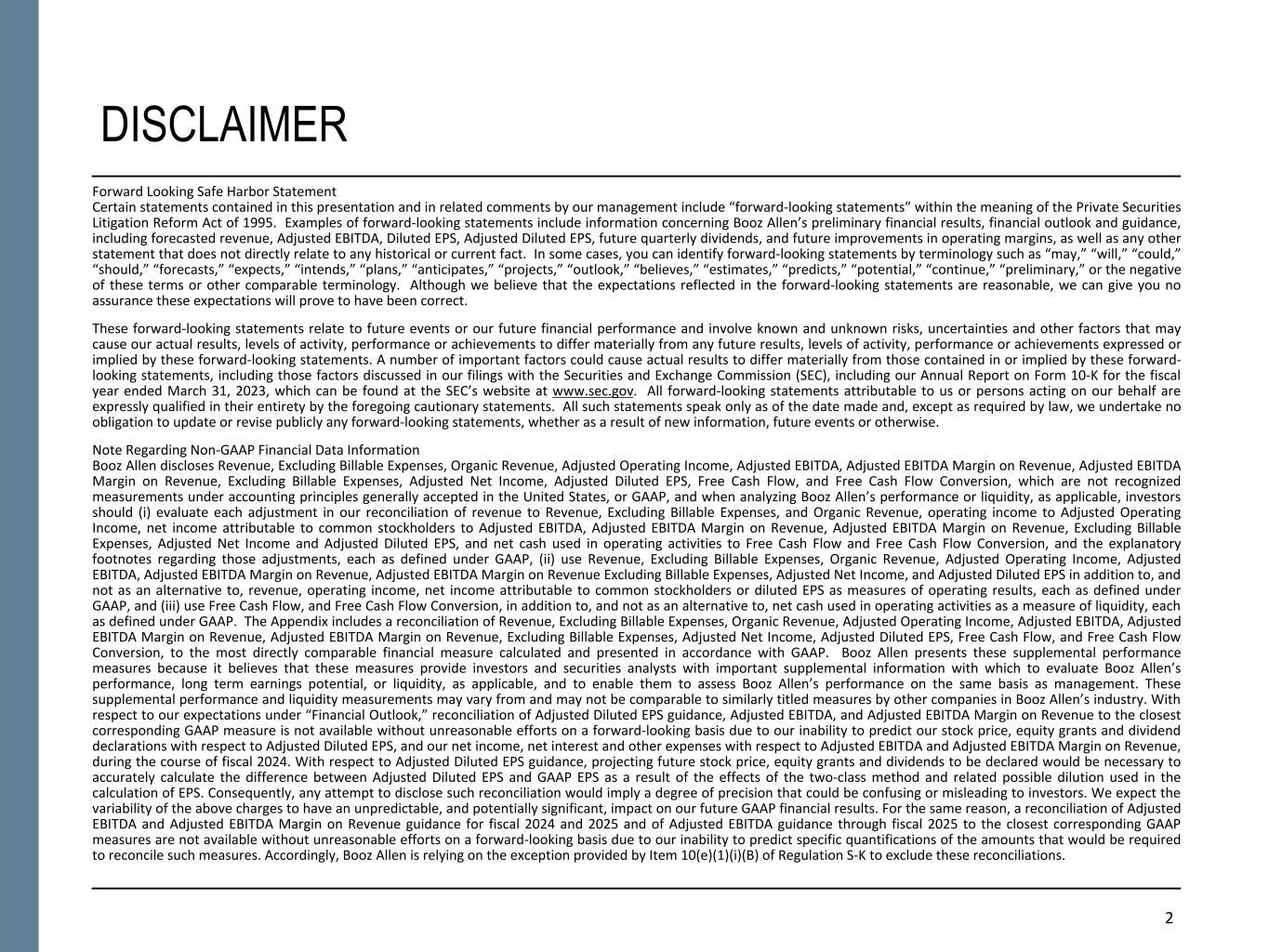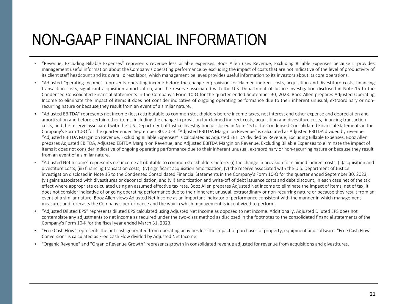 21 NON-GAAP FINANCIAL INFORMATION • “Revenue, Excluding Billable Expenses” represents revenue less billable expenses. Booz Allen uses Revenue, Excluding Billable Expenses because it provides management useful information about the Company’s operating performance by excluding the impact of costs that are not indicative of the level of productivity of its client staff headcount and its overall direct labor, which management believes provides useful information to its investors about its core operations. • “Adjusted Operating Income” represents operating income before the change in provision for claimed indirect costs, acquisition and divestiture costs, financing transaction costs, significant acquisition amortization, and the reserve associated with the U.S. Department of Justice investigation disclosed in Note 15 to the Condensed Consolidated Financial Statements in the Company's Form 10-Q for the quarter ended September 30, 2023. Booz Allen prepares Adjusted Operating Income to eliminate the impact of items it does not consider indicative of ongoing operating performance due to their inherent unusual, extraordinary or non- recurring nature or because they result from an event of a similar nature. • “Adjusted EBITDA” represents net income (loss) attributable to common stockholders before income taxes, net interest and other expense and depreciation and amortization and before certain other items, including the change in provision for claimed indirect costs, acquisition and divestiture costs, financing transaction costs, and the reserve associated with the U.S. Department of Justice investigation disclosed in Note 15 to the Condensed Consolidated Financial Statements in the Company's Form 10-Q for the quarter ended September 30, 2023. “Adjusted EBITDA Margin on Revenue” is calculated as Adjusted EBITDA divided by revenue. “Adjusted EBITDA Margin on Revenue, Excluding Billable Expenses” is calculated as Adjusted EBITDA divided by Revenue, Excluding Billable Expenses. Booz Allen prepares Adjusted EBITDA, Adjusted EBITDA Margin on Revenue, and Adjusted EBITDA Margin on Revenue, Excluding Billable Expenses to eliminate the impact of items it does not consider indicative of ongoing operating performance due to their inherent unusual, extraordinary or non-recurring nature or because they result from an event of a similar nature. • “Adjusted Net Income” represents net income attributable to common stockholders before: (i) the change in provision for claimed indirect costs, (ii)acquisition and divestiture costs, (iii) financing transaction costs, (iv) significant acquisition amortization, (v) the reserve associated with the U.S. Department of Justice investigation disclosed in Note 15 to the Condensed Consolidated Financial Statements in the Company's Form 10-Q for the quarter ended September 30, 2023, (vi) gains associated with divestitures or deconsolidation, and (vii) amortization and write-off of debt issuance costs and debt discount, in each case net of the tax effect where appropriate calculated using an assumed effective tax rate. Booz Allen prepares Adjusted Net Income to eliminate the impact of items, net of tax, it does not consider indicative of ongoing operating performance due to their inherent unusual, extraordinary or non-recurring nature or because they result from an event of a similar nature. Booz Allen views Adjusted Net Income as an important indicator of performance consistent with the manner in which management measures and forecasts the Company's performance and the way in which management is incentivized to perform. • “Adjusted Diluted EPS” represents diluted EPS calculated using Adjusted Net Income as opposed to net income. Additionally, Adjusted Diluted EPS does not contemplate any adjustments to net income as required under the two-class method as disclosed in the footnotes to the consolidated financial statements of the Company's Form 10-K for the fiscal year ended March 31, 2023. • "Free Cash Flow" represents the net cash generated from operating activities less the impact of purchases of property, equipment and software. "Free Cash Flow Conversion" is calculated as Free Cash Flow divided by Adjusted Net Income. • "Organic Revenue" and "Organic Revenue Growth" represents growth in consolidated revenue adjusted for revenue from acquisitions and divestitures.