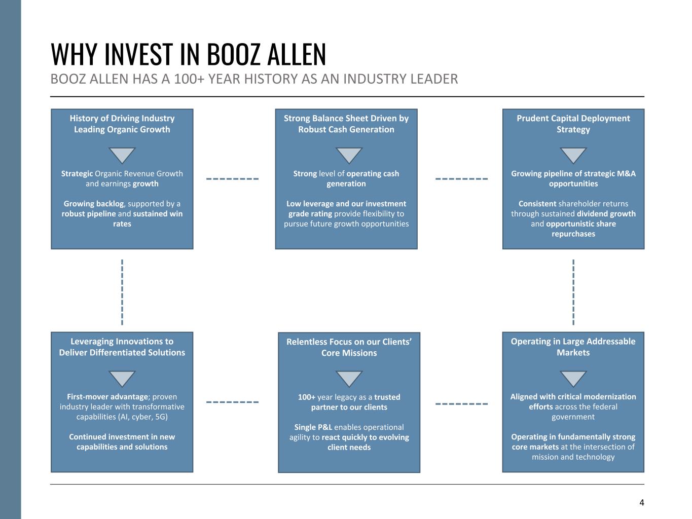 3 20171966 COMPANY HISTORY OUR HERITAGE IS AT THE CORE OF EVERYTHING WE DO 1914 Booz Allen founded in 1914 by Edwin Booz in Chicago With over 100 years of industry leadership, Booz Allen is one of the most respected names in government contracting Hired to help U.S. Navy prepare for WWII Spun off commercial consulting business; Carlyle became majority shareholder Acquired Aquilent, Inc., a digital services business Launched Vision 2020 Strategy—transforming the company from a consulting firm to a leading solutions provider 1940 2010 2013 2016 2017 Initial Public Offering Acquired Defense Systems Engineering & Support 2008 Carlyle completed ownership exit Acquired Liberty IT Solutions Awarded $1.1B BID contract by the VA Acquired Tracepoint Holdings Launched VoLT– new firmwide growth strategy 2021 Acquired EverWatch Corporation Divested MENA management consulting business and Managed Threat Services (MTS) business Awarded $1.5B eMAPS2 contract—single largest TO in Company’s history 2022 2023 Awarded $1.9B Thunderdome contract