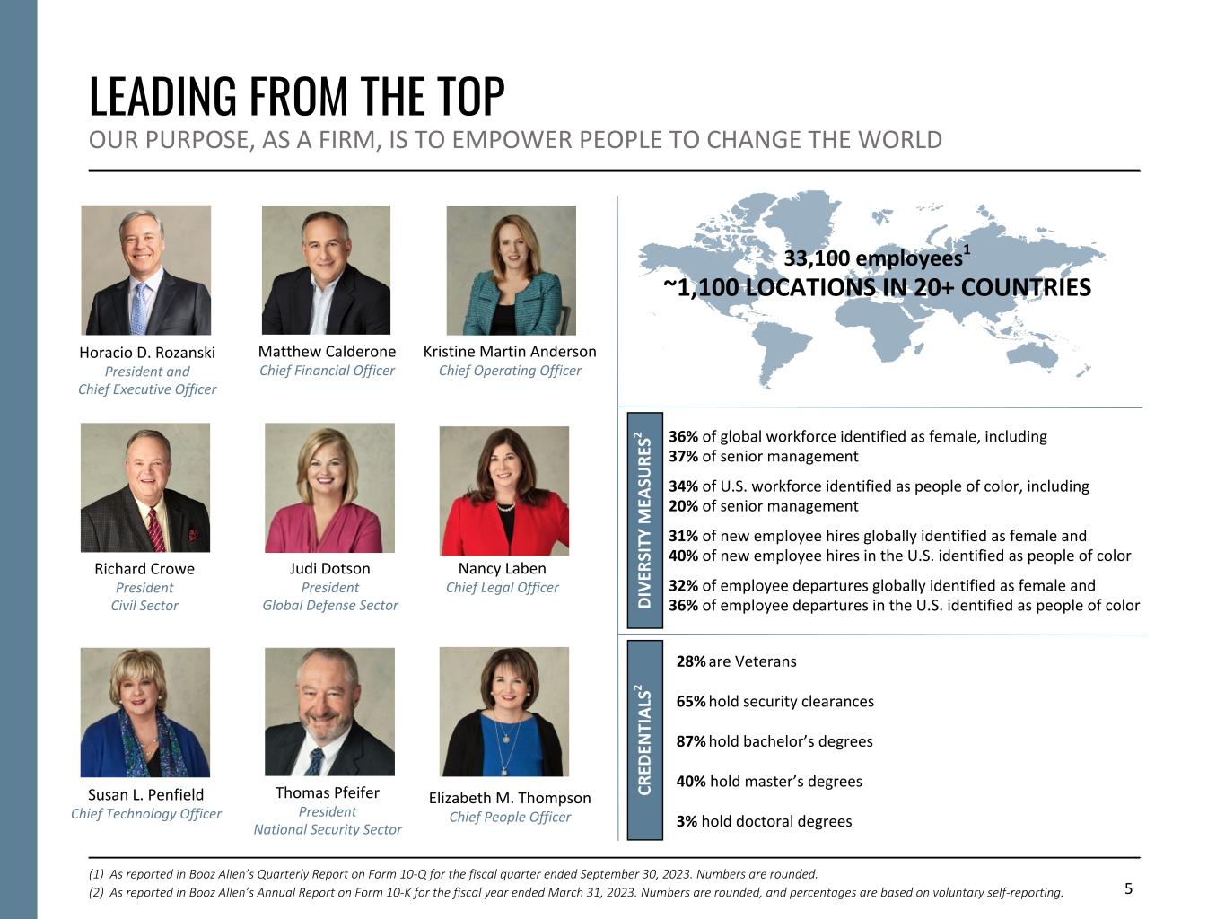 5 LEADING FROM THE TOP OUR PURPOSE, AS A FIRM, IS TO EMPOWER PEOPLE TO CHANGE THE WORLD 33,100 employees1 ~1,100 LOCATIONS IN 20+ COUNTRIES 28% are Veterans 65% hold security clearances 87% hold bachelor’s degrees 40% hold master’s degrees 3% hold doctoral degrees D IV ER SI TY M EA SU RE S2 CR ED EN TI A LS 2 36% of global workforce identified as female, including 37% of senior management 34% of U.S. workforce identified as people of color, including 20% of senior management 31% of new employee hires globally identified as female and 40% of new employee hires in the U.S. identified as people of color 32% of employee departures globally identified as female and 36% of employee departures in the U.S. identified as people of color Horacio D. Rozanski President and Chief Executive Officer Matthew Calderone Chief Financial Officer Kristine Martin Anderson Chief Operating Officer Elizabeth M. Thompson Chief People Officer Thomas Pfeifer President National Security Sector Judi Dotson President Global Defense Sector Richard Crowe President Civil Sector Nancy Laben Chief Legal Officer Susan L. Penfield Chief Technology Officer (1) As reported in Booz Allen’s Quarterly Report on Form 10-Q for the fiscal quarter ended September 30, 2023. Numbers are rounded. (2) As reported in Booz Allen’s Annual Report on Form 10-K for the fiscal year ended March 31, 2023. Numbers are rounded, and percentages are based on voluntary self-reporting.