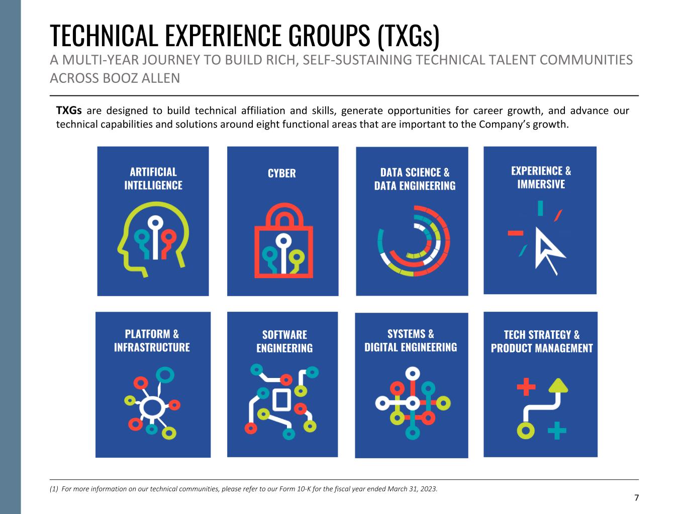 7 Justin Neroda (CTO) Scott Jachimski (GDS) PLATFORM & INFRASTRUCTURE Raynor Dahlquist (NSS) Jandria Alexander (GDS) Santiago Milan (CS) Cameron Mayer (GDS) Dan Tucker (CS) Dave Gagliano (GDC) Brian Zimmerman (GDS) Adam Weiner (GDS) Osama Malik (CS) Brian MacCarthy (CTO) ARTIFICIAL INTELLIGENCE CYBER DATA SCIENCE & DATA ENGINEERING EXPERIENCE & IMMERSIVE PLATFORM & INFRASTRUCTURE SOFTWARE ENGINEERING SYSTEMS & DIGITAL ENGINEERING TECH STRATEGY & PRODUCT MANAGEMENT TECHNICAL EXPERIENCE GROUPS (TXGs) A MULTI-YEAR JOURNEY TO BUILD RICH, SELF-SUSTAINING TECHNICAL TALENT COMMUNITIES ACROSS BOOZ ALLEN (1) For more information on our technical communities, please refer to our Form 10-K for the fiscal year ended March 31, 2023. TXGs are designed to build technical affiliation and skills, generate opportunities for career growth, and advance our technical capabilities and solutions around eight functional areas that are important to the Company’s growth.