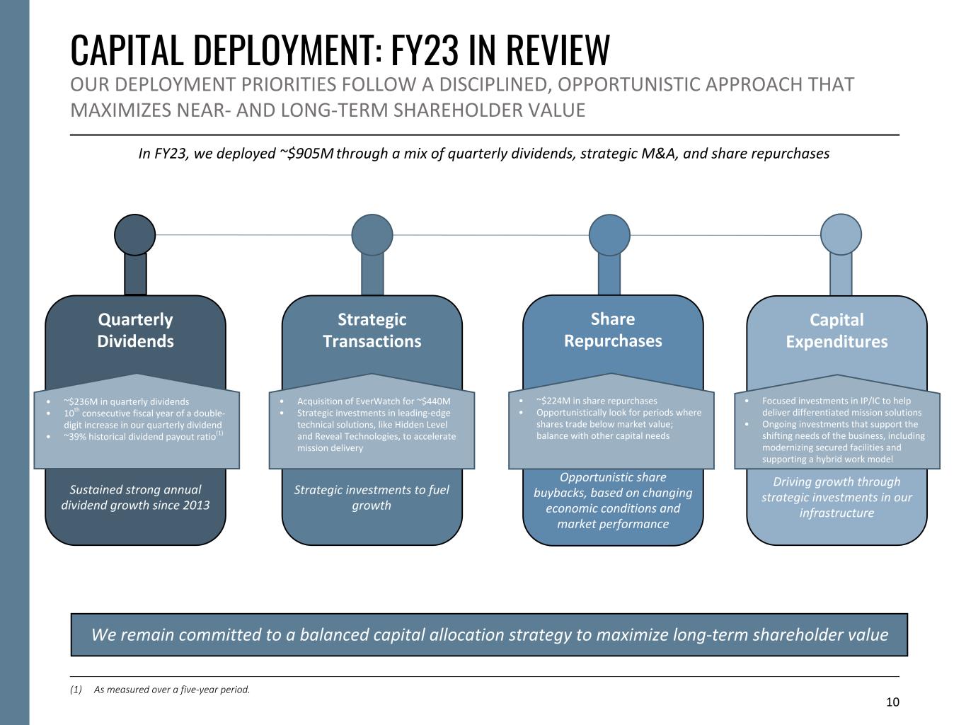 9 STRONG FINANCIAL RETURNS WE HAVE A PROVEN TRACK RECORD OF STRONG FINANCIAL PERFORMANCE Delivering Industry-Leading Organic Growth ($ in billions) Sustained Adjusted EBITDA & Margin Expansion ($ in millions) Organic Revenue Growth(1)(2) Strong Cash Flow Generation ($ in millions) Significant Capital Deployment ($ in millions)(3) (1) Organic revenue of $6.0 billion as of March 31, 2018 is calculated as $6.2 billion of consolidated revenue less revenue from acquisitions of approximately $140 million. (2) Organic revenue of $9.1 billion as of March 31, 2023 is calculated as $9.3 billion of consolidated revenue less revenue from acquisitions of approximately $185 million. (3) As reported in our Forms 10-K for fiscal years ended March 31, 2019, 2020, 2021, 2022 and 2023; totals may not sum due to rounding. (4) A reconciliation of non-GAAP financial measures can be found in the Appendix. 11.7% CAGR ($) +150 bps (%) Adjusted EBITDA(3)(4) Adjusted EBITDA Margin(3)(4) Operating Cash Flow(3)(4) Free Cash Flow Conversion(3)(4) $364 $333 $571 $1,494 $905 114.2 146.6 181.1 209.1 235.7 250.0 186.6 318.1 419.3 224.0 72.2 865.5 445.3 Quarterly Dividends Share Repurchases M&A FY19 FY20 FY21 FY22 FY23 $499.6 $551.4 $718.7 $736.5 $602.8 103% 94% 117% 116% 87% FY19 FY20 FY21 FY22 FY23 $6.0 $9.1 FY18 FY23 8.5% CAGR $584 $1,014 9.5% 11.0% FY18 FY23