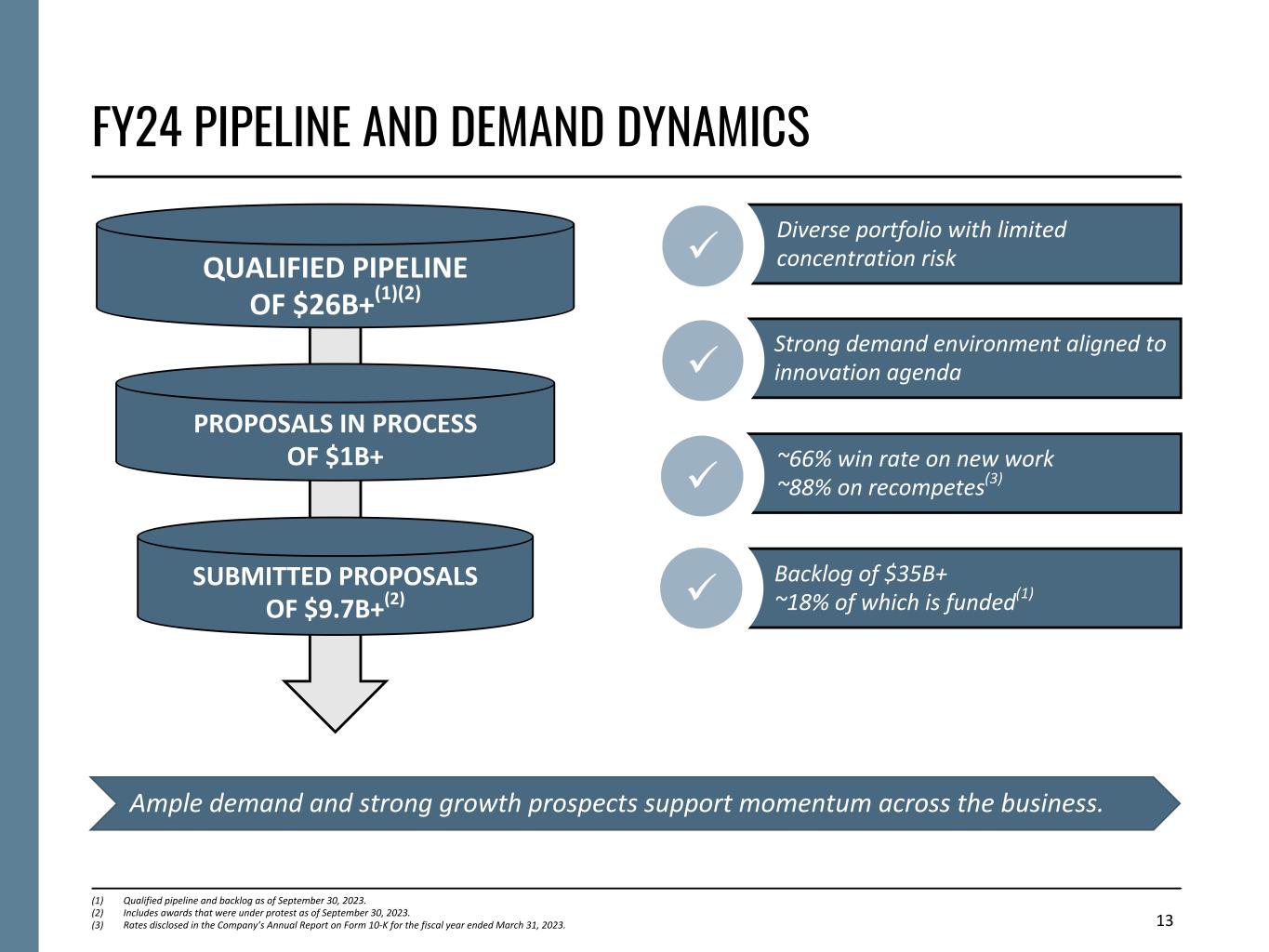 12 STRONG BACKLOG AND CONTRACT-LEVEL PERFORMANCE DEMONSTRATES THE STRENGTH OF OUR VALUE PROPOSITION AND CORE CAPABILITIES Historical Backlog(1)(2) ($ in millions) (1) As reported in our Forms 10-K for the fiscal years ended March 31, 2019, 2020, 2021, 2022 and 2023. (2) Backlog presented as of March 31, 2023; includes backlog acquired from acquisitions made during fiscal 2023, which was approximately $282 million as of March 31, 2023. Historical Book-to-Bill LTM Book-to-Bill Ratios 1.49 1.19 1.42 1.36 1.18 FY19 FY20 FY21 FY22 FY23 19,321 20,729 24,032 29,247 31,202 3,436 3,415 3,510 3,710 4,619 3,687 4,518 6,086 9,925 9,519 12,198 12,796 14,436 15,612 17,064 Funded Unfunded Priced Options FY19 FY20 FY21 FY22 FY23