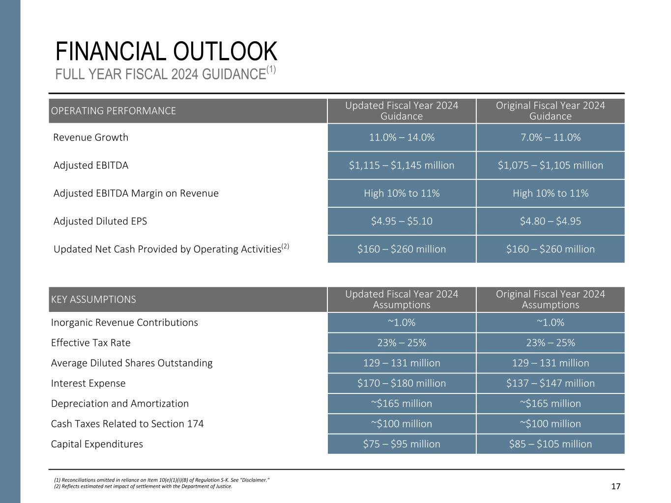 17 FINANCIAL OUTLOOK FULL YEAR FISCAL 2024 GUIDANCE(1) OPERATING PERFORMANCE Updated Fiscal Year 2024 Guidance Original Fiscal Year 2024 Guidance Revenue Growth 11.0% – 14.0% 7.0% – 11.0% Adjusted EBITDA $1,115 – $1,145 million $1,075 – $1,105 million Adjusted EBITDA Margin on Revenue High 10% to 11% High 10% to 11% Adjusted Diluted EPS $4.95 – $5.10 $4.80 – $4.95 Updated Net Cash Provided by Operating Activities(2) $160 – $260 million $160 – $260 million (1) Reconciliations omitted in reliance on Item 10(e)(1)(i)(B) of Regulation S-K. See "Disclaimer." (2) Reflects estimated net impact of settlement with the Department of Justice. KEY ASSUMPTIONS Updated Fiscal Year 2024 Assumptions Original Fiscal Year 2024 Assumptions Inorganic Revenue Contributions ~1.0% ~1.0% Effective Tax Rate 23% – 25% 23% – 25% Average Diluted Shares Outstanding 129 – 131 million 129 – 131 million Interest Expense $170 – $180 million $137 – $147 million Depreciation and Amortization ~$165 million ~$165 million Cash Taxes Related to Section 174 ~$100 million ~$100 million Capital Expenditures $75 – $95 million $85 – $105 million
