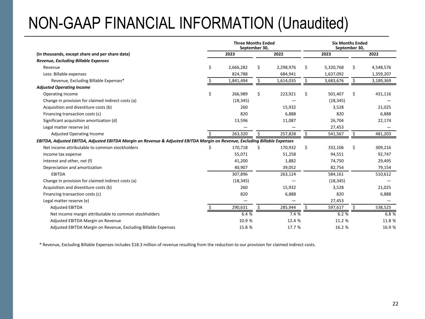 22 NON-GAAP FINANCIAL INFORMATION (Unaudited) Three Months Ended September 30, Six Months Ended September 30, (In thousands, except share and per share data) 2023 2022 2023 2022 Revenue, Excluding Billable Expenses Revenue $ 2,666,282 $ 2,298,976 $ 5,320,768 $ 4,548,576 Less: Billable expenses 824,788 684,941 1,637,092 1,359,207 Revenue, Excluding Billable Expenses* $ 1,841,494 $ 1,614,035 $ 3,683,676 $ 3,189,369 Adjusted Operating Income Operating Income $ 266,989 $ 223,921 $ 501,407 $ 431,116 Change in provision for claimed indirect costs (a) (18,345) — (18,345) — Acquisition and divestiture costs (b) 260 15,932 3,528 21,025 Financing transaction costs (c) 820 6,888 820 6,888 Significant acquisition amortization (d) 13,596 11,087 26,704 22,174 Legal matter reserve (e) — — 27,453 — Adjusted Operating Income $ 263,320 $ 257,828 $ 541,567 $ 481,203 EBITDA, Adjusted EBITDA, Adjusted EBITDA Margin on Revenue & Adjusted EBITDA Margin on Revenue, Excluding Billable Expenses Net income attributable to common stockholders $ 170,718 $ 170,932 $ 332,106 $ 309,216 Income tax expense 55,071 51,258 94,551 92,747 Interest and other, net (f) 41,200 1,882 74,750 29,495 Depreciation and amortization 40,907 39,052 82,754 79,154 EBITDA 307,896 263,124 584,161 510,612 Change in provision for claimed indirect costs (a) (18,345) — (18,345) — Acquisition and divestiture costs (b) 260 15,932 3,528 21,025 Financing transaction costs (c) 820 6,888 820 6,888 Legal matter reserve (e) — — 27,453 — Adjusted EBITDA $ 290,631 $ 285,944 $ 597,617 $ 538,525 Net income margin attributable to common stockholders 6.4 % 7.4 % 6.2 % 6.8 % Adjusted EBITDA Margin on Revenue 10.9 % 12.4 % 11.2 % 11.8 % Adjusted EBITDA Margin on Revenue, Excluding Billable Expenses 15.8 % 17.7 % 16.2 % 16.9 % 22 * Revenue, Excluding Billable Expenses includes $18.3 million of revenue resulting from the reduction to our provision for claimed indirect costs.