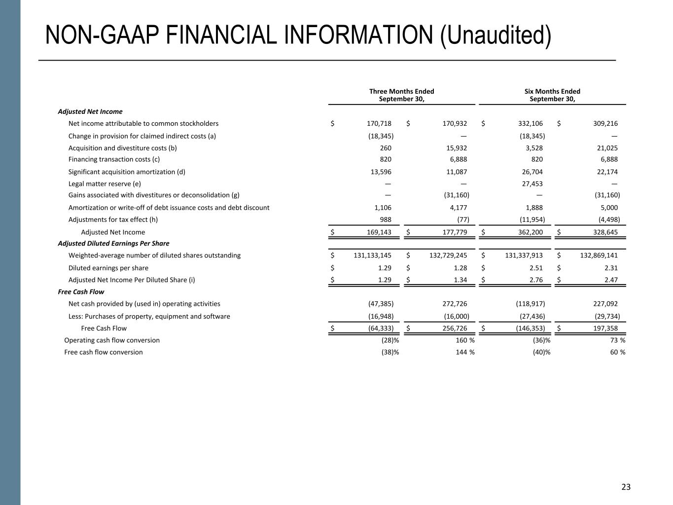 23 NON-GAAP FINANCIAL INFORMATION (Unaudited) Three Months Ended September 30, Six Months Ended September 30, Adjusted Net Income Net income attributable to common stockholders $ 170,718 $ 170,932 $ 332,106 $ 309,216 Change in provision for claimed indirect costs (a) (18,345) — (18,345) — Acquisition and divestiture costs (b) 260 15,932 3,528 21,025 Financing transaction costs (c) 820 6,888 820 6,888 Significant acquisition amortization (d) 13,596 11,087 26,704 22,174 Legal matter reserve (e) — — 27,453 — Gains associated with divestitures or deconsolidation (g) — (31,160) — (31,160) Amortization or write-off of debt issuance costs and debt discount 1,106 4,177 1,888 5,000 Adjustments for tax effect (h) 988 (77) (11,954) (4,498) Adjusted Net Income $ 169,143 $ 177,779 $ 362,200 $ 328,645 Adjusted Diluted Earnings Per Share Weighted-average number of diluted shares outstanding $ 131,133,145 $ 132,729,245 $ 131,337,913 $ 132,869,141 Diluted earnings per share $ 1.29 $ 1.28 $ 2.51 $ 2.31 Adjusted Net Income Per Diluted Share (i) $ 1.29 $ 1.34 $ 2.76 $ 2.47 Free Cash Flow Net cash provided by (used in) operating activities (47,385) 272,726 (118,917) 227,092 Less: Purchases of property, equipment and software (16,948) (16,000) (27,436) (29,734) Free Cash Flow $ (64,333) $ 256,726 $ (146,353) $ 197,358 Operating cash flow conversion (28) % 160 % (36) % 73 % Free cash flow conversion (38) % 144 % (40) % 60 % 23
