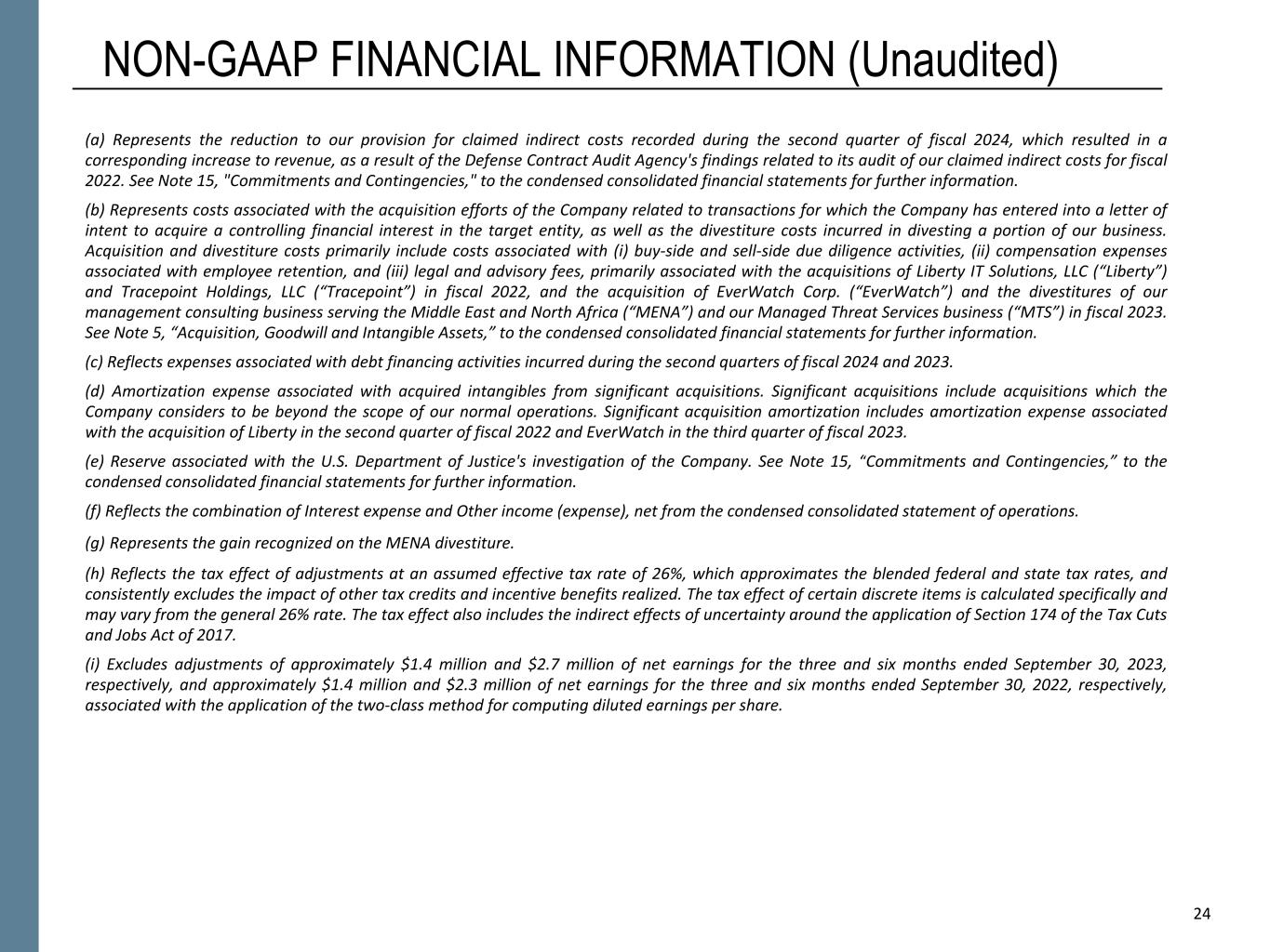 24 NON-GAAP FINANCIAL INFORMATION (Unaudited) (a) Represents the reduction to our provision for claimed indirect costs recorded during the second quarter of fiscal 2024, which resulted in a corresponding increase to revenue, as a result of the Defense Contract Audit Agency's findings related to its audit of our claimed indirect costs for fiscal 2022. See Note 15, "Commitments and Contingencies," to the condensed consolidated financial statements for further information. (b) Represents costs associated with the acquisition efforts of the Company related to transactions for which the Company has entered into a letter of intent to acquire a controlling financial interest in the target entity, as well as the divestiture costs incurred in divesting a portion of our business. Acquisition and divestiture costs primarily include costs associated with (i) buy-side and sell-side due diligence activities, (ii) compensation expenses associated with employee retention, and (iii) legal and advisory fees, primarily associated with the acquisitions of Liberty IT Solutions, LLC (“Liberty”) and Tracepoint Holdings, LLC (“Tracepoint”) in fiscal 2022, and the acquisition of EverWatch Corp. (“EverWatch”) and the divestitures of our management consulting business serving the Middle East and North Africa (“MENA”) and our Managed Threat Services business (“MTS”) in fiscal 2023. See Note 5, “Acquisition, Goodwill and Intangible Assets,” to the condensed consolidated financial statements for further information. (c) Reflects expenses associated with debt financing activities incurred during the second quarters of fiscal 2024 and 2023. (d) Amortization expense associated with acquired intangibles from significant acquisitions. Significant acquisitions include acquisitions which the Company considers to be beyond the scope of our normal operations. Significant acquisition amortization includes amortization expense associated with the acquisition of Liberty in the second quarter of fiscal 2022 and EverWatch in the third quarter of fiscal 2023. (e) Reserve associated with the U.S. Department of Justice's investigation of the Company. See Note 15, “Commitments and Contingencies,” to the condensed consolidated financial statements for further information. (f) Reflects the combination of Interest expense and Other income (expense), net from the condensed consolidated statement of operations. (g) Represents the gain recognized on the MENA divestiture. (h) Reflects the tax effect of adjustments at an assumed effective tax rate of 26%, which approximates the blended federal and state tax rates, and consistently excludes the impact of other tax credits and incentive benefits realized. The tax effect of certain discrete items is calculated specifically and may vary from the general 26% rate. The tax effect also includes the indirect effects of uncertainty around the application of Section 174 of the Tax Cuts and Jobs Act of 2017. (i) Excludes adjustments of approximately $1.4 million and $2.7 million of net earnings for the three and six months ended September 30, 2023, respectively, and approximately $1.4 million and $2.3 million of net earnings for the three and six months ended September 30, 2022, respectively, associated with the application of the two-class method for computing diluted earnings per share. 24