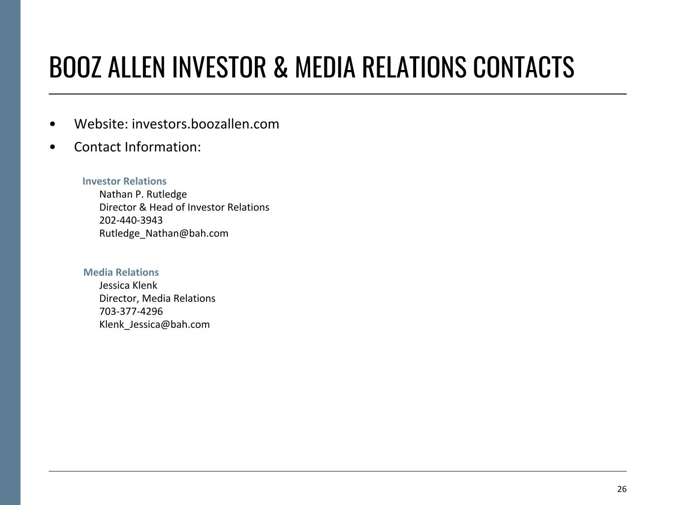 BOOZ ALLEN INVESTOR & MEDIA RELATIONS CONTACTS 26 • Website: investors.boozallen.com • Contact Information: Investor Relations Nathan P. Rutledge Director & Head of Investor Relations 202-440-3943 Rutledge_Nathan@bah.com Media Relations Jessica Klenk Director, Media Relations 703-377-4296 Klenk_Jessica@bah.com