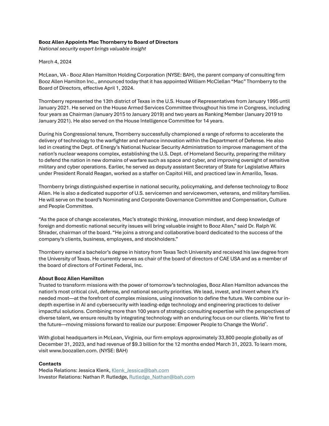 Booz Allen Appoints Mac Thornberry to Board of Directors National security expert brings valuable insight March 4, 2024 McLean, VA - Booz Allen Hamilton Holding Corporation (NYSE: BAH), the parent company of consulting firm Booz Allen Hamilton Inc., announced today that it has appointed William McClellan “Mac” Thornberry to the Board of Directors, eQective April 1, 2024. Thornberry represented the 13th district of Texas in the U.S. House of Representatives from January 1995 until January 2021. He served on the House Armed Services Committee throughout his time in Congress, including four years as Chairman (January 2015 to January 2019) and two years as Ranking Member (January 2019 to January 2021). He also served on the House Intelligence Committee for 14 years. During his Congressional tenure, Thornberry successfully championed a range of reforms to accelerate the delivery of technology to the warfighter and enhance innovation within the Department of Defense. He also led in creating the Dept. of Energy’s National Nuclear Security Administration to improve management of the nation’s nuclear weapons complex, establishing the U.S. Dept. of Homeland Security, preparing the military to defend the nation in new domains of warfare such as space and cyber, and improving oversight of sensitive military and cyber operations. Earlier, he served as deputy assistant Secretary of State for Legislative AQairs under President Ronald Reagan, worked as a staQer on Capitol Hill, and practiced law in Amarillo, Texas. Thornberry brings distinguished expertise in national security, policymaking, and defense technology to Booz Allen. He is also a dedicated supporter of U.S. servicemen and servicewomen, veterans, and military families. He will serve on the board’s Nominating and Corporate Governance Committee and Compensation, Culture and People Committee. “As the pace of change accelerates, Mac’s strategic thinking, innovation mindset, and deep knowledge of foreign and domestic national security issues will bring valuable insight to Booz Allen,” said Dr. Ralph W. Shrader, chairman of the board. “He joins a strong and collaborative board dedicated to the success of the company’s clients, business, employees, and stockholders.” Thornberry earned a bachelor’s degree in history from Texas Tech University and received his law degree from the University of Texas. He currently serves as chair of the board of directors of CAE USA and as a member of the board of directors of Fortinet Federal, Inc. About Booz Allen Hamilton Trusted to transform missions with the power of tomorrow’s technologies, Booz Allen Hamilton advances the nation’s most critical civil, defense, and national security priorities. We lead, invest, and invent where it’s needed most—at the forefront of complex missions, using innovation to define the future. We combine our in- depth expertise in AI and cybersecurity with leading-edge technology and engineering practices to deliver impactful solutions. Combining more than 100 years of strategic consulting expertise with the perspectives of diverse talent, we ensure results by integrating technology with an enduring focus on our clients. We’re first to the future—moving missions forward to realize our purpose: Empower People to Change the World®. With global headquarters in McLean, Virginia, our firm employs approximately 33,800 people globally as of December 31, 2023, and had revenue of $9.3 billion for the 12 months ended March 31, 2023. To learn more, visit www.boozallen.com. (NYSE: BAH) Contacts Media Relations: Jessica Klenk, Klenk_Jessica@bah.com Investor Relations: Nathan P. Rutledge, Rutledge_Nathan@bah.com